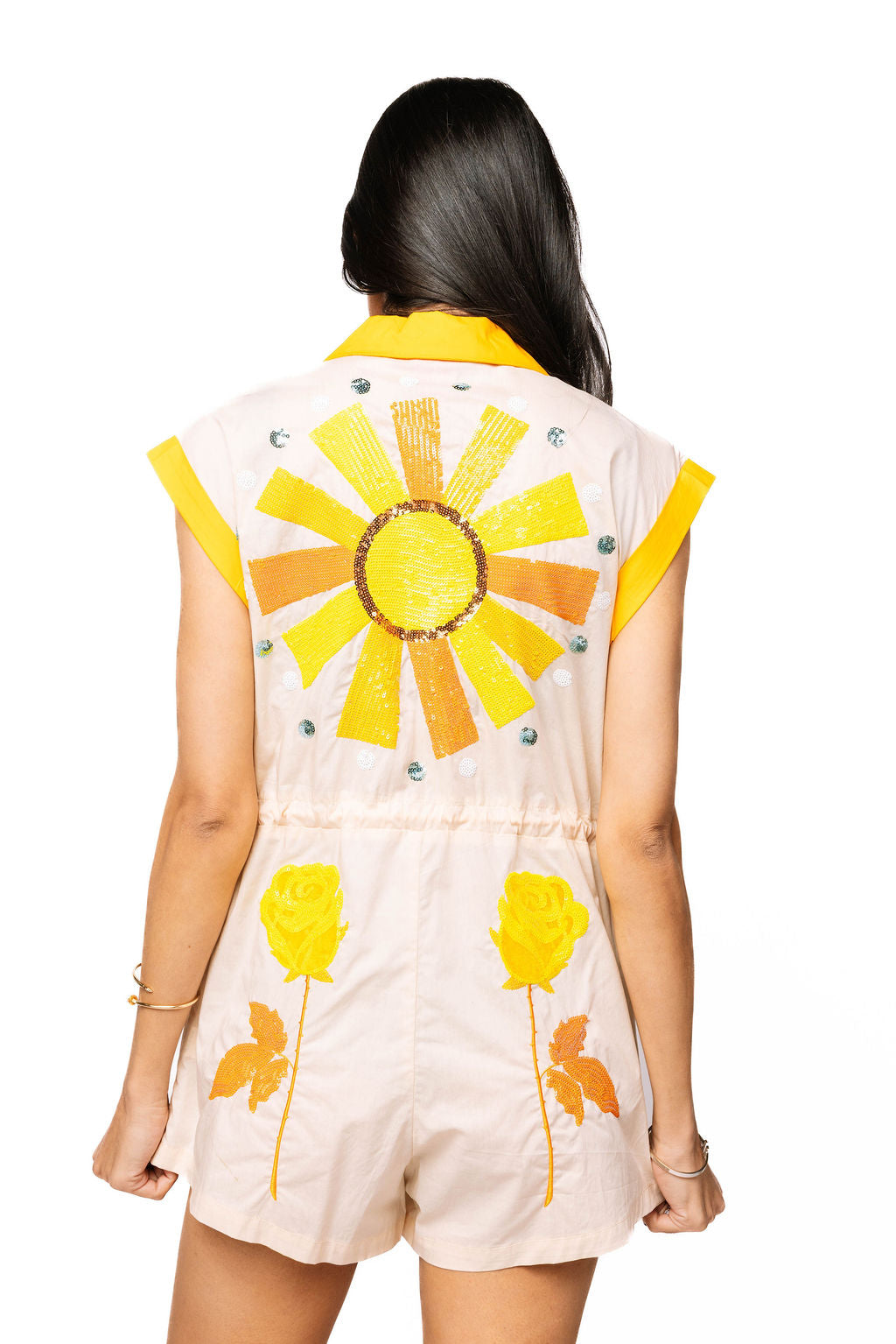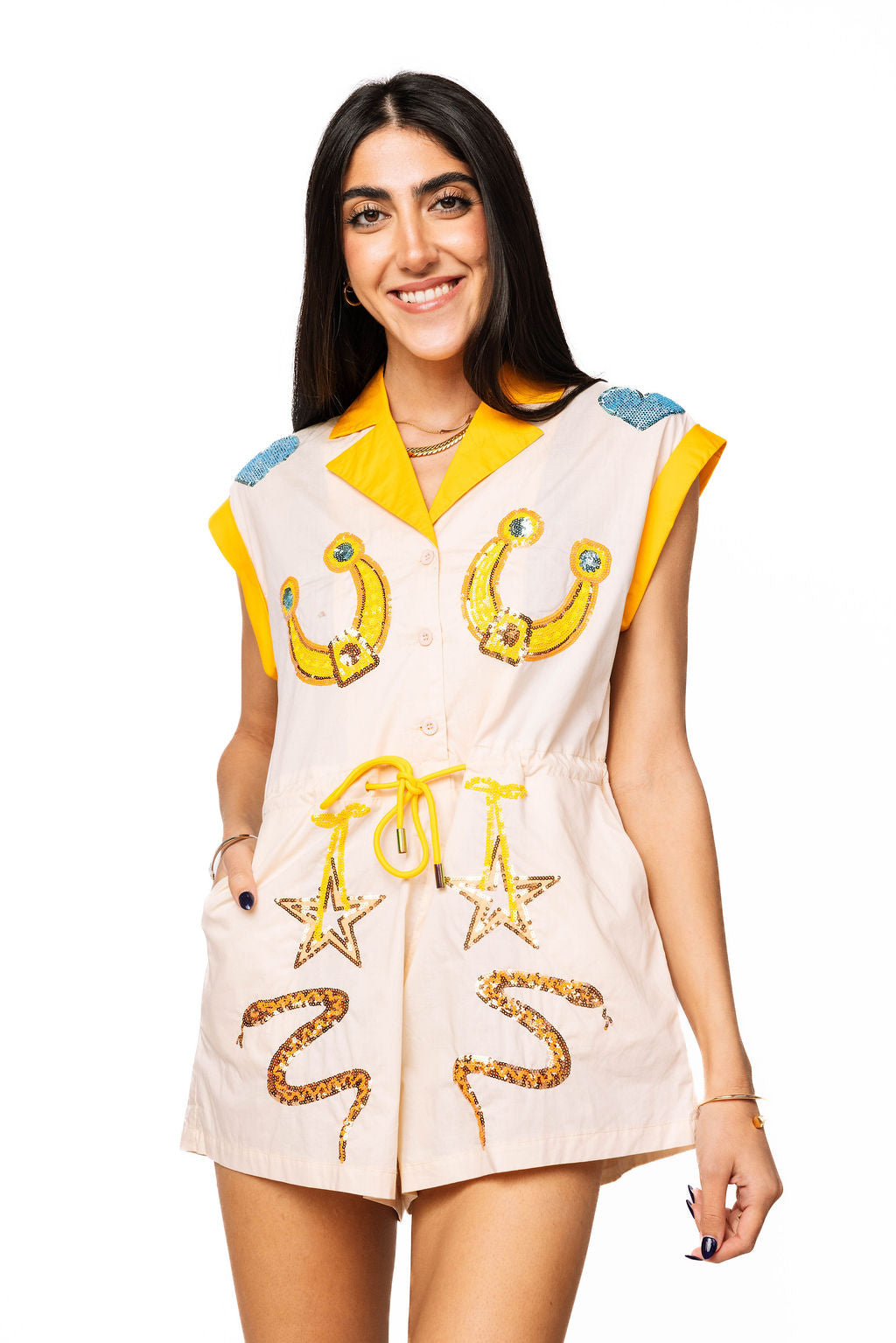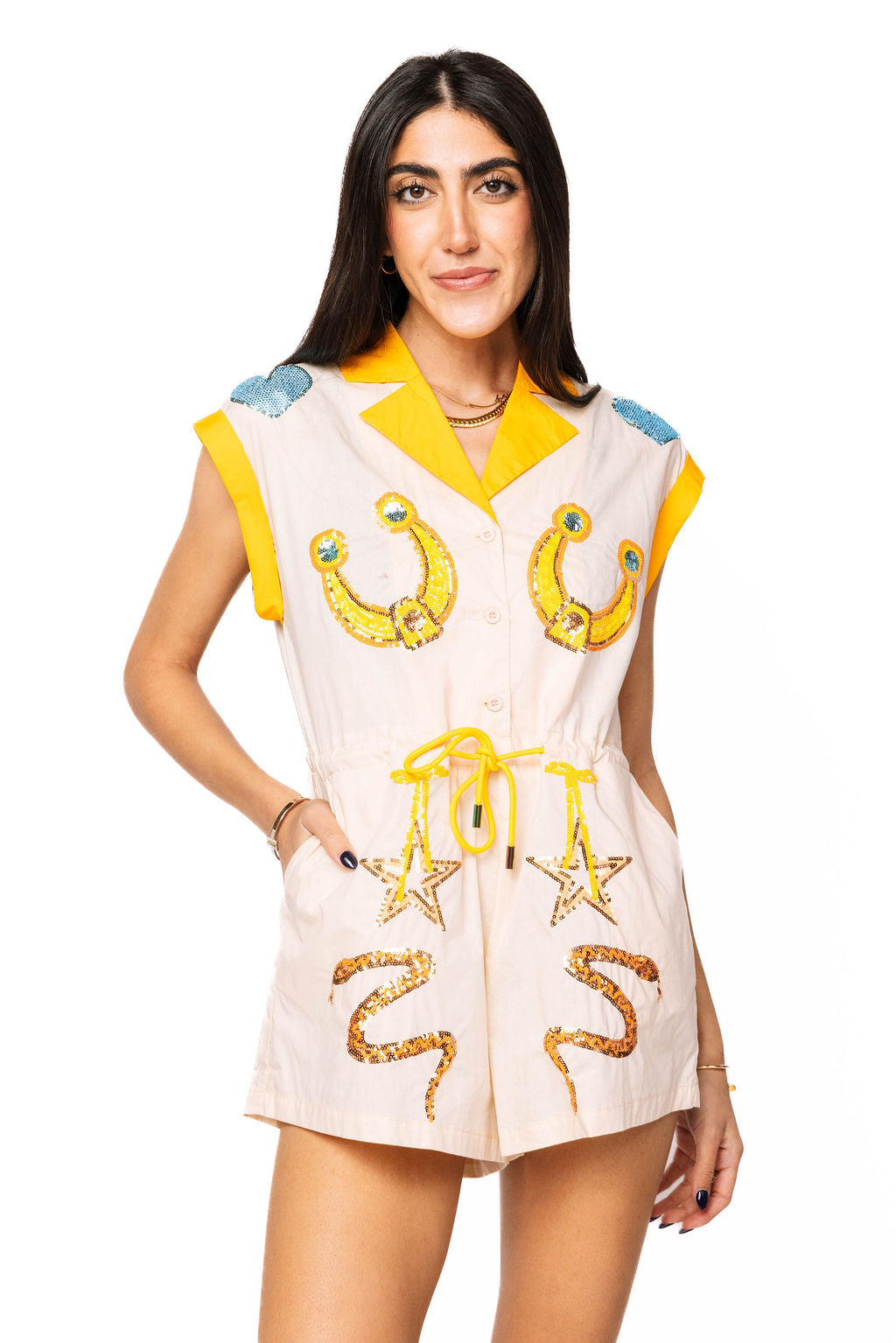 Saddle up for adventure in this beige romper that brings Western charm with a sparkly twist. Featuring playful yellow and blue accents, this piece showcases iconic imagery—stars, horseshoes, and snakes—that capture that bold, free-spirited vibe. Perfect for making a statement at festivals, nights out, or whenever you want to channel your inner cowgirl with confidence and flair.
