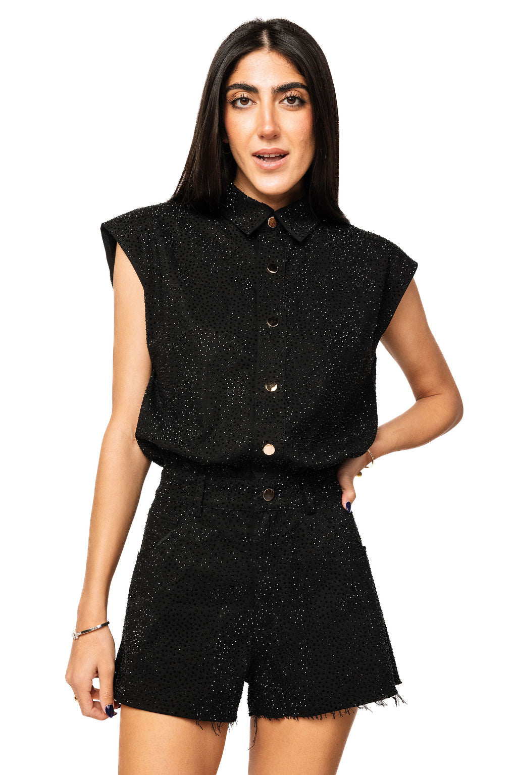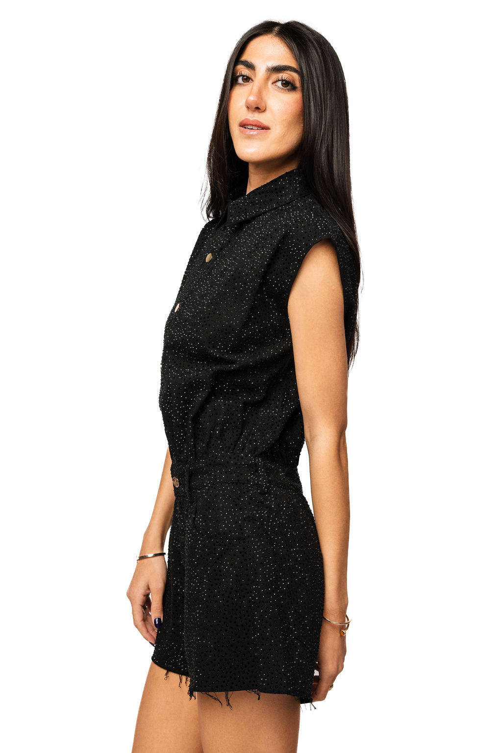 Make a statement in this show-stopping black denim romper that's absolutely dripping in sparkle. The button-up top features rhinestones scattered across every inch, catching light with every move you make. Pair that glam with raw-edge shorts for an edgy-meets-elegant vibe that's perfect for nights out or turning heads wherever you go. One piece, infinite confidence.