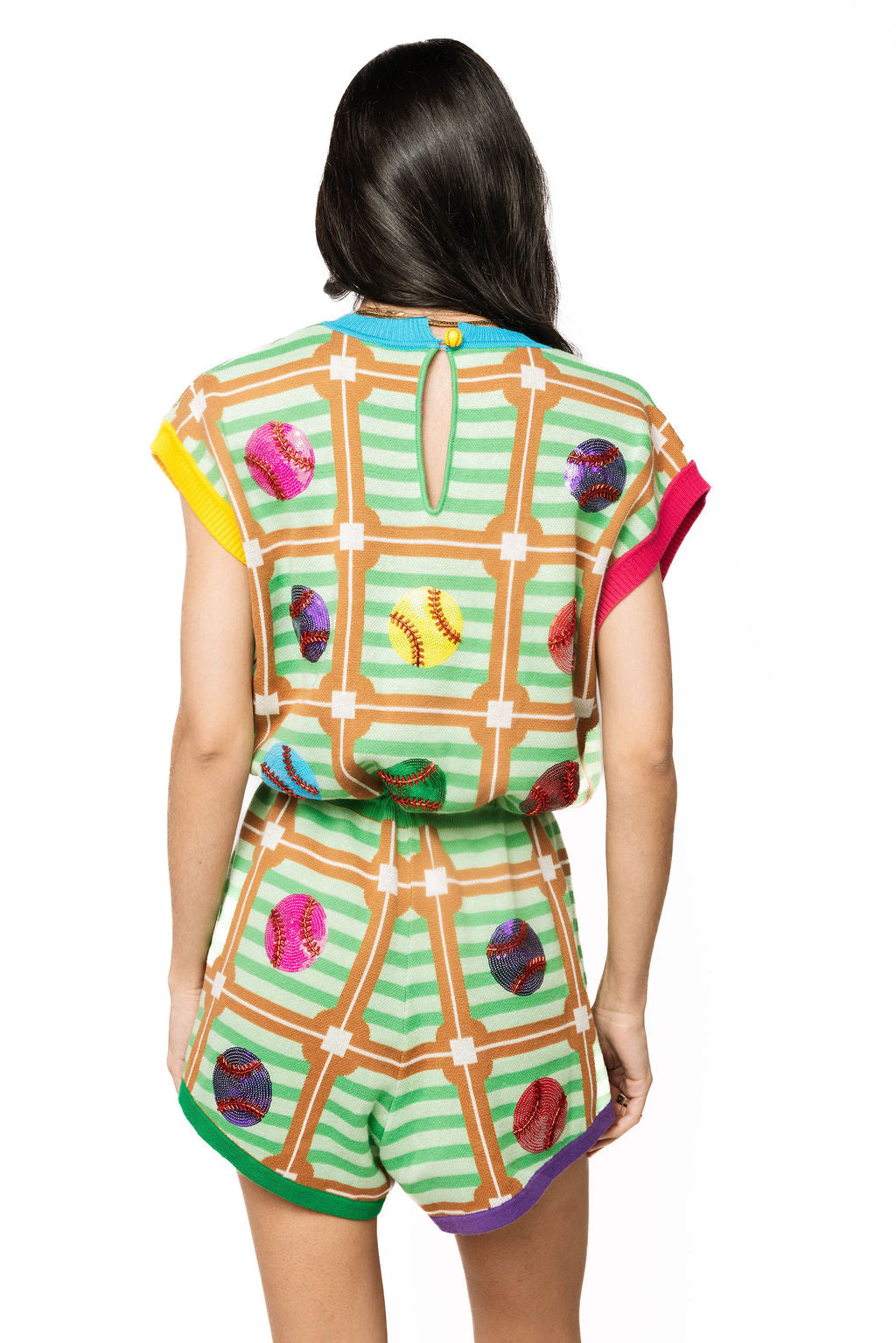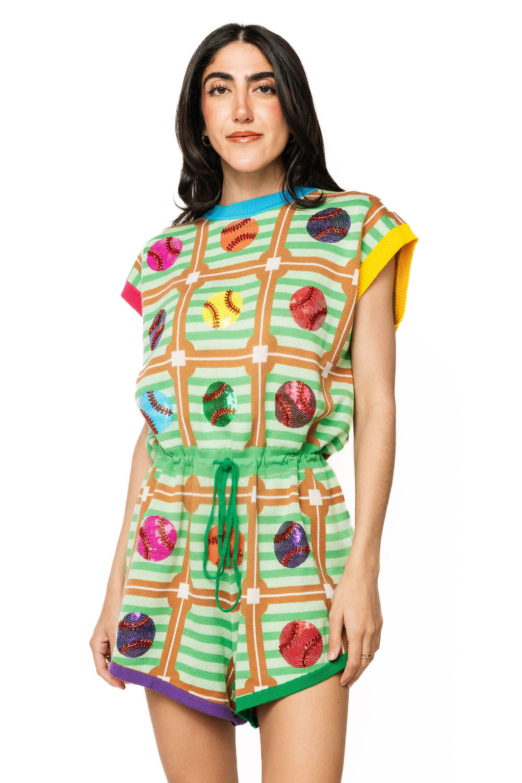 Step up to the plate in this vibrant knit romper that celebrates your love of the game. Featuring eye-catching multicolor baseball designs across a playful mint base, this midi-length piece brings sporty style to any occasion. The adjustable tie waist creates a flattering silhouette while the soft knit fabric ensures all-day comfort. Perfect for game day, casual outings, or anyone who wants to wear their passion for baseball with confidence and flair.