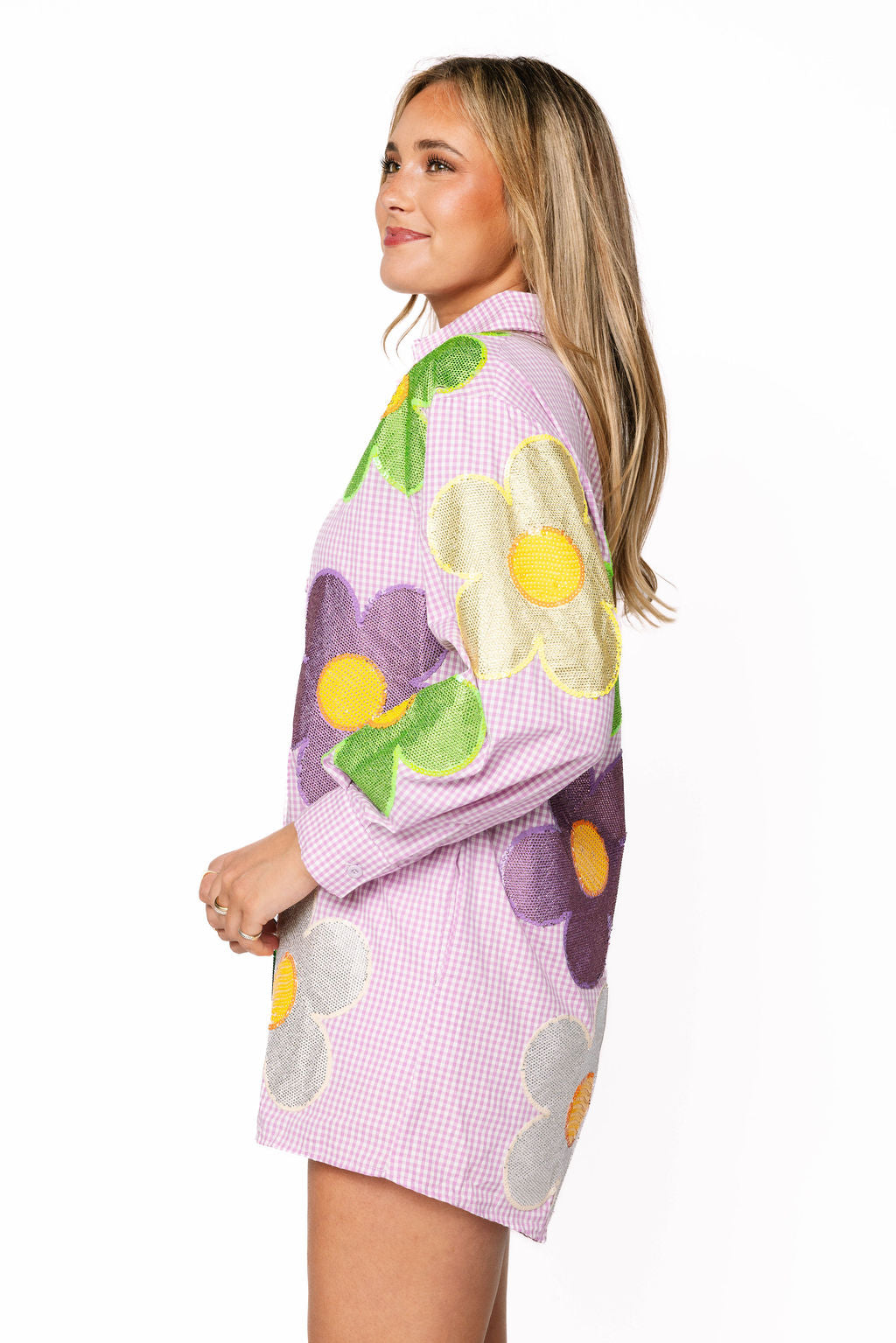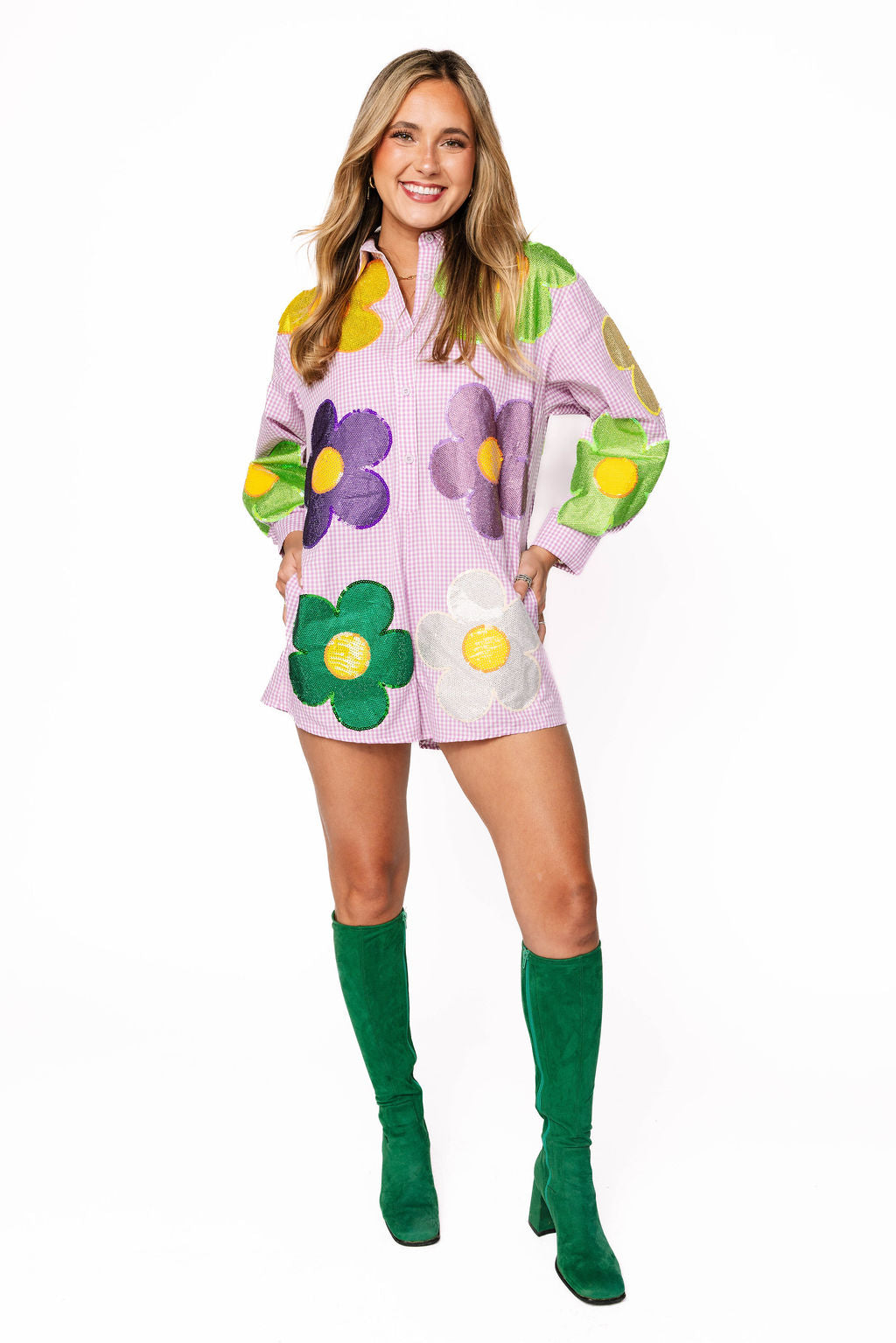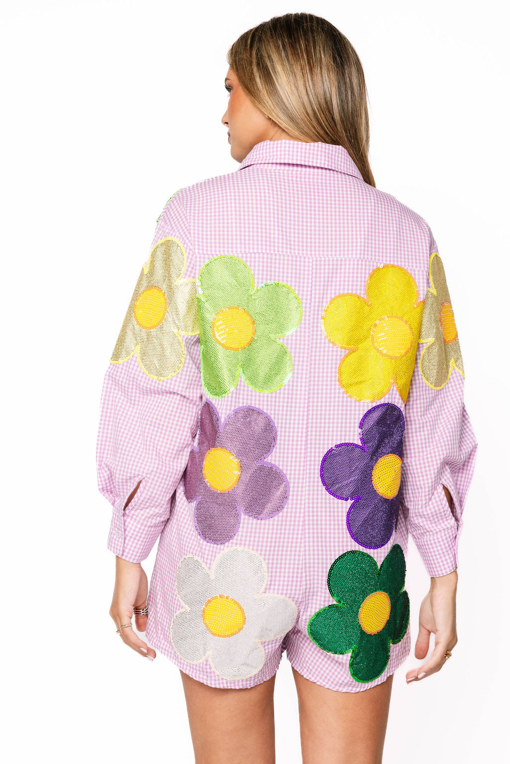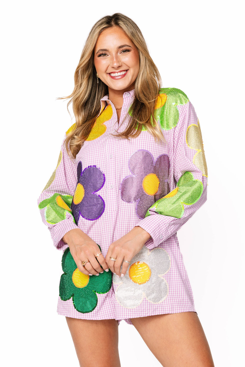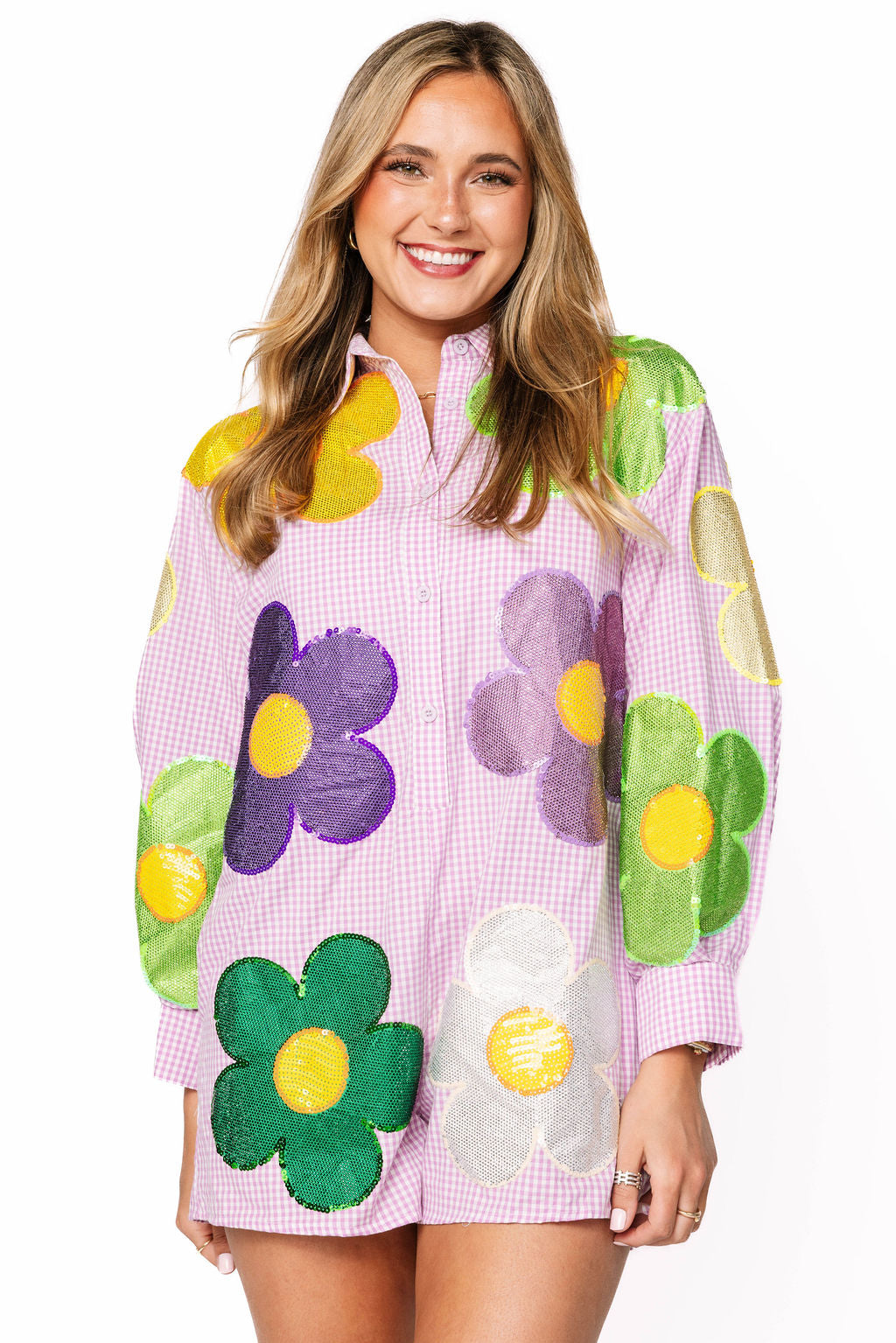 Get ready to turn heads this Mardi Gras season in this show-stopping romper! Featuring a classic purple and white gingham base, the front and back are adorned with vibrant sequin and rhinestone flowers in purple, green, yellow, and white that catch the light with every move. The oversized fit keeps you comfortable while you celebrate, dance, and make memories. Whether you're hitting the parade route or the party scene, this festive piece brings all the sparkle and fun you need to stand out in the crowd.