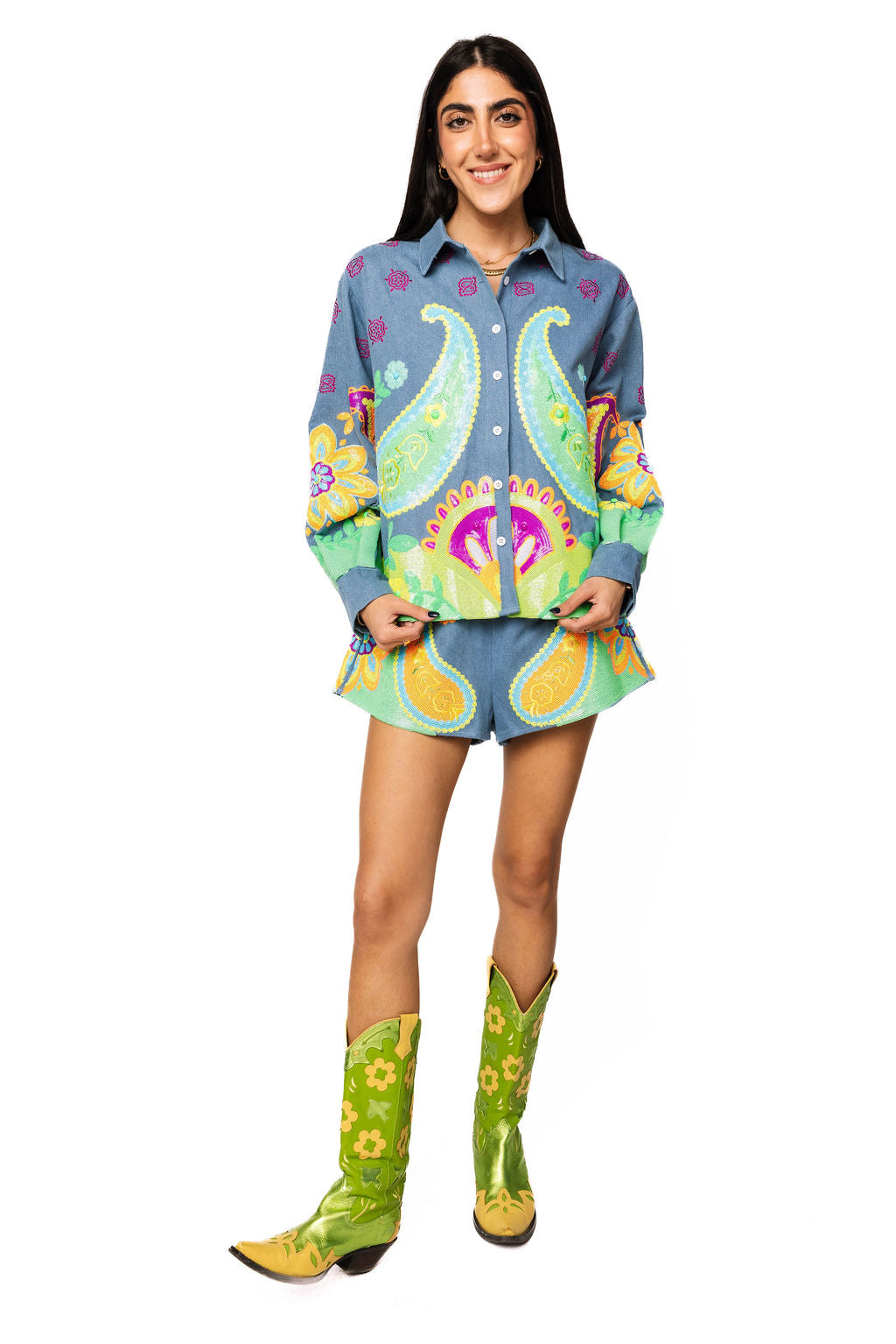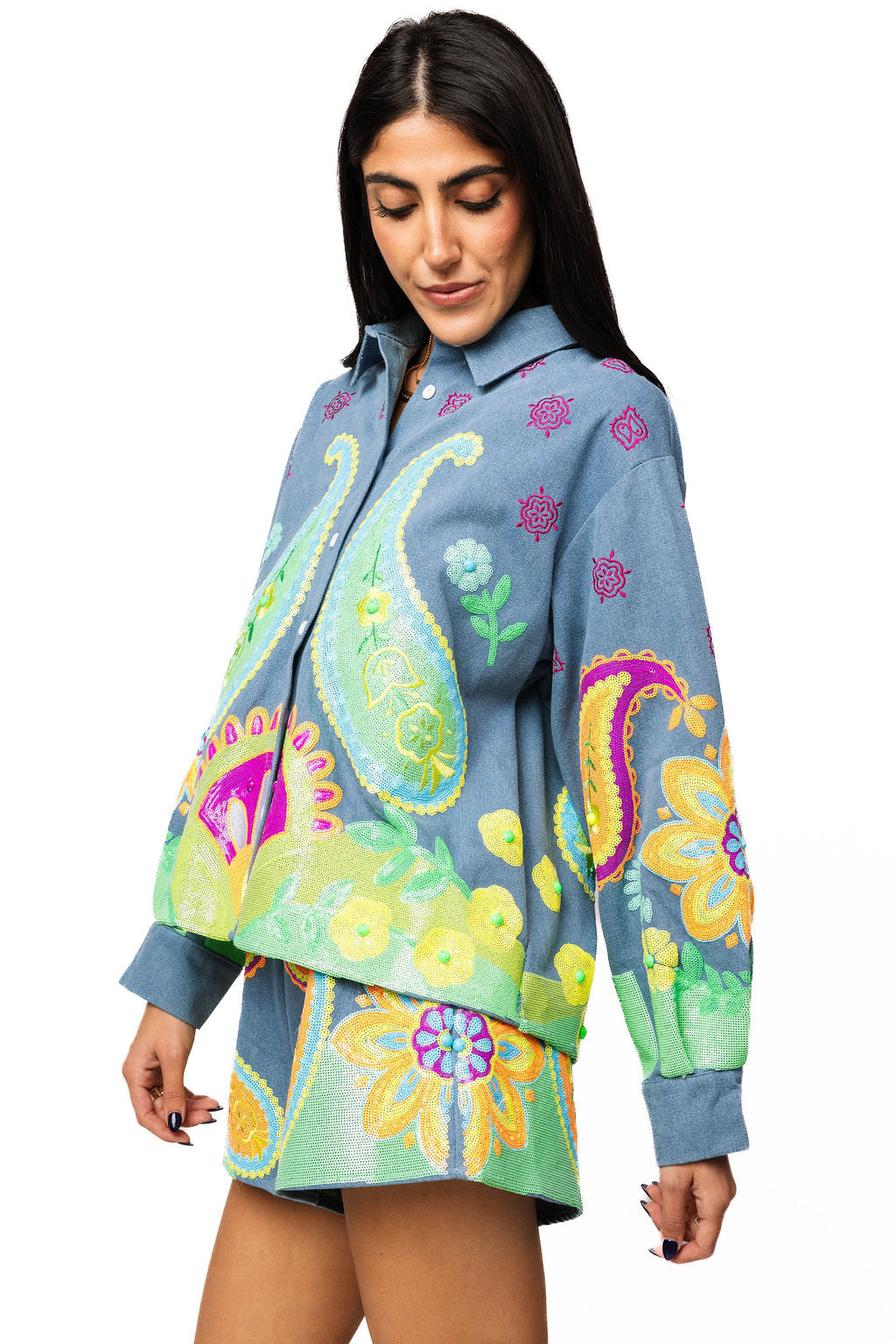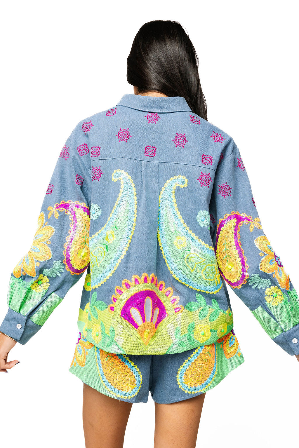 Rock a bold statement with this denim button-up featuring a vibrant neon multi-color paisley design crafted entirely in eye-catching sequins. The long sleeves and classic button-front silhouette keep things wearable while the shimmering paisley pattern steals the show. Perfect for turning heads at parties, festivals, or whenever you're ready to sparkle. Pair it with our matching shorts for a coordinated look that's pure fun and totally unforgettable.