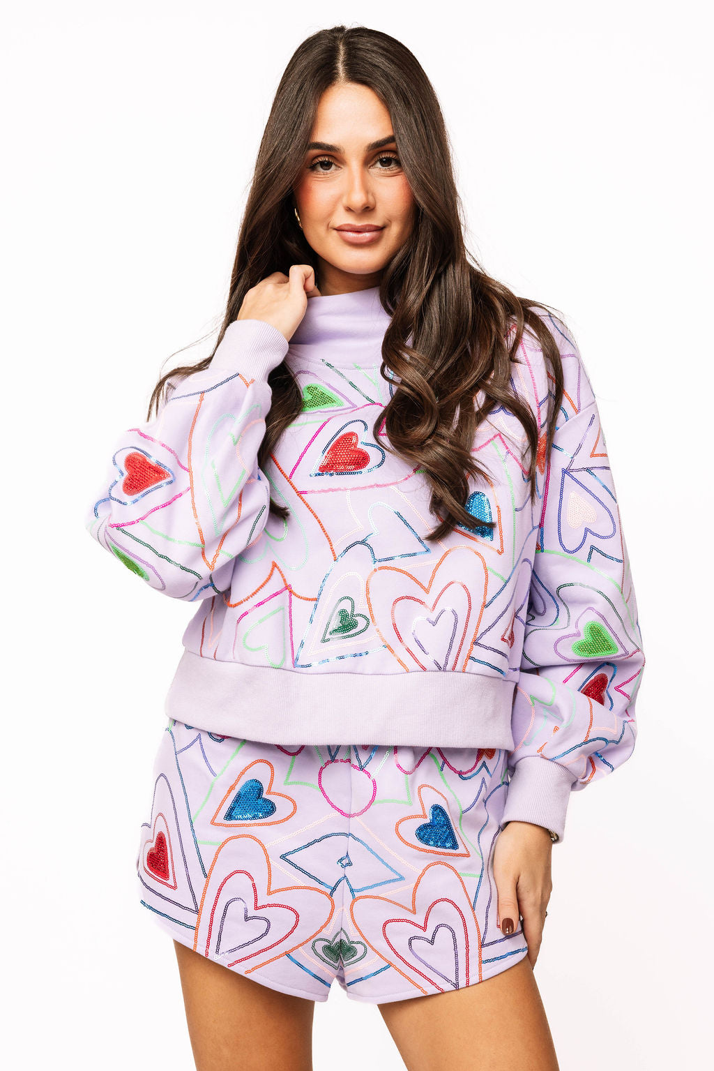 Slip into pure comfort with these lavender sweatshorts featuring a groovy multicolor sequin heart design splashed across the front and back. The elastic waistband keeps everything in place while you move through your day in style. Mix and match with the coordinating mock neck sweatshirt to create an effortlessly cute set that's perfect for lounging, running errands, or just vibing. Soft, sparkly, and totally you.