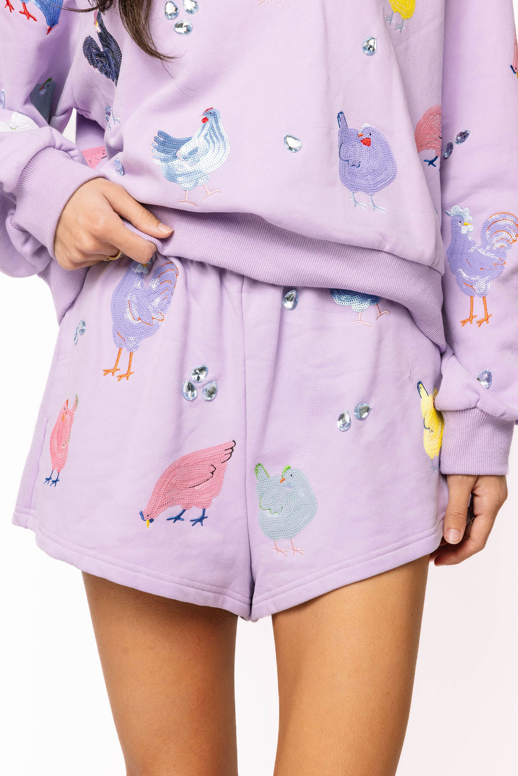 Get ready to turn heads this spring in these lavender shorts featuring a vibrant multi-color chicken design adorned with sparkling rhinestone eggs. The comfortable elastic waist keeps you moving all day long. Elevate your look by pairing these playful shorts with the matching sweatshirt for a coordinated set that radiates fun and style. Perfect for anyone who embraces bold, whimsical fashion, this duo delivers comfort and personality in every wear. Make spring unforgettable with this eye-catching ensemble.