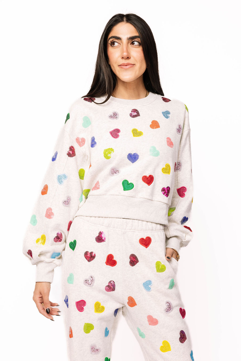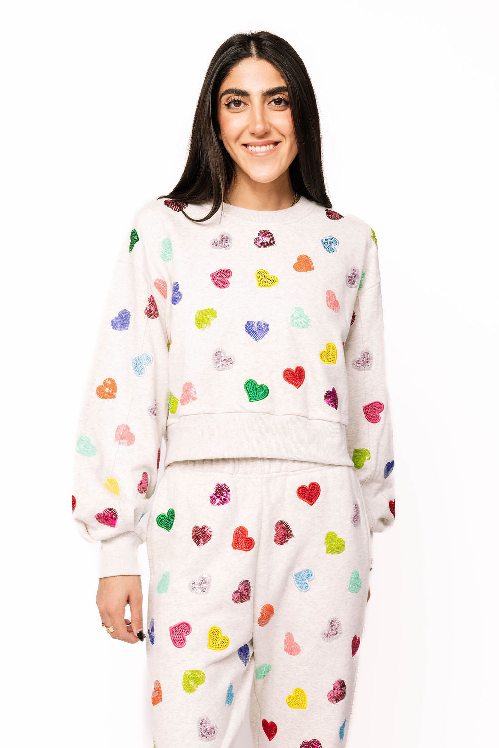 Sparkle up your casual wardrobe with this light grey sweatshirt featuring vibrant multi-color rhinestone hearts adorning both the front and back. Perfect for showing off your glittery side, this cozy piece pairs beautifully with our matching pants for a coordinated look that's equal parts comfort and glamour. Whether you're running errands or making a statement, these shimmering hearts catch the light and turn heads wherever you go.