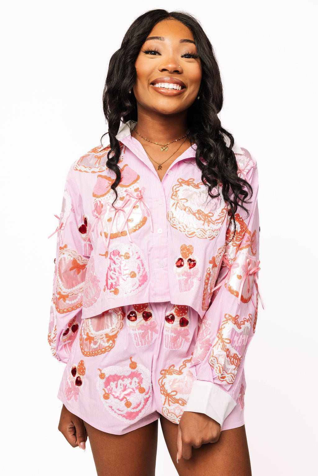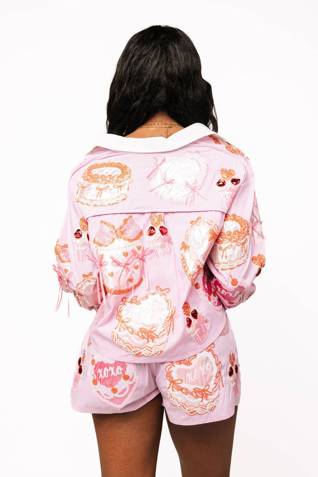 Adorable pink shorts featuring whimsical cake and pastry designs splashed across the front and back—perfect for dessert lovers with a sweet sense of style. Crafted from soft cotton for all-day comfort, these playful shorts are ideal for casual outings or cozy days at home. Mix and match with our coordinating top to create an Instagram-worthy set that celebrates your love of all things sugary and delightful. A fun, flirty essential that brings a sprinkle of joy to your wardrobe.