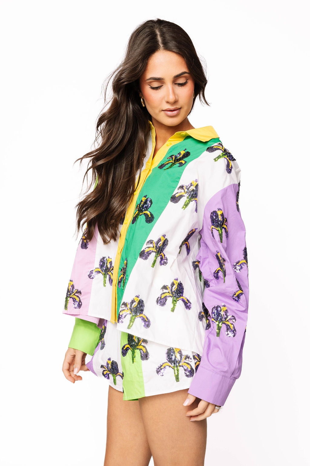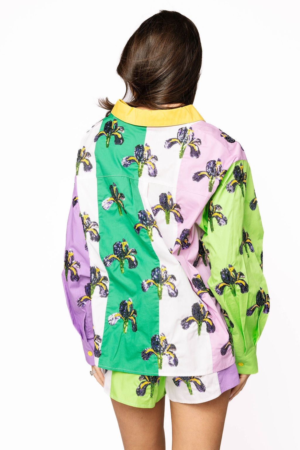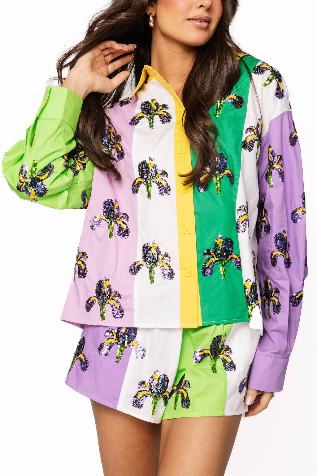 Celebrate in style with these vibrant colorblock shorts featuring a dazzling sequin iris design on both the front and back. The purple, green, yellow, and white palette captures pure Mardi Gras magic, while the soft cotton keeps you comfortable all night long. Pair it with the matching top for a coordinated look that'll have you shining brighter than the Big Easy itself. Whether you're hitting the parade route or the dance floor, these eye-catching shorts brings the sparkle and the fun!