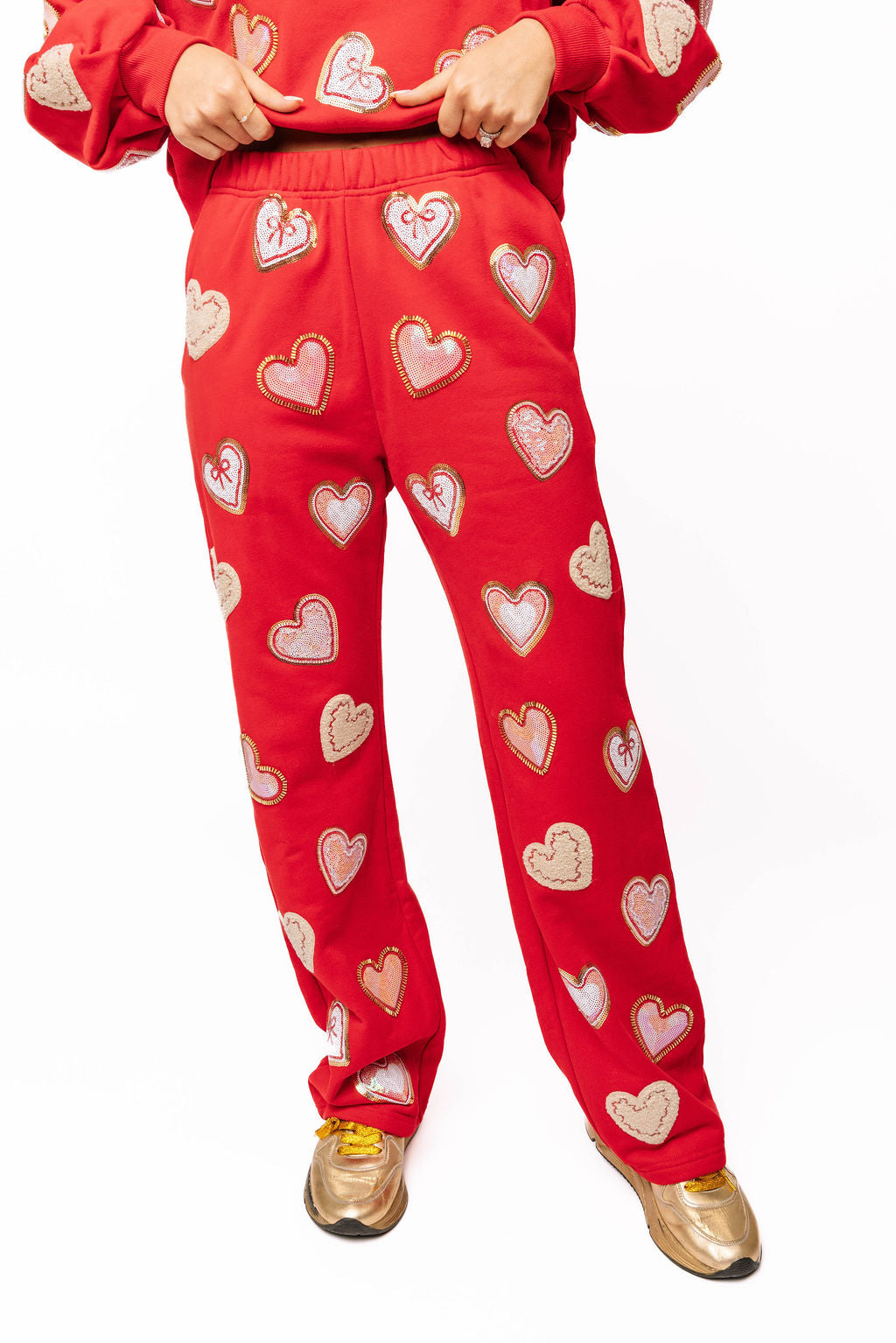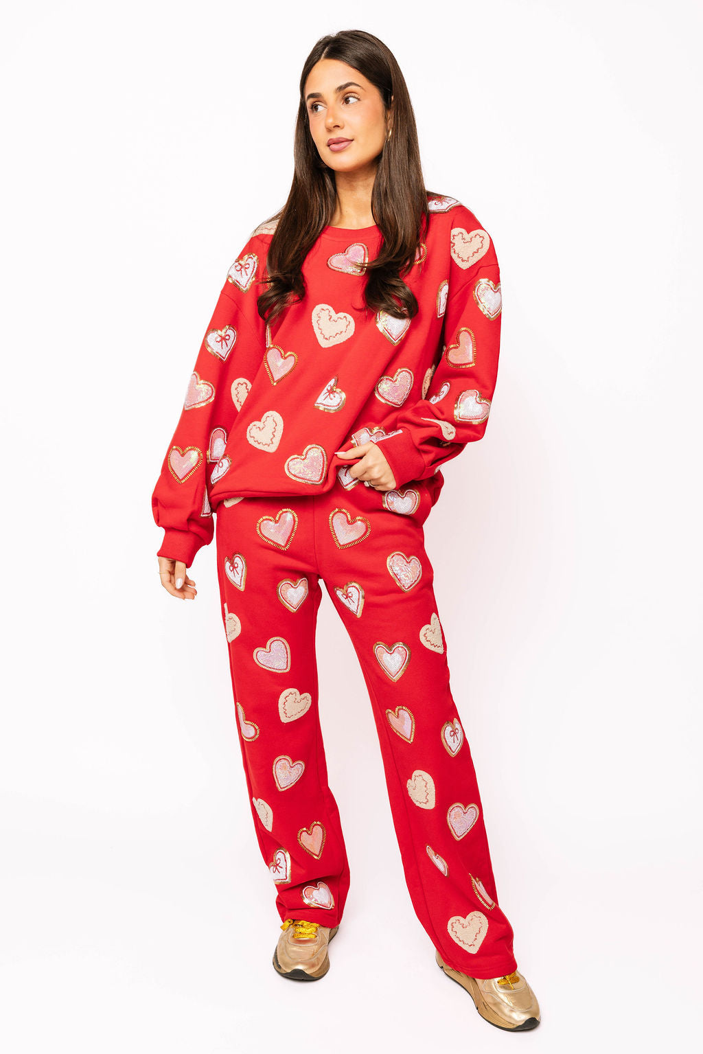 Cozy up in these vibrant red sweatpants featuring an adorable Valentine's heart cookie design that's almost too cute to wear. Perfect for lounging or running errands, they're the ultimate comfort piece that doesn't sacrifice style. Mix and match with our matching cropped or oversized sweatshirt to create your complete sparkly set. Whether you're celebrating love or just spreading sweet vibes, these playful pants are your new go-to for effortless, feel-good fashion.