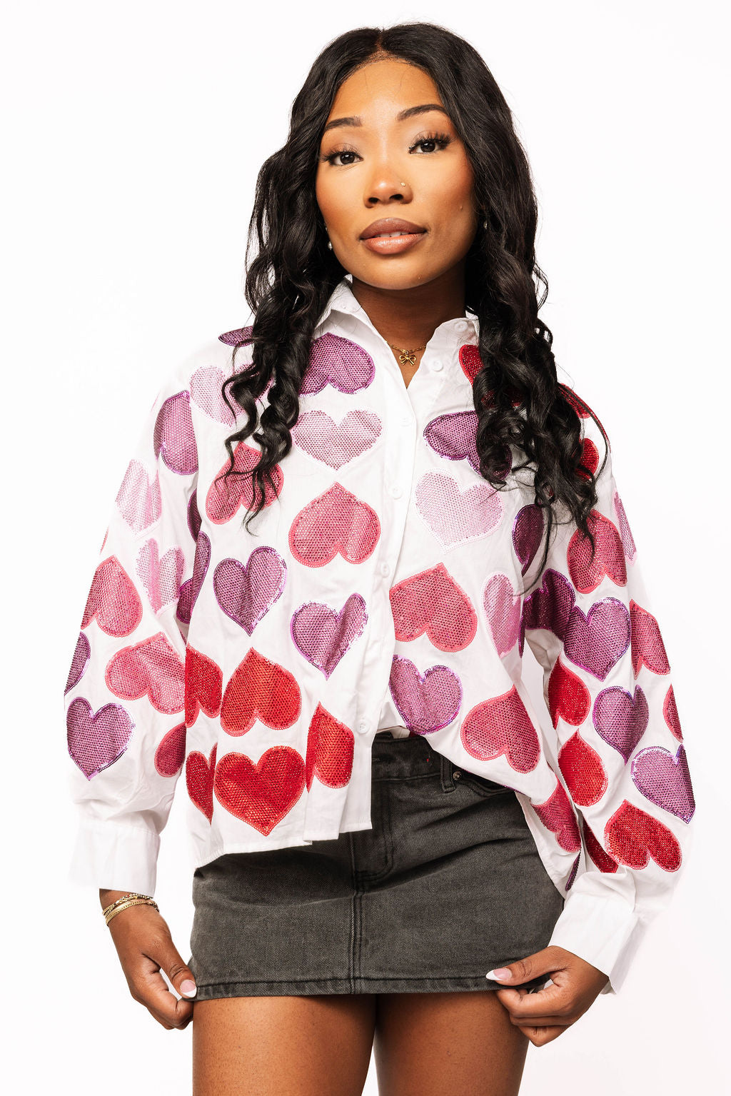 Spread the love in this adorable white button-up top, adorned with sparkling pink and red rhinestone hearts on the front and back. Perfect for making a statement with its eye-catching embellishments, this cotton piece brings fun and flirtation to any outfit. Style it solo for a sweet look or pair it with our matching shorts to create an irresistible coordinated set that's sure to turn heads!