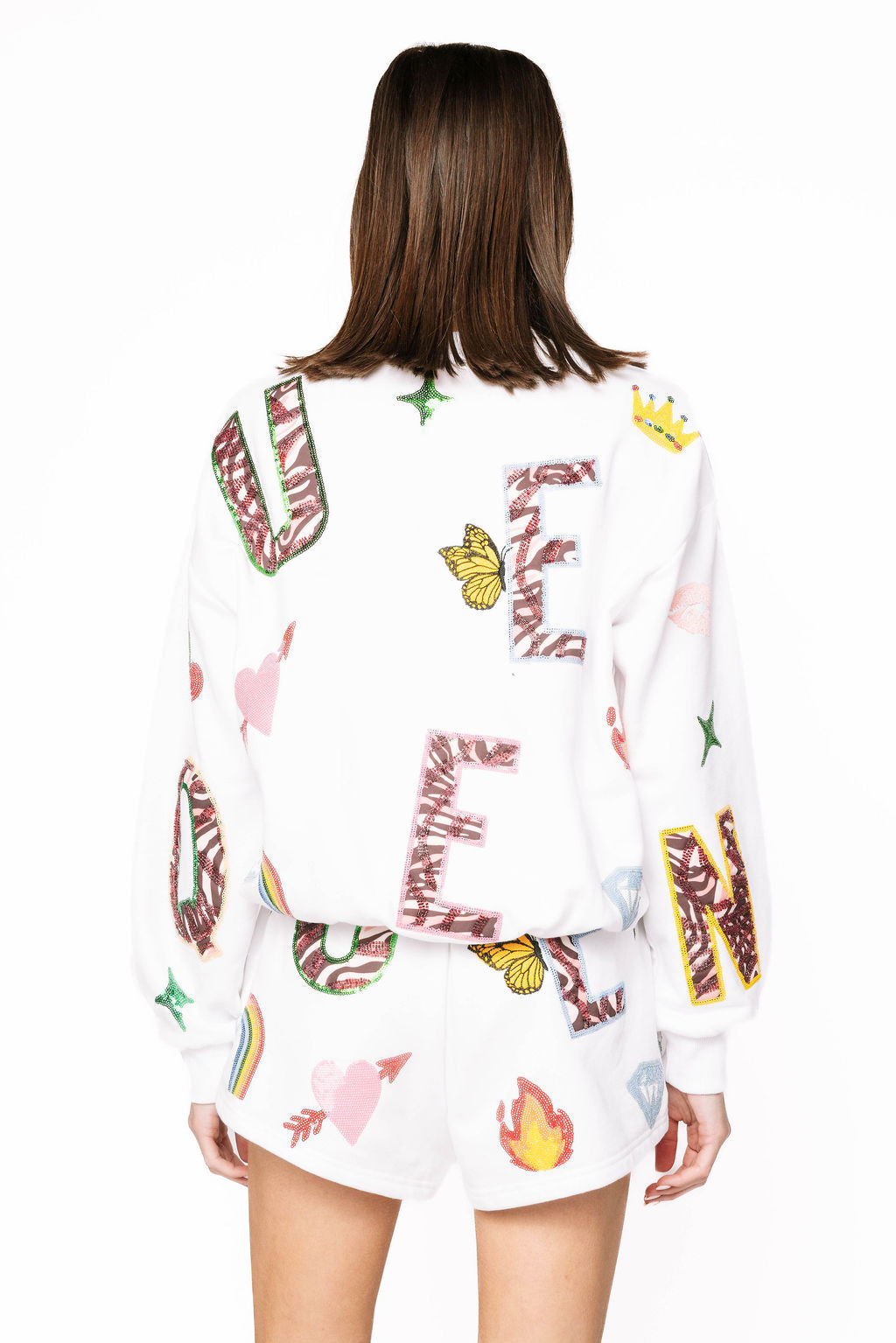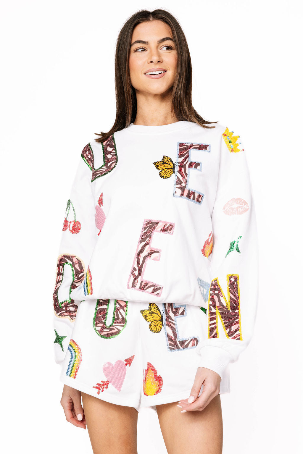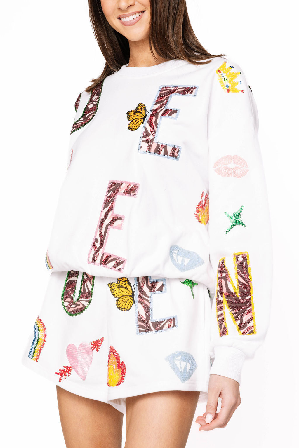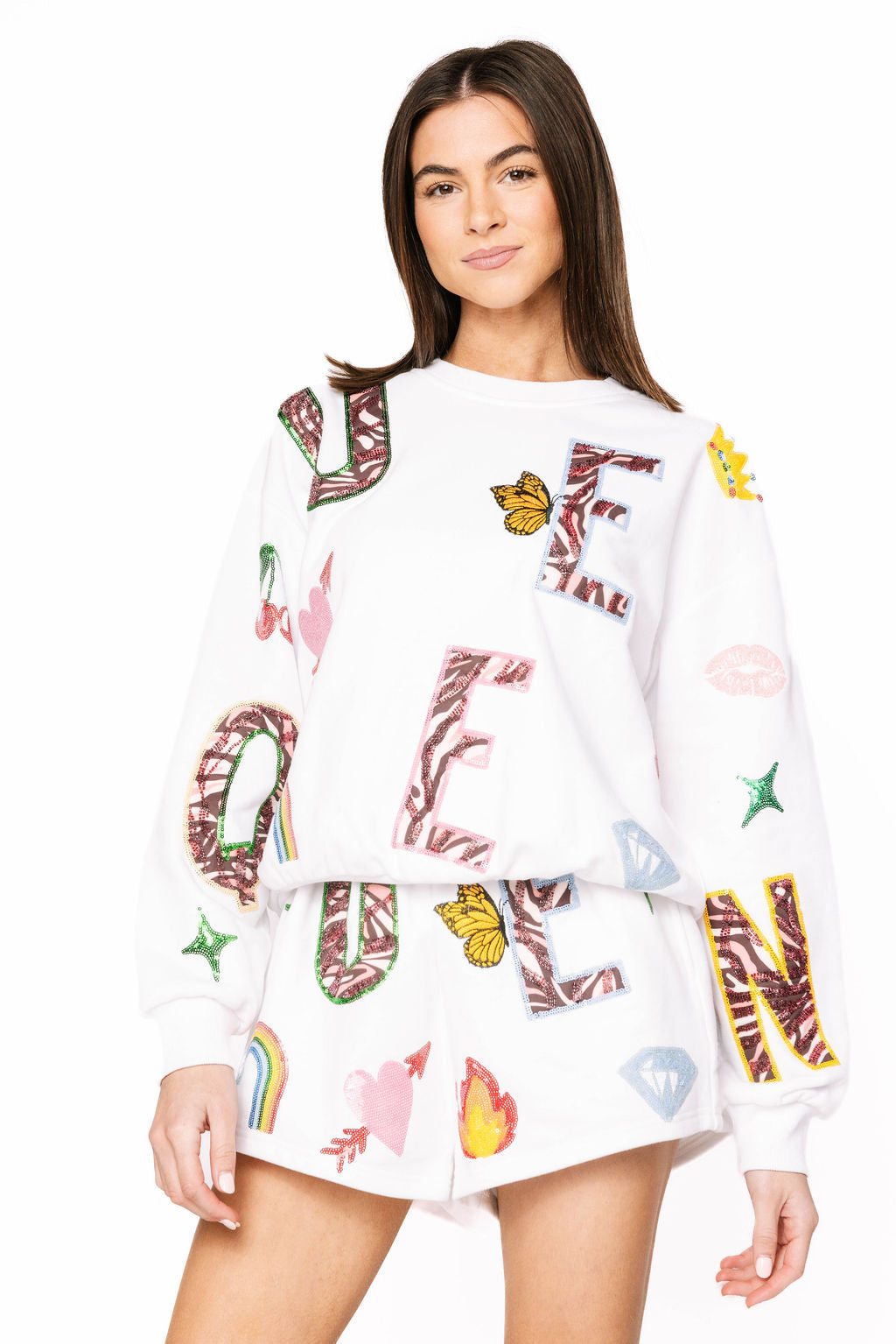 Reign supreme in this playful white sweatshirt featuring the word "Queen" adorned with exclusive QOS-inspired icon designs. Each design celebrates confidence and sparkle with signature flair. Layer it with our matching shorts to create an effortlessly chic set that says you're royalty. Perfect for casual days when you want to feel fabulous without trying too hard. Comfort meets attitude in every wear.
