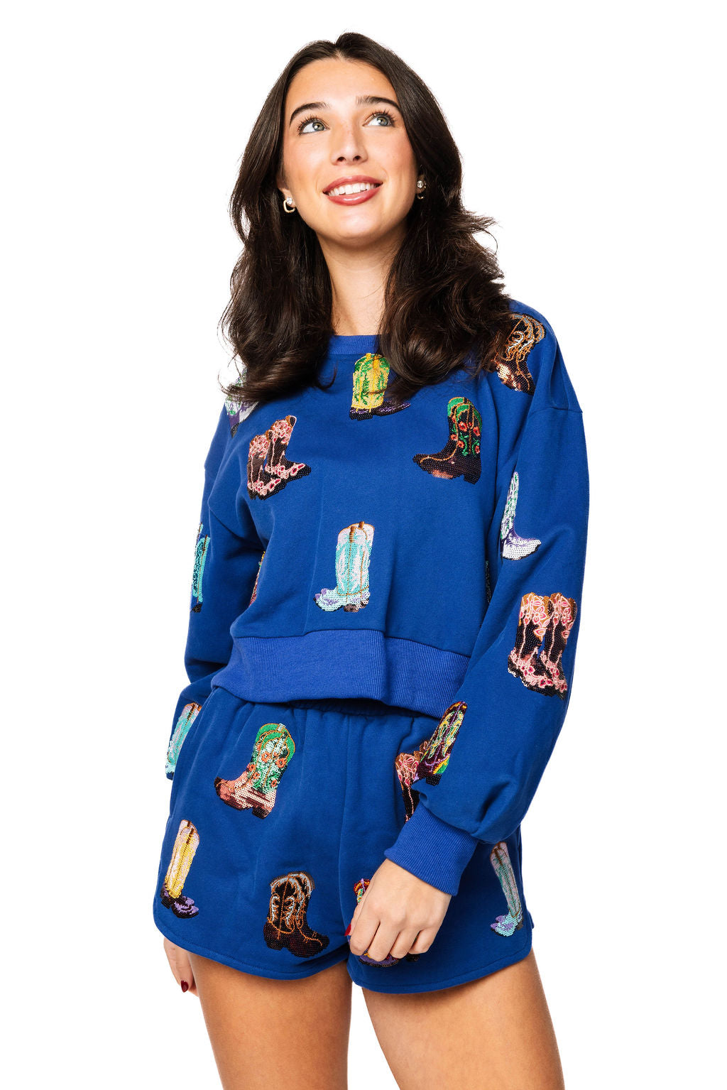 Rock that rodeo spirit in these royal blue sweatshorts featuring a vibrant multi-color cowboy boot design. Perfect for channeling Western vibes with an effortless, cozy feel. Mix and match with the coordinating sweatshirt to complete your full-on rodeo aesthetic. Whether you're heading to a country concert or just embracing your inner cowgirl, these shorts deliver style with serious comfort. Saddle up and let your personality shine!