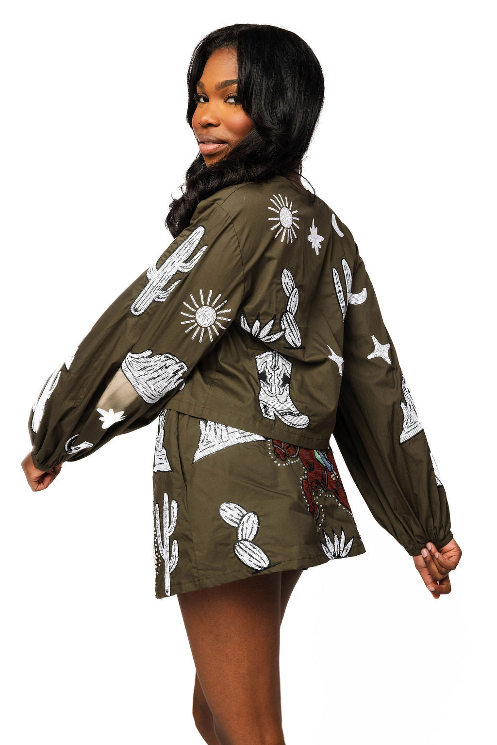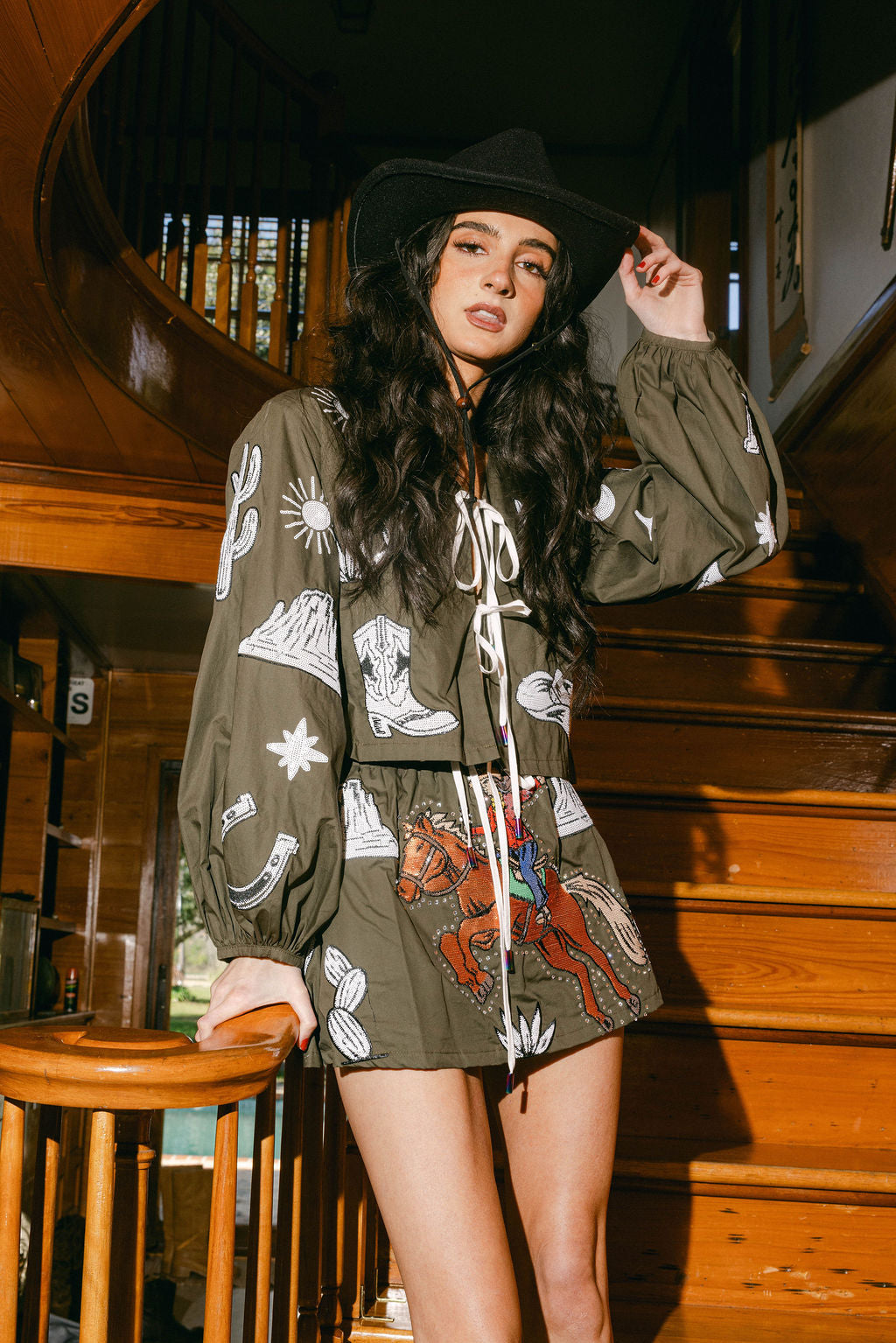 Saddle up in this dark green skirt featuring bold western icons and a spirited bucking cowgirl design that demands attention. The rich forest green pairs perfectly with ivory accents, creating a striking contrast that captures authentic rodeo energy. Style it with the matching top or tank to complete your full western-inspired ensemble. Perfect for anyone ready to bring some cowgirl attitude to their wardrobe—whether you're hitting the honky-tonk or just channeling that fearless frontier spirit.