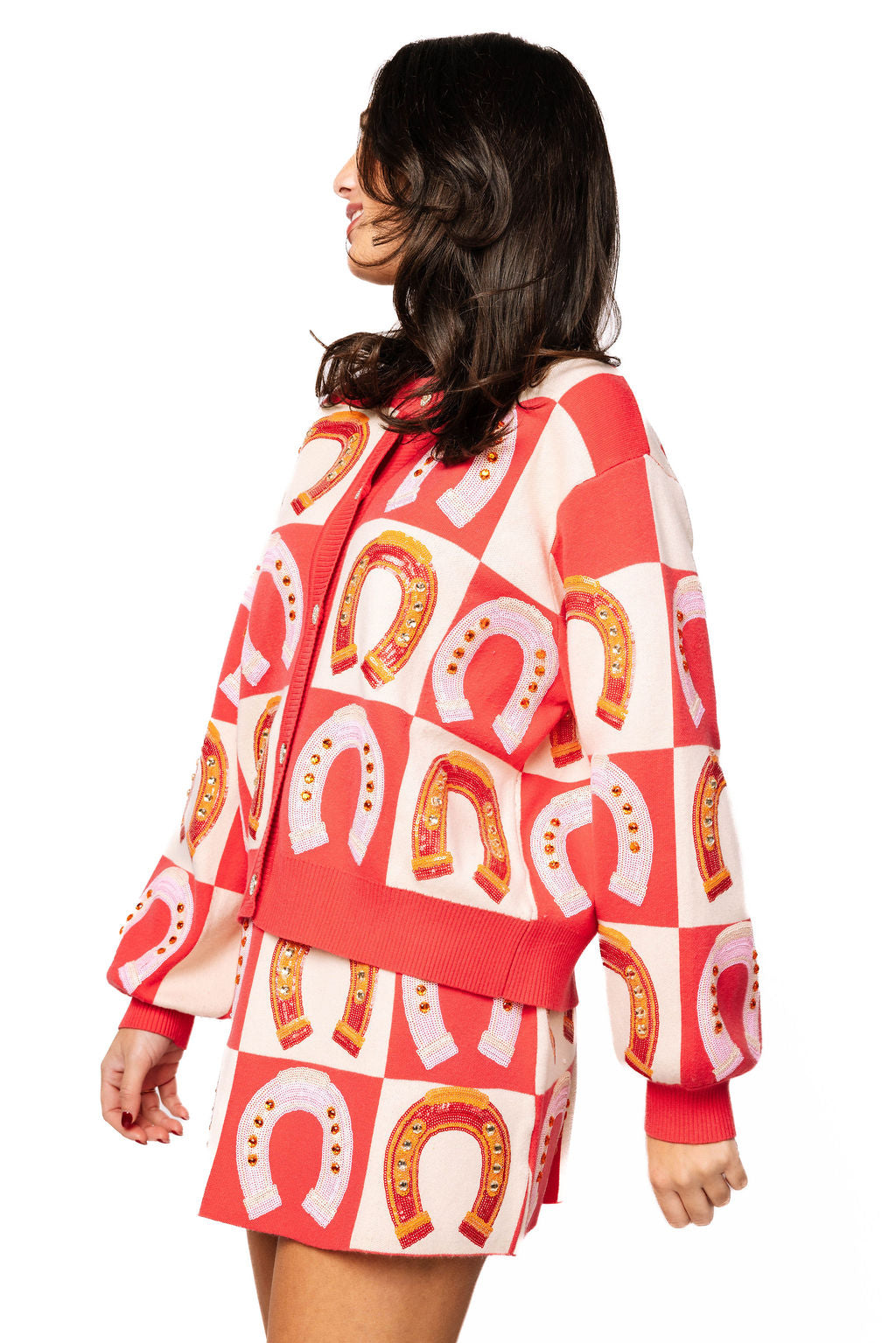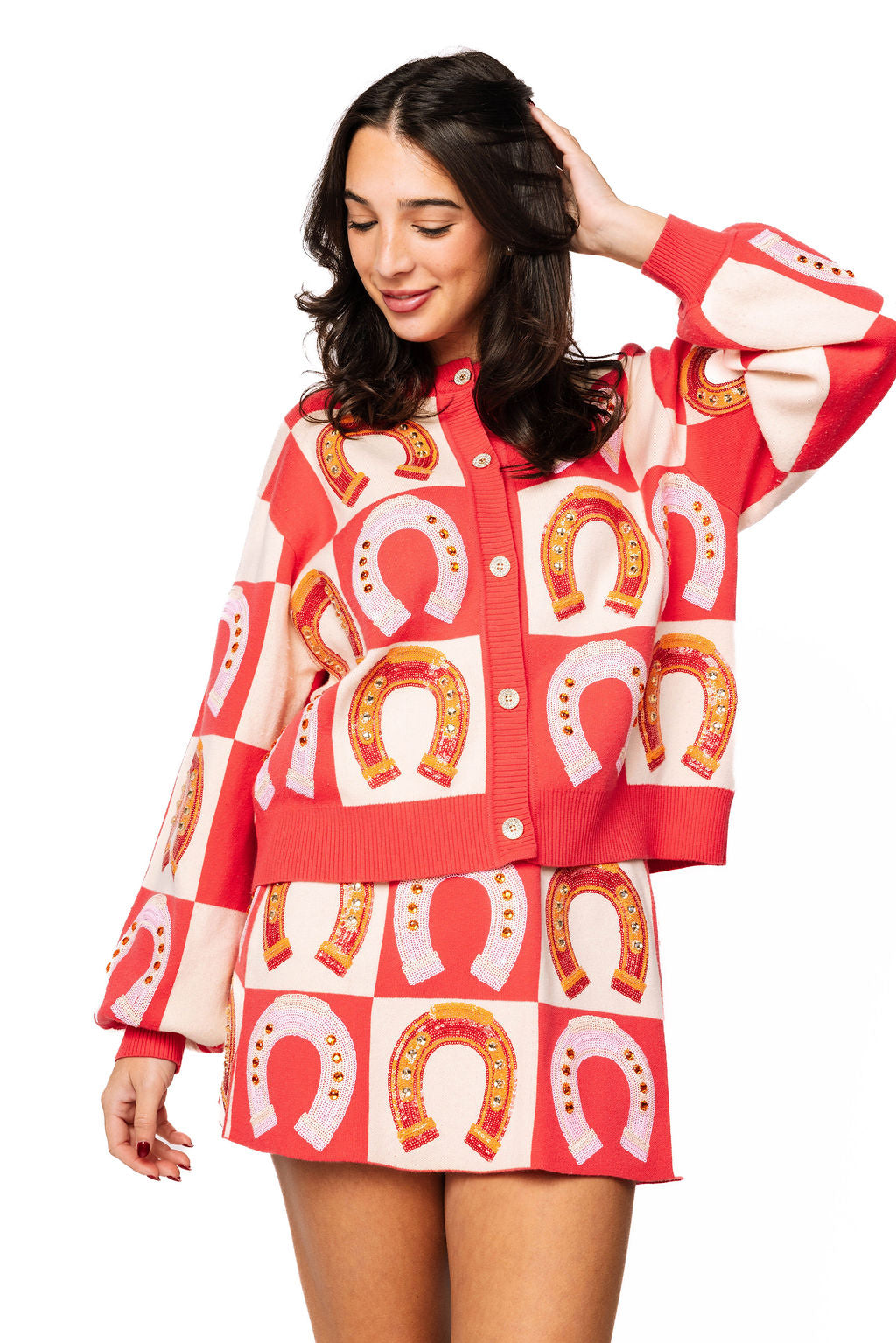 This hot pink and cream checkered knit skirt is giving major preppy vibes with its adorable horseshoe motifs scattered throughout. The cozy knit fabric makes it perfect for layering, and it pairs beautifully with the matching cardigan for a coordinated, head-to-toe look that's sure to turn heads. Whether you're channeling your inner equestrian or just love a fun, flirty aesthetic, this skirt brings personality and charm to any outfit.