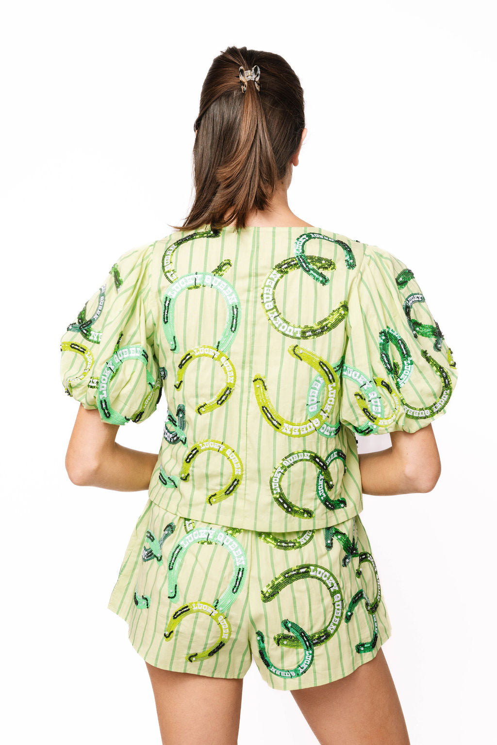 Sample Green Stripe Lucky Queen Horse Shoe Tie Poof Sleeve Top and Short Set