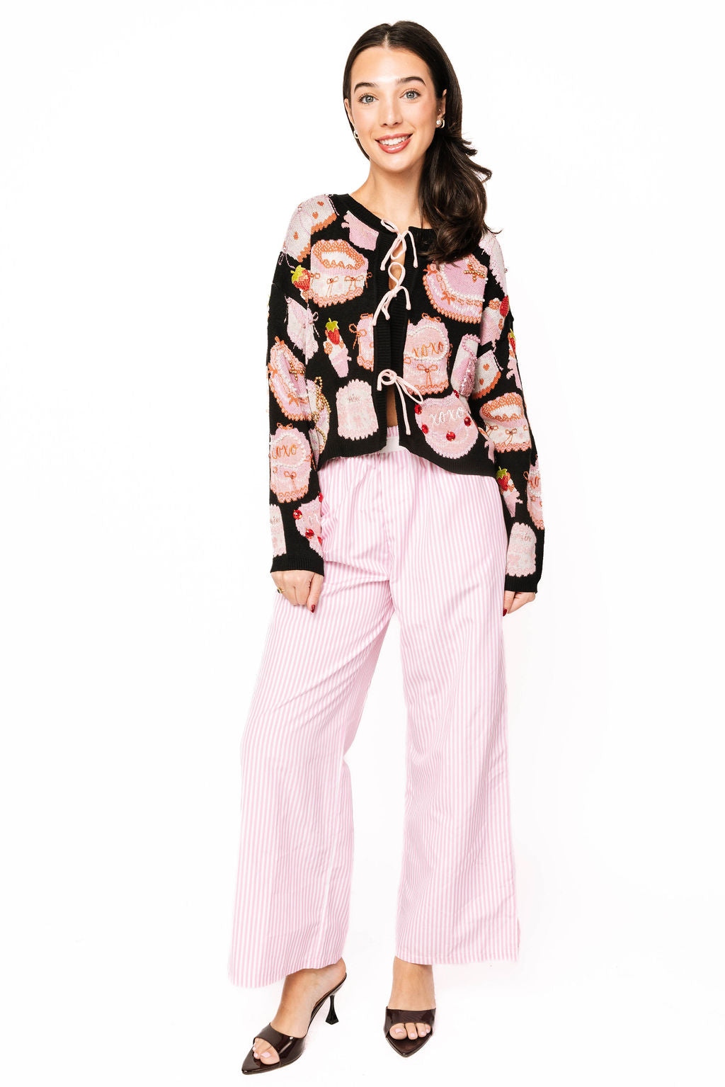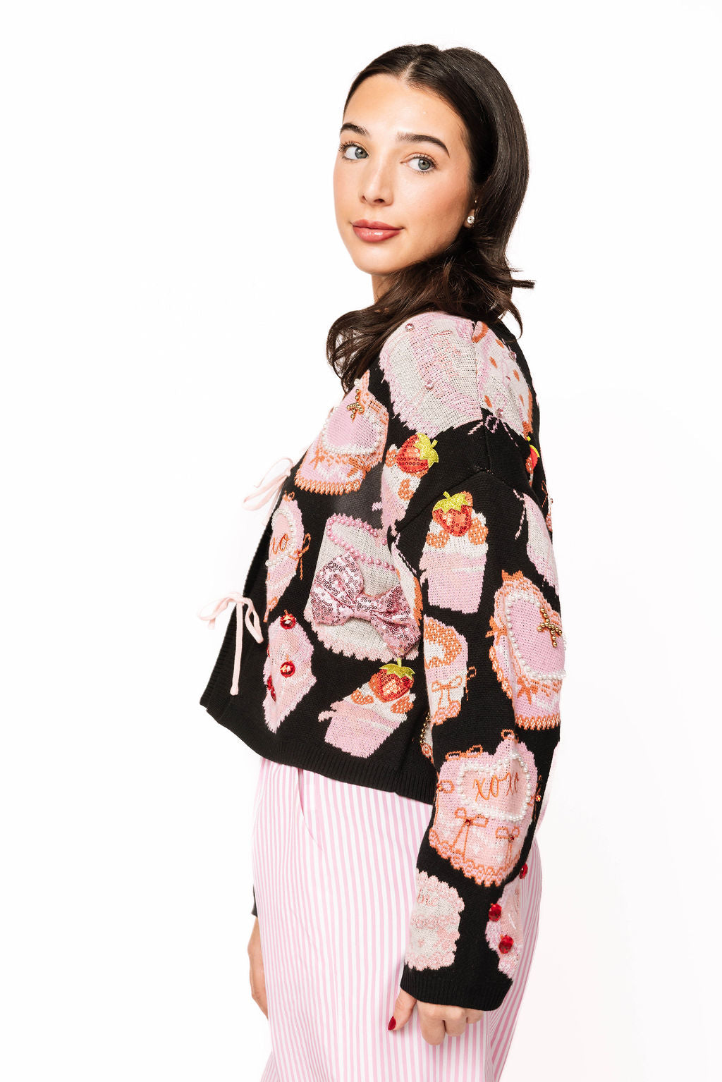 Tie up the sweetest look with this black cardigan featuring adorable pink Valentine's cakes and pastries scattered across the front and back. Perfect for adding a playful, dessert-inspired touch to your wardrobe, this piece brings whimsy and charm to any outfit. Whether you're celebrating love or just craving something fun and flirty, this cardigan serves serious style with a side of sugar. Dress it up or down—it's the perfect way to show off your sweet tooth in fashion form.