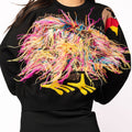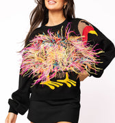 Get ready to steal the Thanksgiving spotlight with our Black Feather Turkey Sweater! Decked out with real rainbow feathers, this quirky sweater lets you strut your stuff and bring festive fun wherever you go. Cozy, colorful, and undeniably playful—this is the perfect way to make a bold statement while staying comfy all day long. Gobble up the compliments!