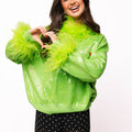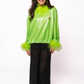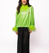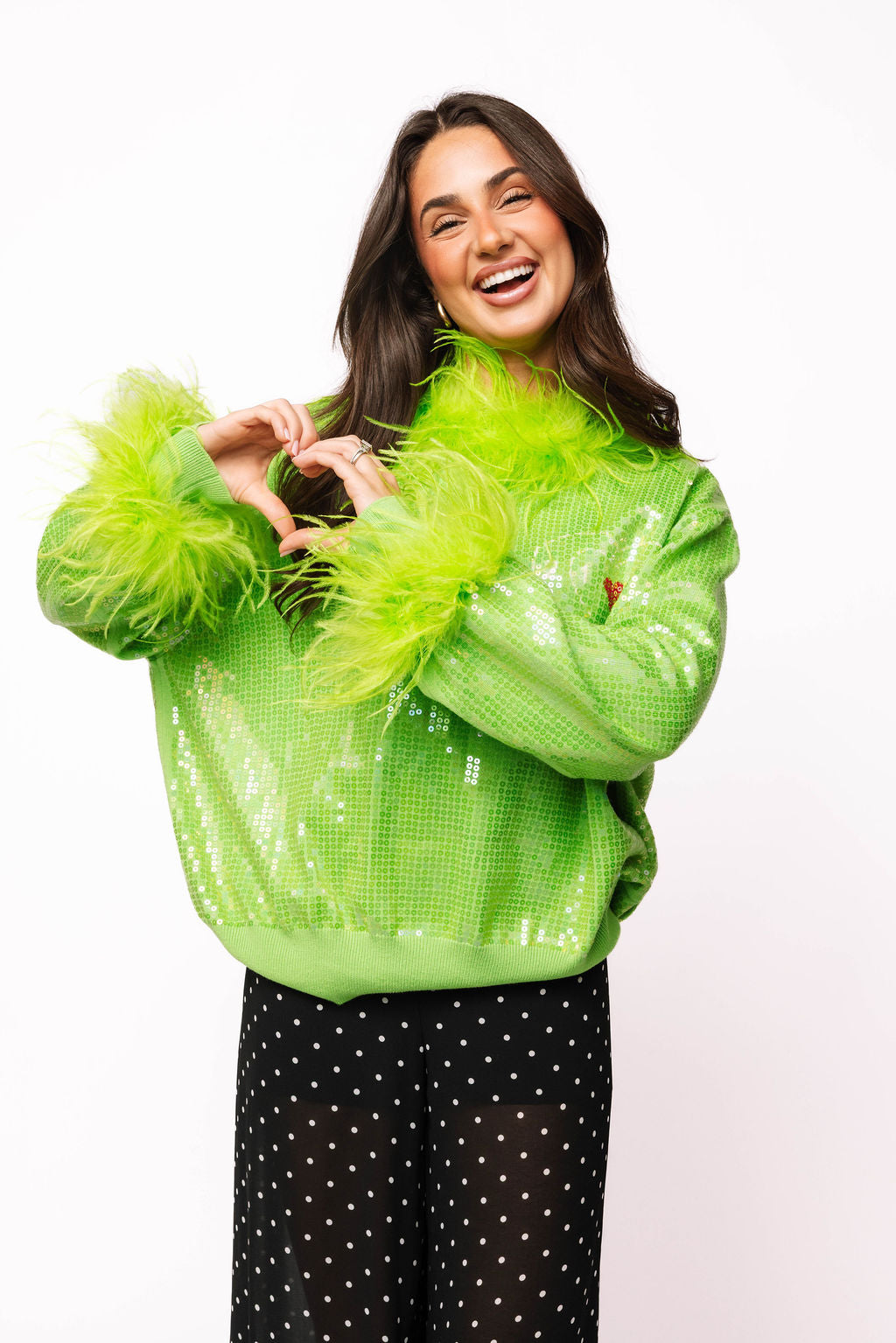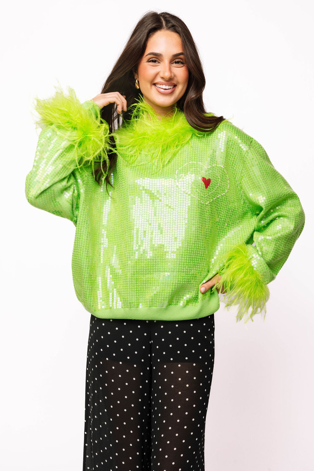 Celebrate the season in style with this playful green sweater that sparkles from head to toe. Covered in shimmering sequins and accented with soft feather trim at the collar and cuffs, it’s a festive nod to the Grinch’s iconic heart-growing moment. Perfect for holiday parties or cozy winter fun, this sweater brings bold sparkle and cheeky charm to your seasonal wardrobe.