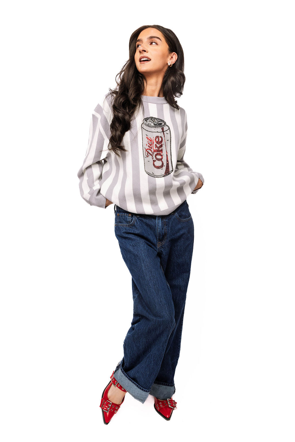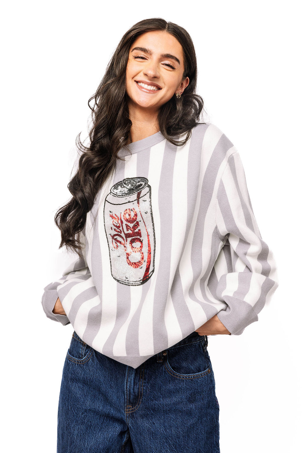 Stripes meet sparkle in this playful licensed sweater featuring an iconic Diet Coke® can design adorned with eye-catching sequins. The classic grey and white striped knit provides the perfect canvas for this fun, nostalgic graphic that's sure to turn heads. Perfect for anyone who loves bold fashion statements and a touch of retro-inspired flair.