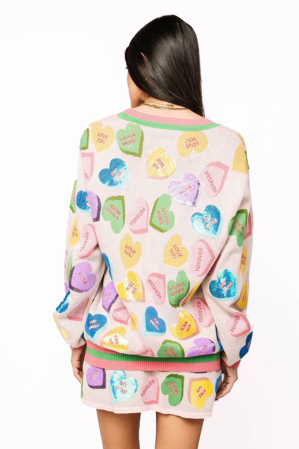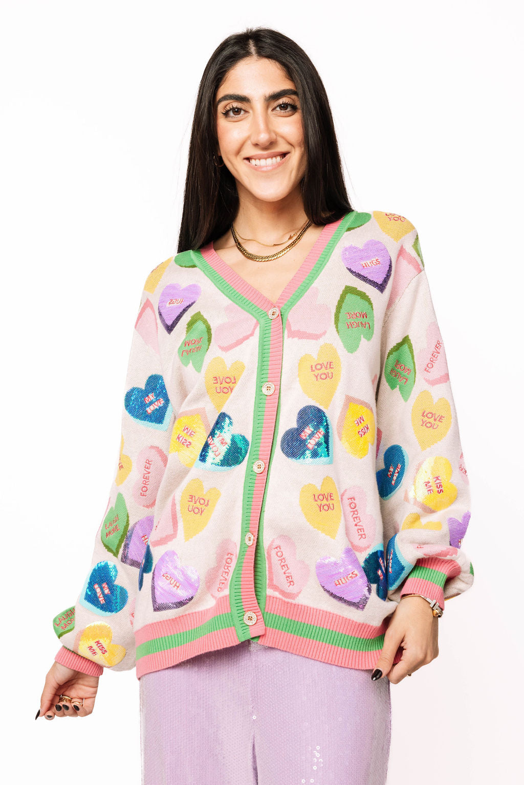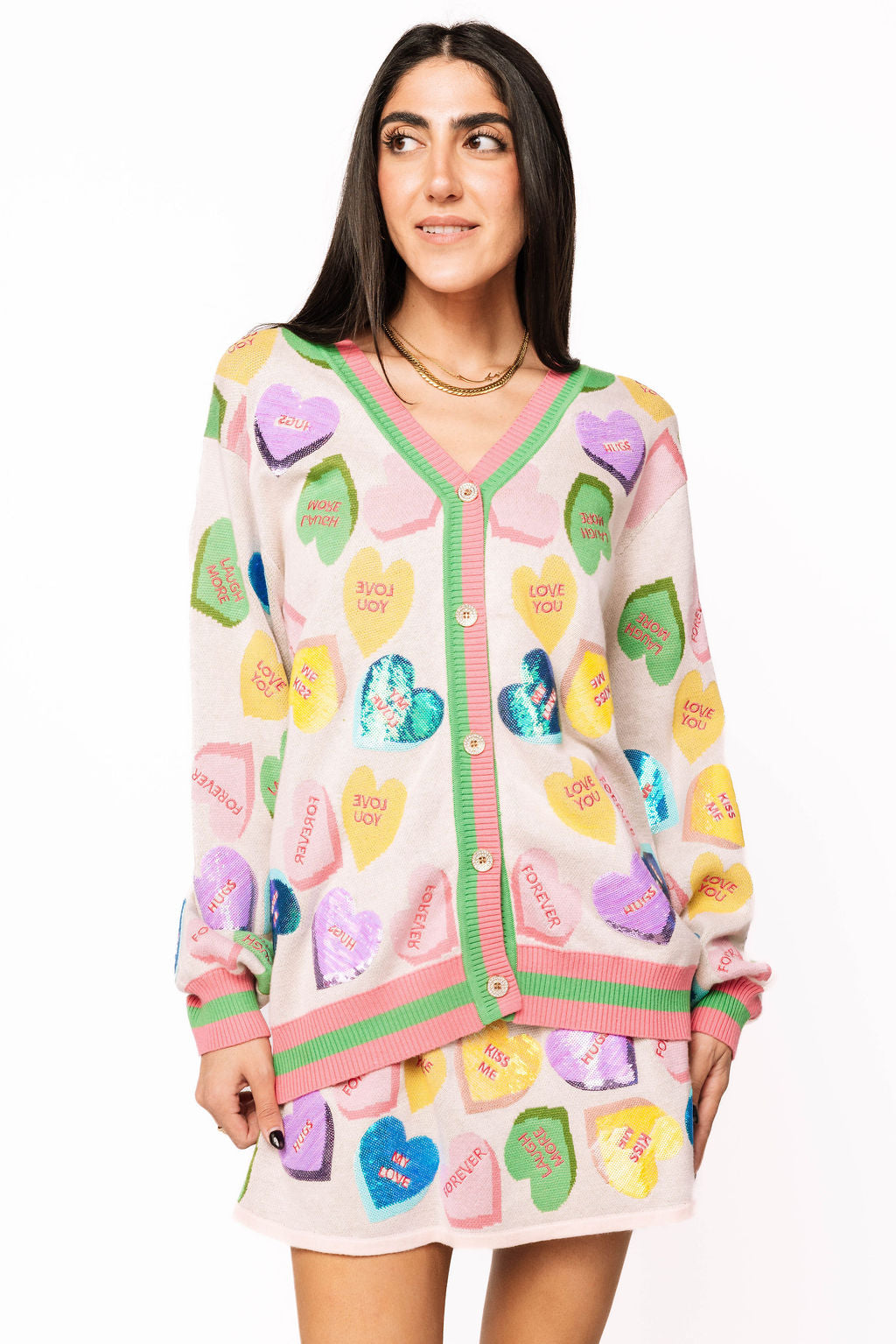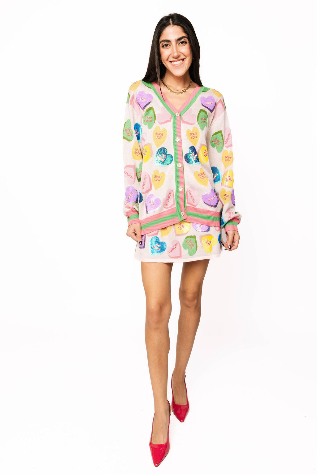 Spread the love in this adorable pale pink cardigan featuring a rainbow of candy sweethearts scattered across the front, each stamped with charming Valentine's sayings. The perfect playful layer for the season, this button-up style pairs beautifully with our matching skirt for a coordinated look that's equal parts sweet and fun. Whether you're celebrating love or just embracing your sparkly side, this cardigan brings instant charm and whimsy to any outfit.