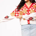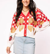 Cozy up this fall in our Red & White Apple Pie Button Up Cardigan, featuring a delightful checkered pattern sprinkled with charming apple pie slices. Perfect for Thanksgiving and those crisp autumn days, it brings a playful, sweet touch to your seasonal wardrobe. Stay warm and festive with this fun, pie-inspired knit!