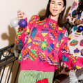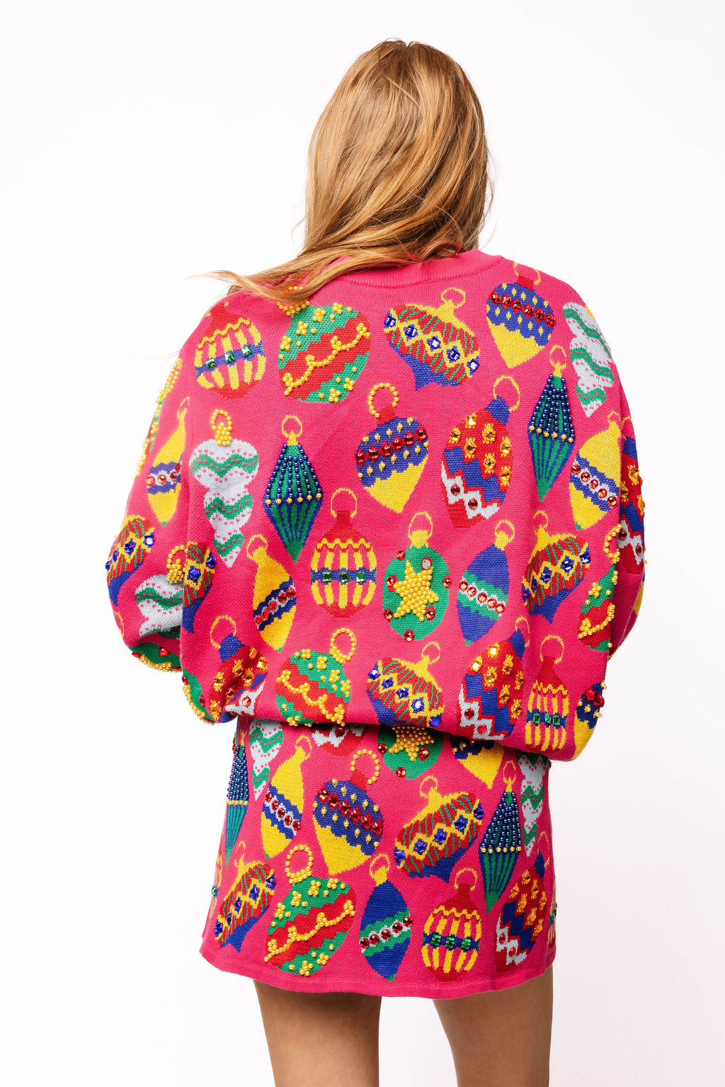 Brighten up the season with this Hot Pink Multi Jeweled Ornament Sweater. Its lively pink hue and sparkling jewel embellishments make it the perfect playful piece for festive fun. Cozy and eye-catching, this sweater adds a cheerful pop of color and charm to any holiday gathering. Celebrate in style and sparkle with every step!