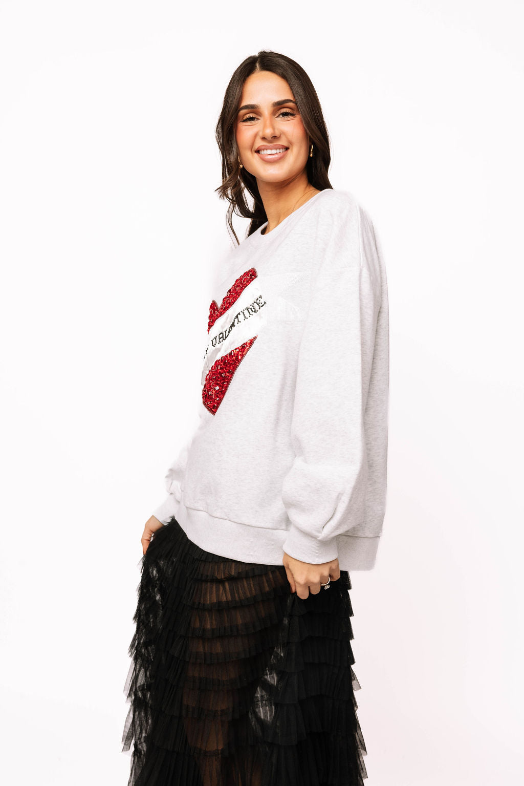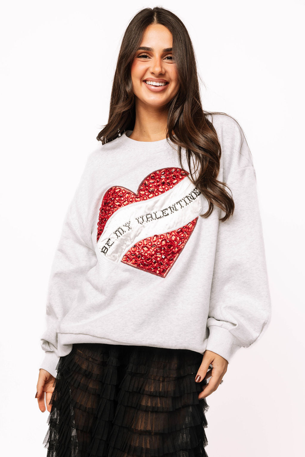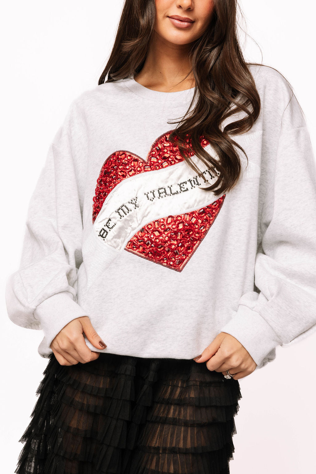 Wrap yourself in cozy charm with this delightful grey sweatshirt featuring a sparkling jeweled heart and the sweet message "Be My Valentine." Perfect for spreading love and romance, this playful piece combines comfort with eye-catching glamour. The intricate beaded heart design adds a touch of sparkle to your everyday look, making it ideal for Valentine's Day celebrations or year-round romance. Soft, stylish, and utterly adorable—your new favorite sweatshirt awaits!