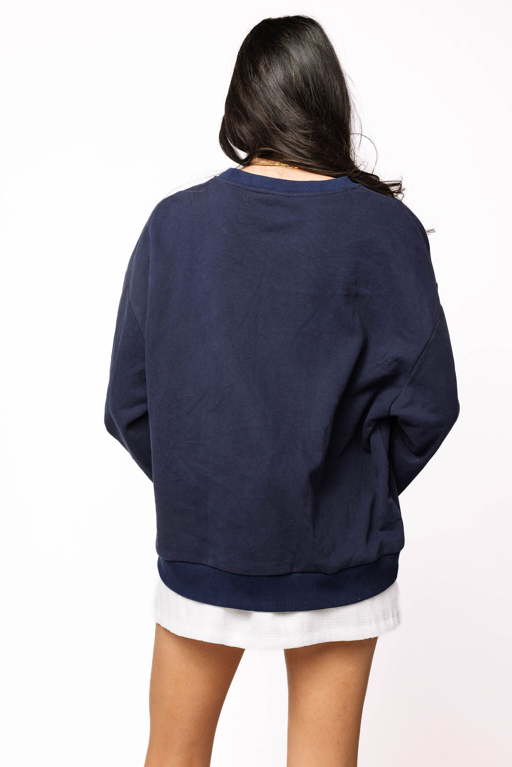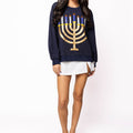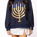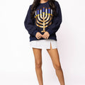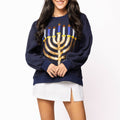 Stay cozy and spirited in this navy sweatshirt featuring a vibrant gold Menorah design. Perfect for celebrating with style, its soft fabric keeps you comfy while the bold gold detail sparks joy and conversation. Add a playful touch to your festive wardrobe with this bright and comfy essential.