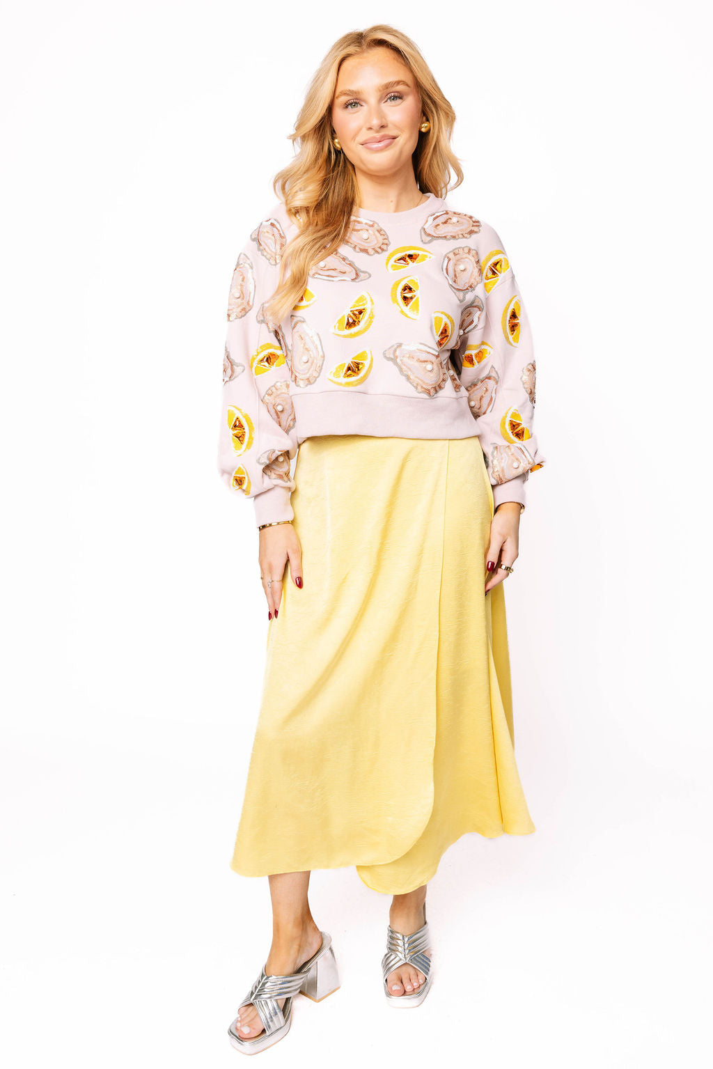 Brighten your wardrobe with this delightfully quirky pale pink sweatshirt featuring a whimsical oyster and lemon design adorned with shimmering sequins. Perfect for those who love a touch of sparkle and coastal charm, this cozy piece combines comfort with eye-catching style. The playful graphic adds personality to any casual outfit, making it an instant conversation starter. Whether you're heading out for a fun day or just want to add some shimmer to your everyday look, this sweatshirt delivers both comfort and charm in one fabulous package.