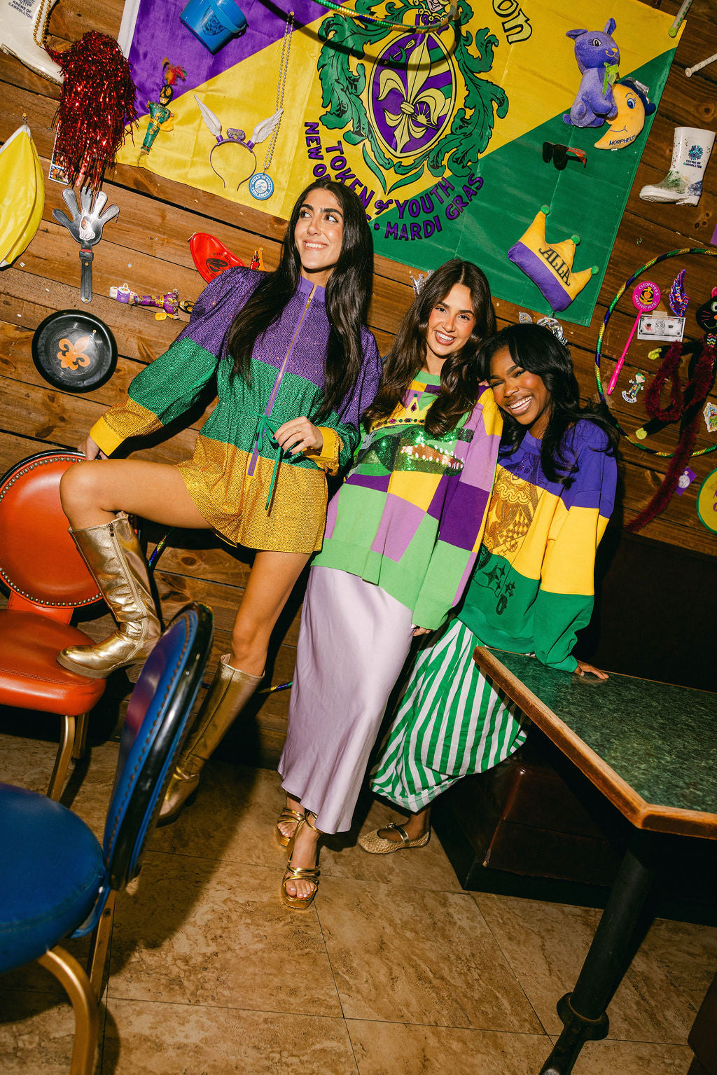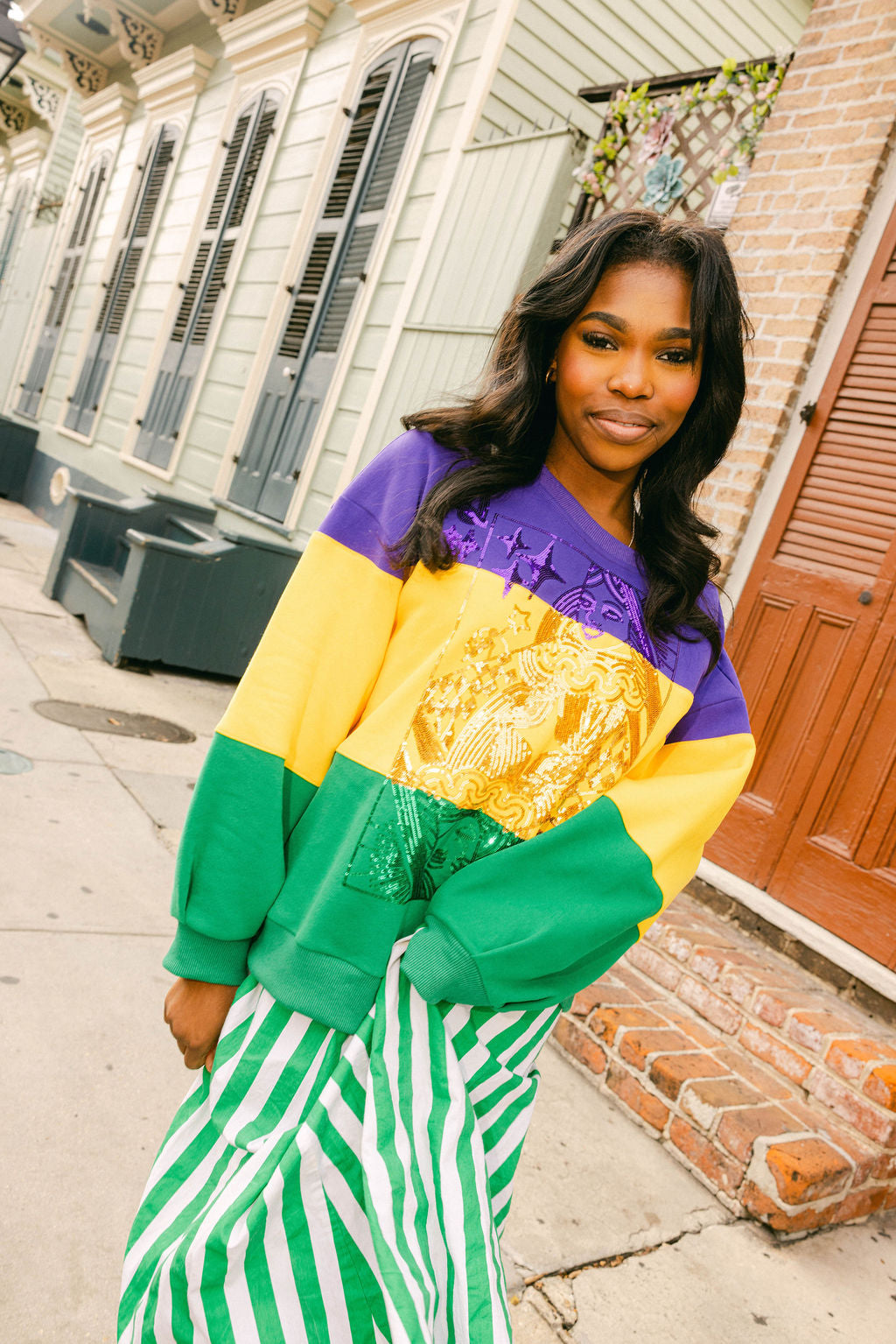 Reign supreme in Mardi Gras style with this vibrant striped sweatshirt featuring bold purple, yellow, and green bands paired with a regal gold queen card logo. Perfect for festival season, parade day, or whenever you're feeling like royalty, this playful piece celebrates the spirit of celebration and glamour. Comfortable enough for all-day wear, it's your ticket to standing out in the crowd and owning your queen status.