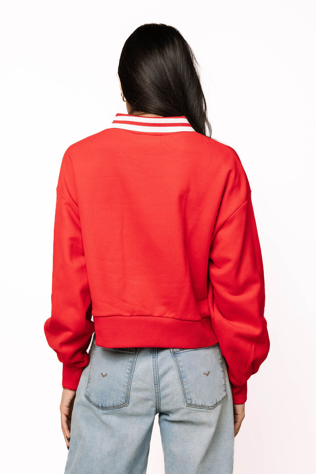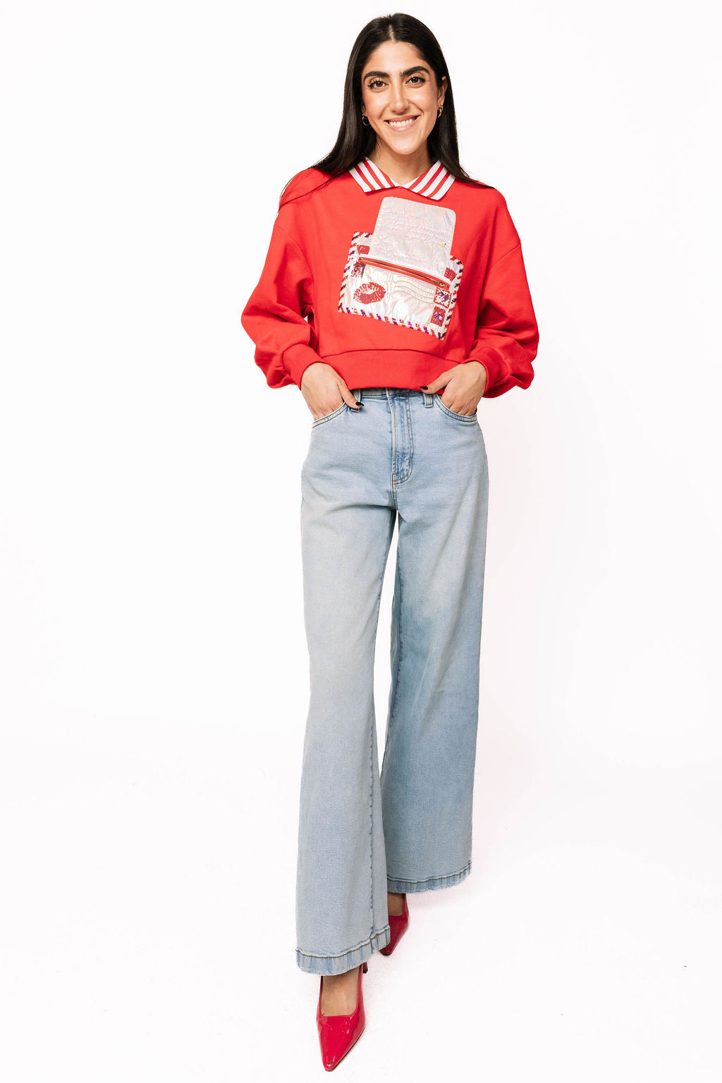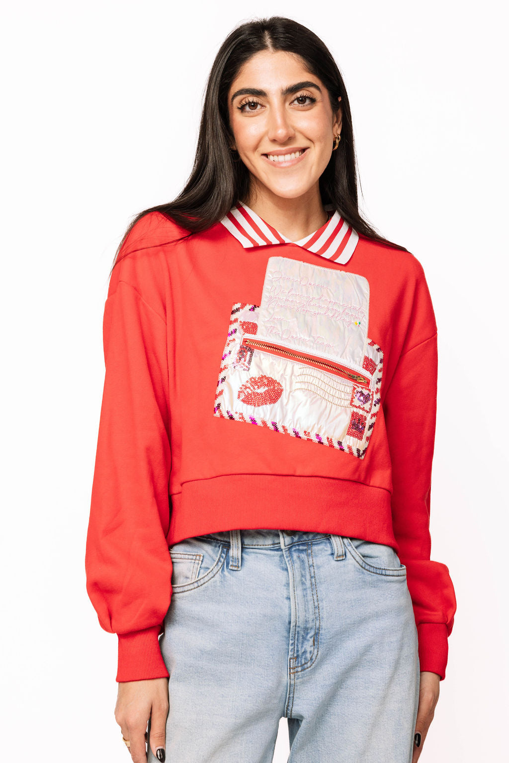 Spread the love this Valentine's Day in our charming red sweatshirt! Featuring a bold red and white striped collar and an adorable letter and envelope design on the front, this cozy piece has a playful twist—a functioning zipper pocket built right into the design. Perfect for stashing love notes, small treasures, or just adding an interactive element to your outfit. Soft, comfortable, and undeniably cute, it's the ideal way to wear your heart on your sleeve.