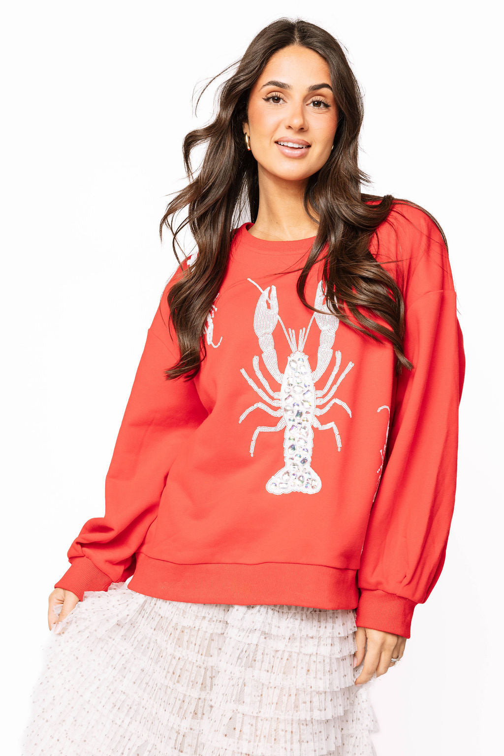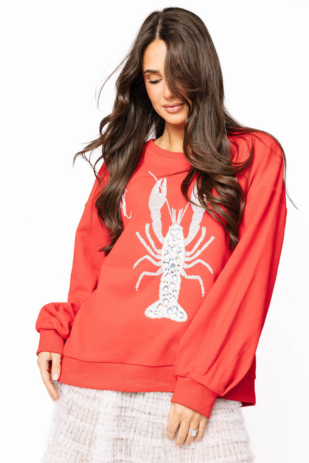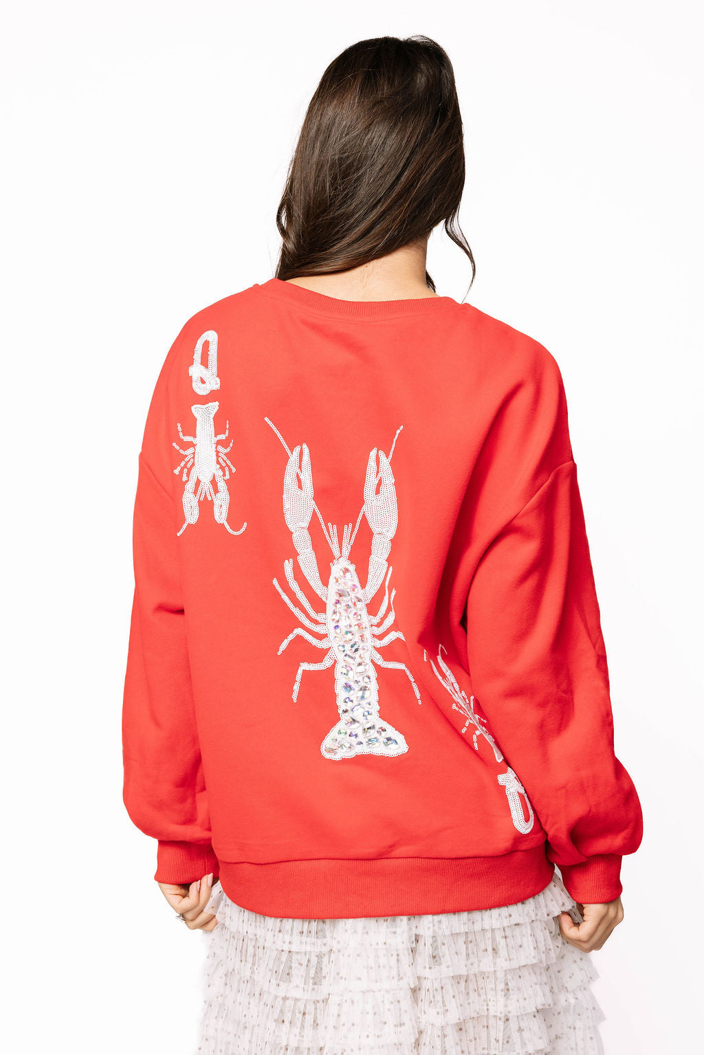Crawl into style with this vibrant red sweatshirt featuring a dazzling white sequin crawfish design inspired by a royal playing card. Perfect for celebrating your love of southern crawfish boils, this playful piece combines comfort with sparkle. The slightly oversized fit gives you that effortless, cozy vibe while the eye-catching crawfish graphic makes a bold statement. Whether you're heading to a boil or just want to show off your southern spirit, this sweatshirt is your crown jewel.