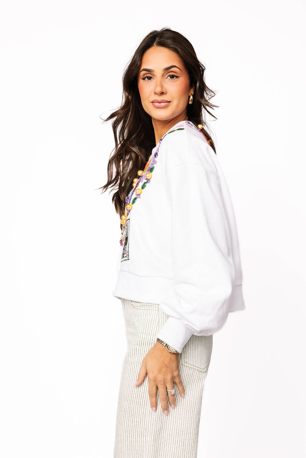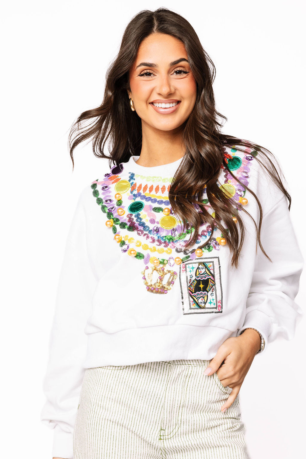 Celebrate in style with this white sweatshirt featuring a dazzling sequin Mardi Gras bead design. Perfect for festival season or anyone who loves bold, festive flair, this cozy piece combines comfort with eye-catching sparkle. The shimmering bead detailing brings the party vibes wherever you go. Whether you're hitting the streets or just channeling that Mardi Gras energy, this sweatshirt is your ticket to standing out in the crowd.