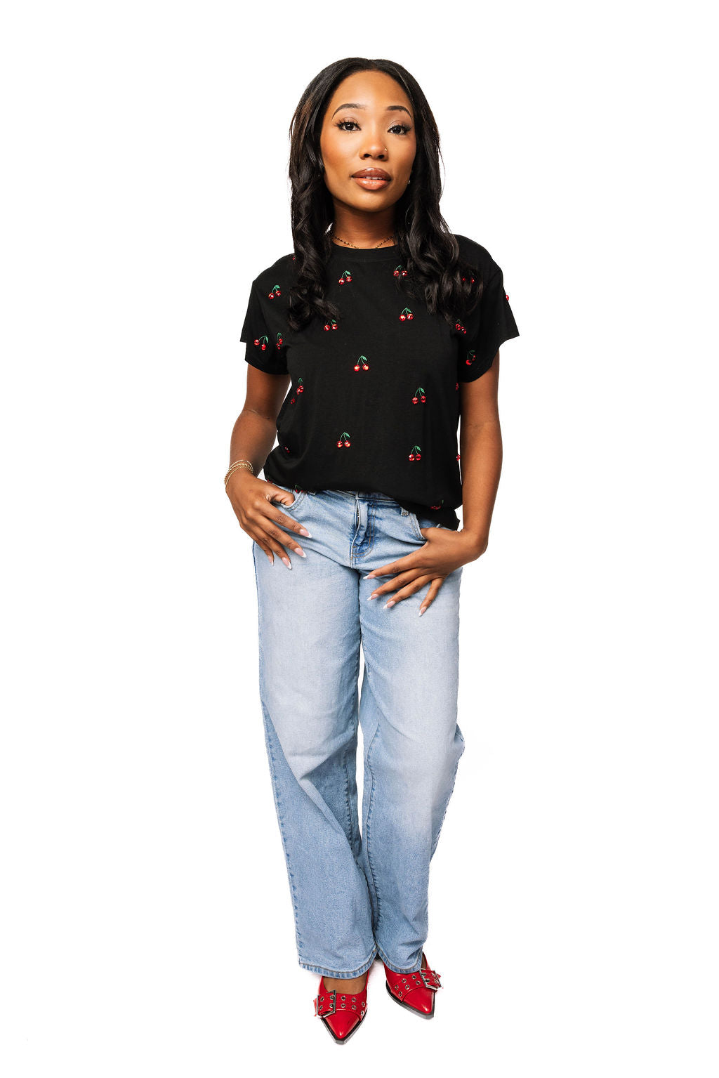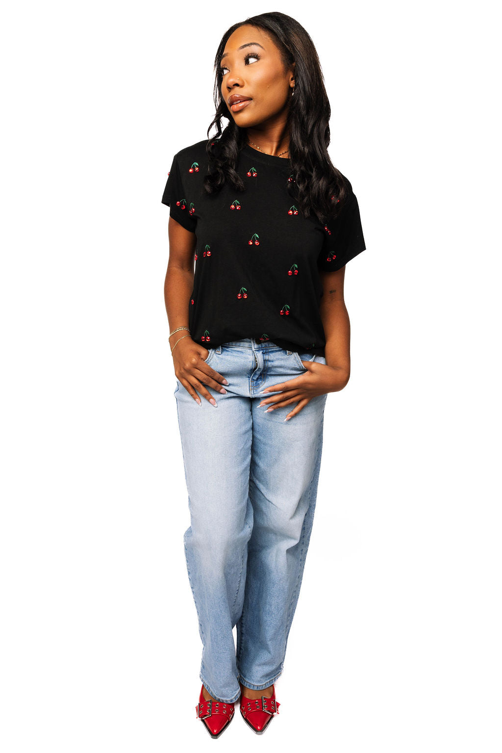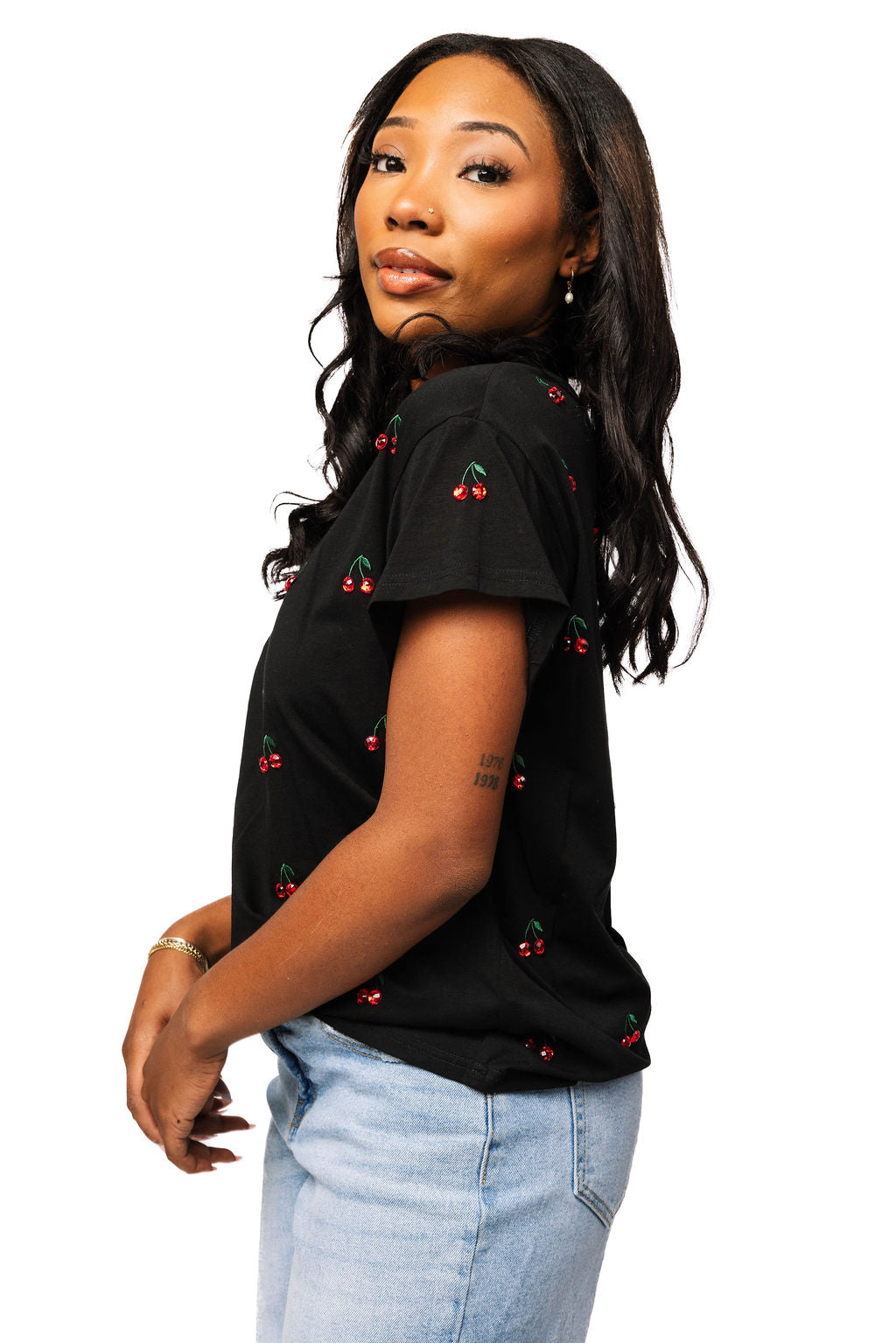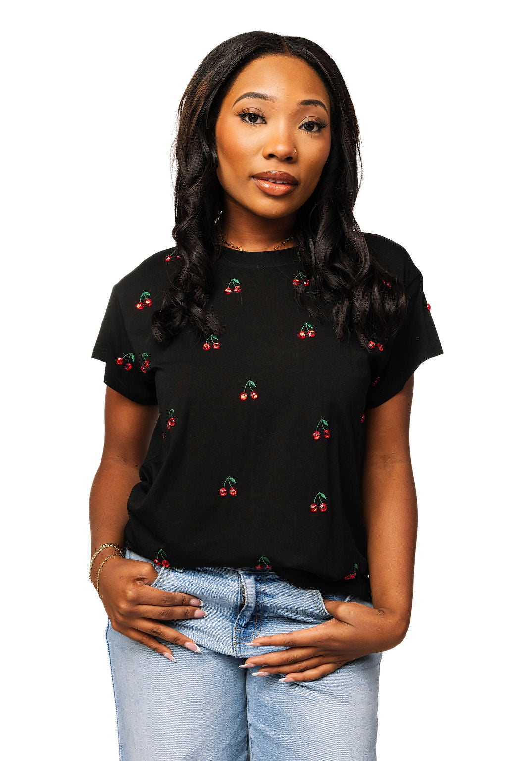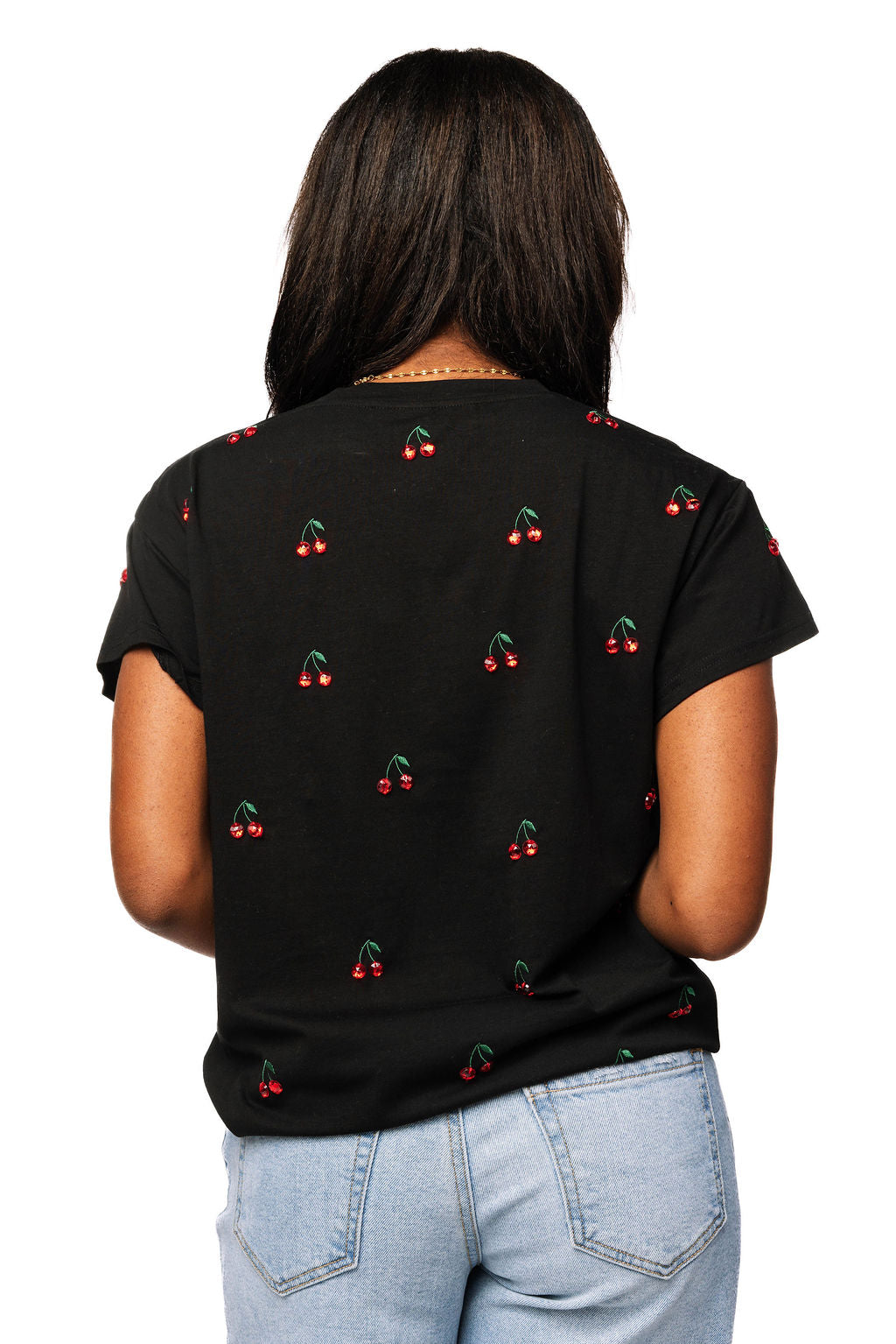 Rock a playful vibe with this black mini tee featuring scattered jeweled cherry designs across the front and back. The sparkling embellishments add just the right amount of glam to your everyday look, making it perfect for anyone who loves a little extra sparkle. Comfortable, cute, and totally eye-catching—this tee is your new go-to piece for standing out in style.