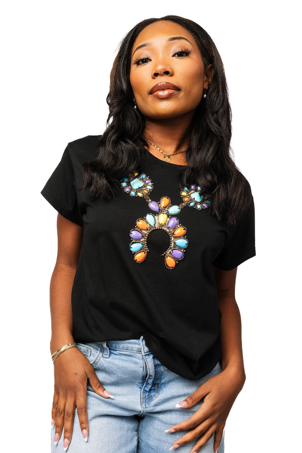 Rock a bold statement with this black tee featuring a vibrant multi-color turquoise necklace design. The eye-catching graphic brings instant personality to your everyday wardrobe, perfect for anyone who loves to mix edgy style with colorful flair. Comfortable, versatile, and undeniably fun—this tee is your new go-to piece for standing out in the best way possible.