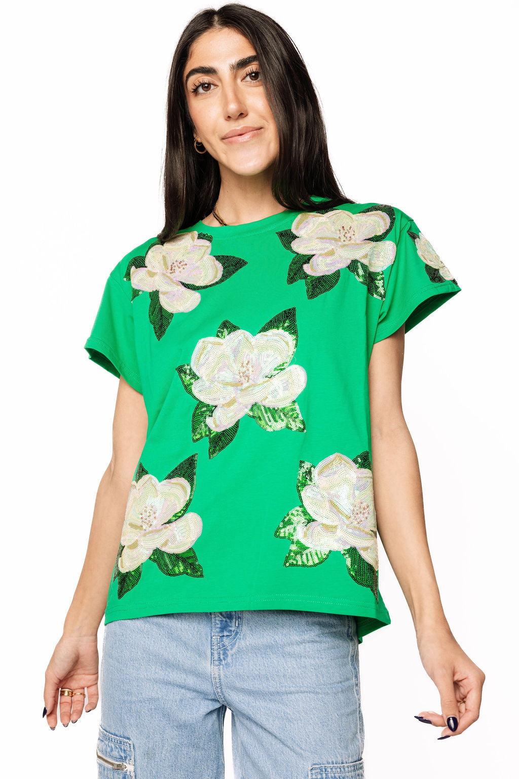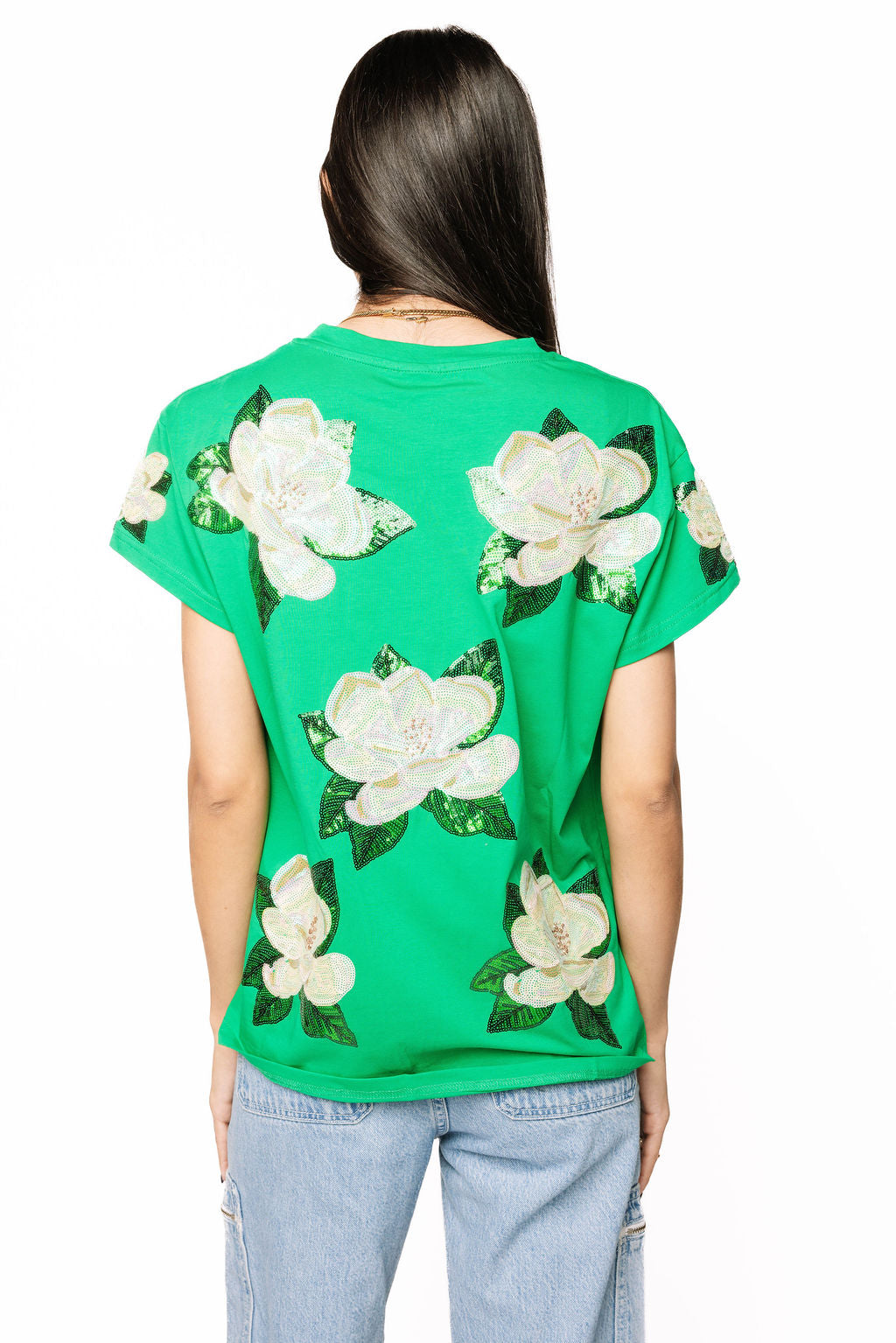 Bloom in style with this vibrant green tee featuring a stunning sequin magnolia design that sparkles on both the front and back. Perfect for making a botanical statement, this playful piece combines comfort with eye-catching glamour. Whether you're heading out for a casual day or want to add some floral flair to your wardrobe, this tee delivers sparkle and sophistication in one fabulous package.