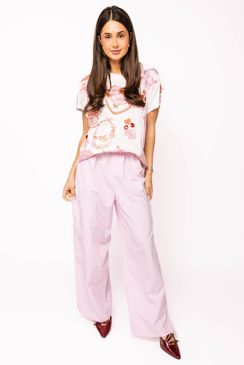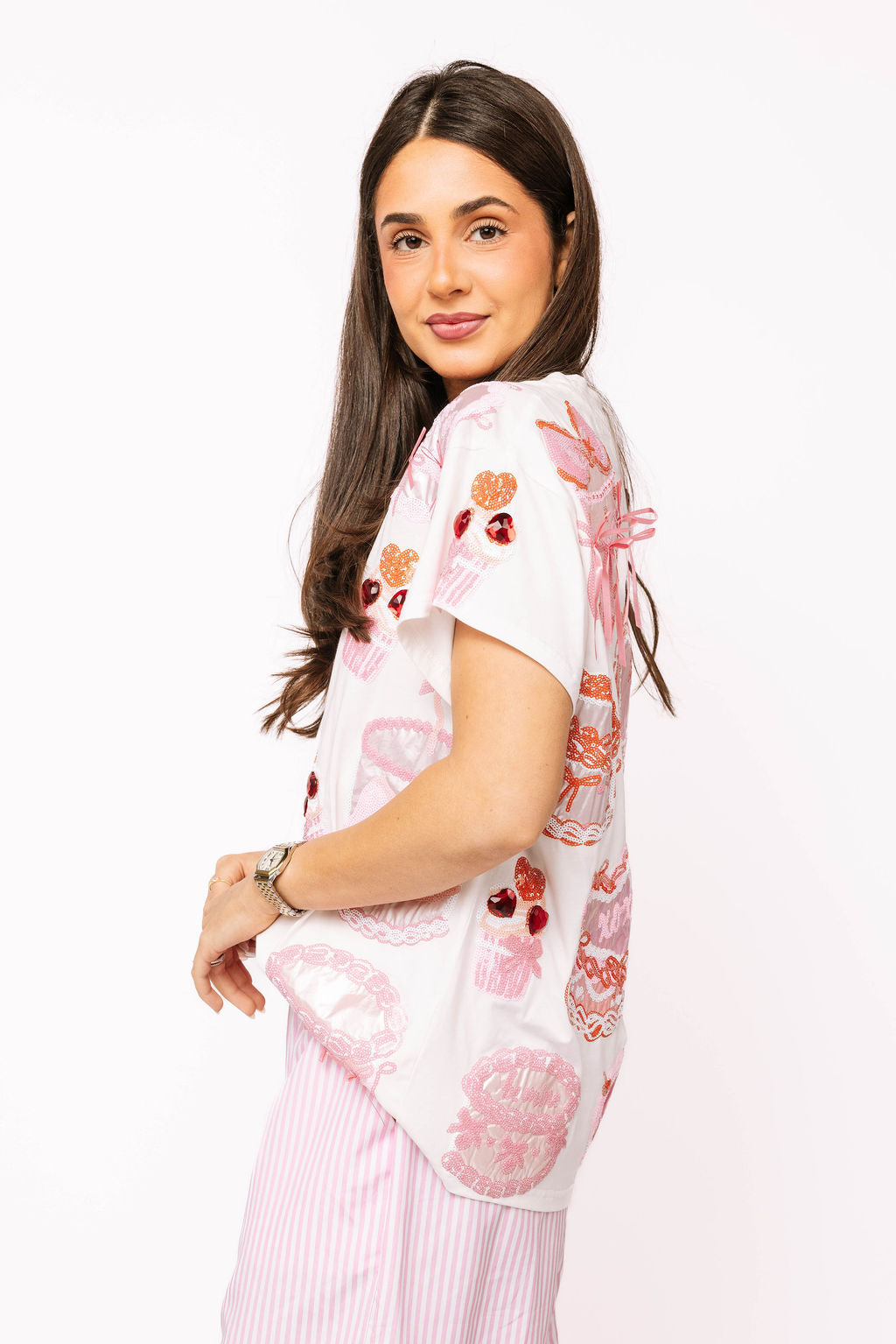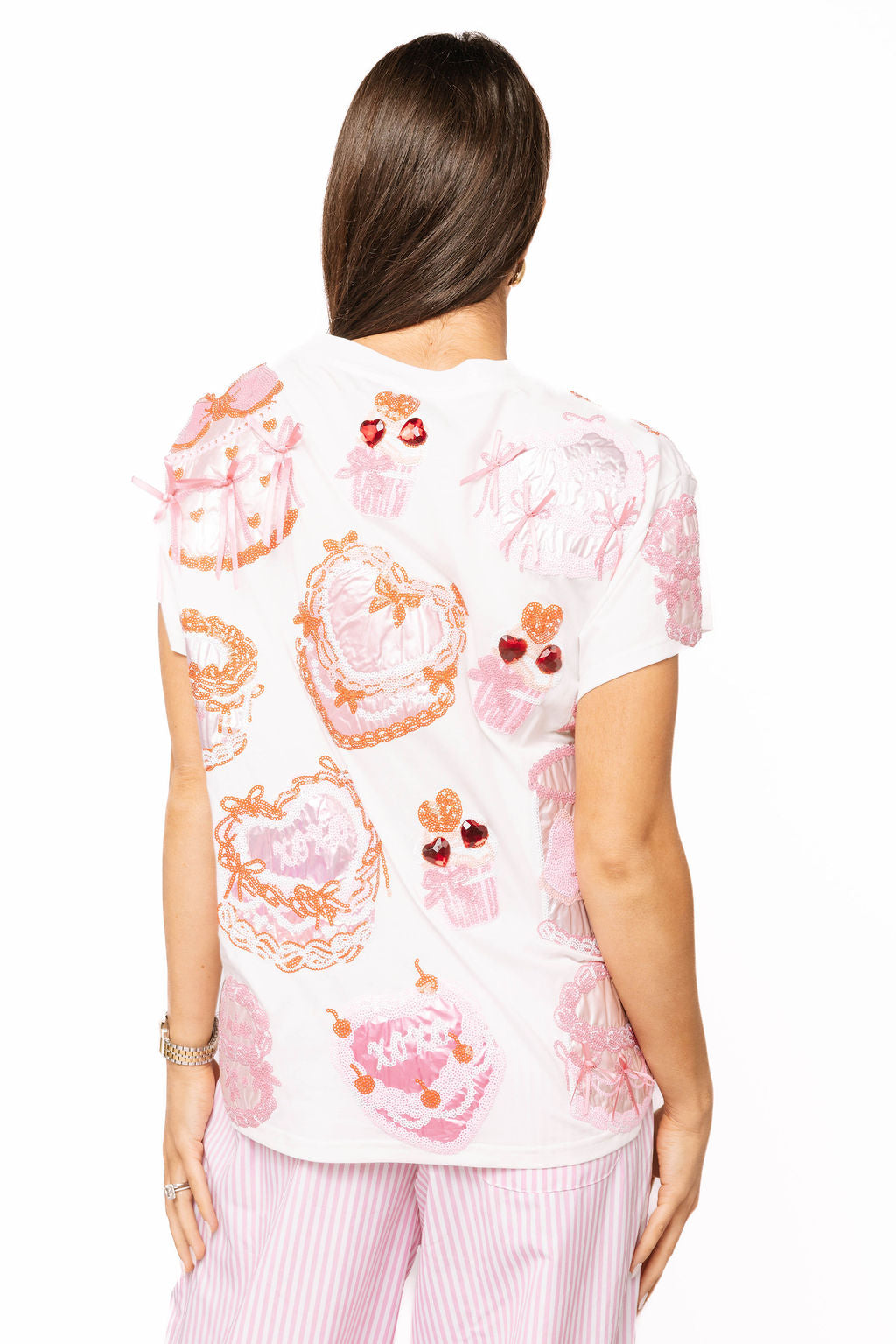 Sweeten your wardrobe with this delightful white tee featuring adorable pink valentine cakes and pastries scattered across the front and back. Perfect for dessert lovers and romantic souls, this playful design brings a sprinkle of sugary charm to your everyday style. Soft, comfortable, and bursting with personality, it's the sweet treat your closet has been craving.