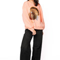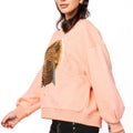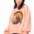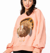 Celebrate Thanksgiving in style with this peach oversized sweatshirt, featuring a dazzling sequin turkey design. Its cozy, roomy fit keeps you comfortable all day while adding a playful, festive vibe to your holiday outfit. Perfect for family gatherings or casual fall fun, it’s your go-to for a sparkling seasonal look.