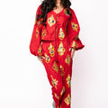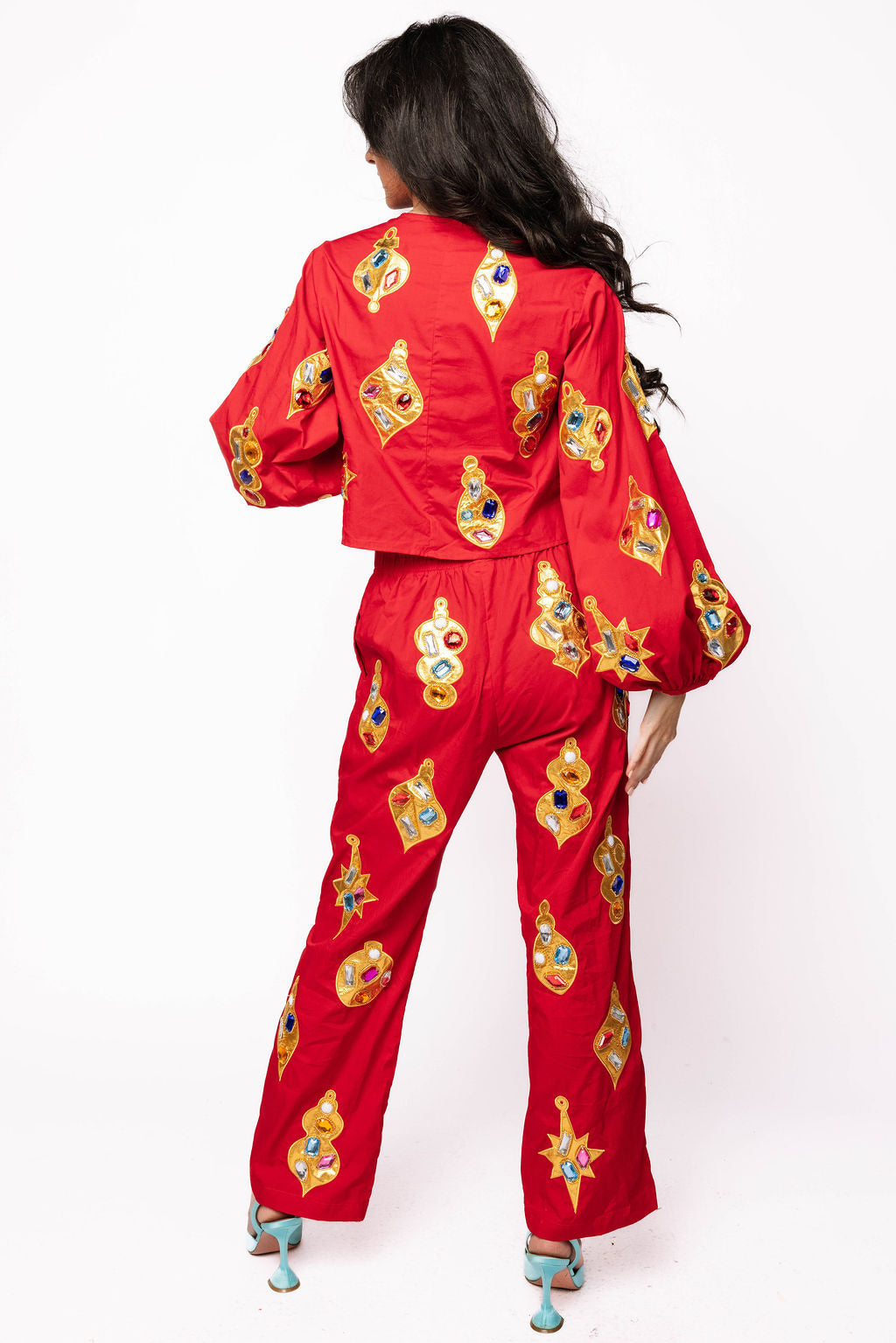 Add a splash of festive fun to your wardrobe with this Red & Gold Jeweled Ornament Cotton Tie Up Top. Crafted from soft cotton, it features sparkling jeweled accents and a playful tie-up front, perfect for adding charm and cheer to any outfit. Whether dressing up or down, this top brings a joyful pop of color and sparkle that shines bright all season long.