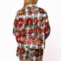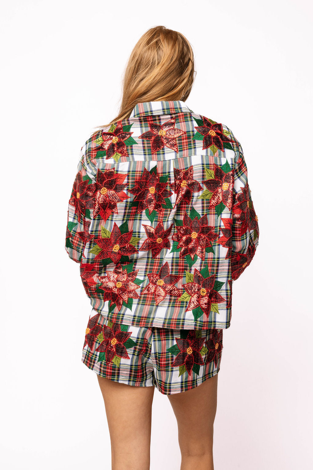Add some festive sparkle to your wardrobe with this playful red, green, and white plaid button-up top adorned with sequined poinsettias on both front and back. Made from soft cotton, it’s as cozy as it is cheerful. For the full holiday vibe, pair it with the matching shorts and shine bright all season long!