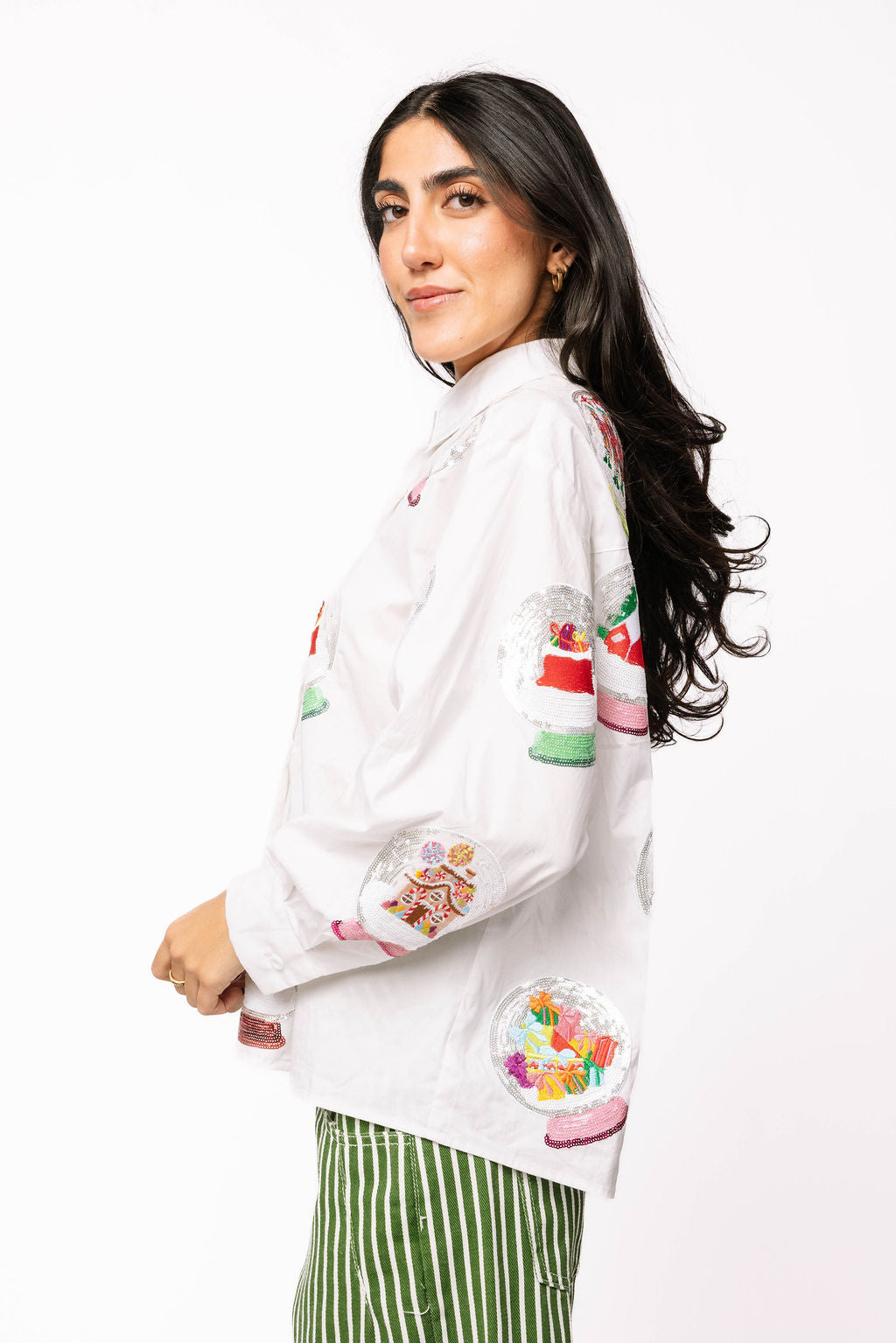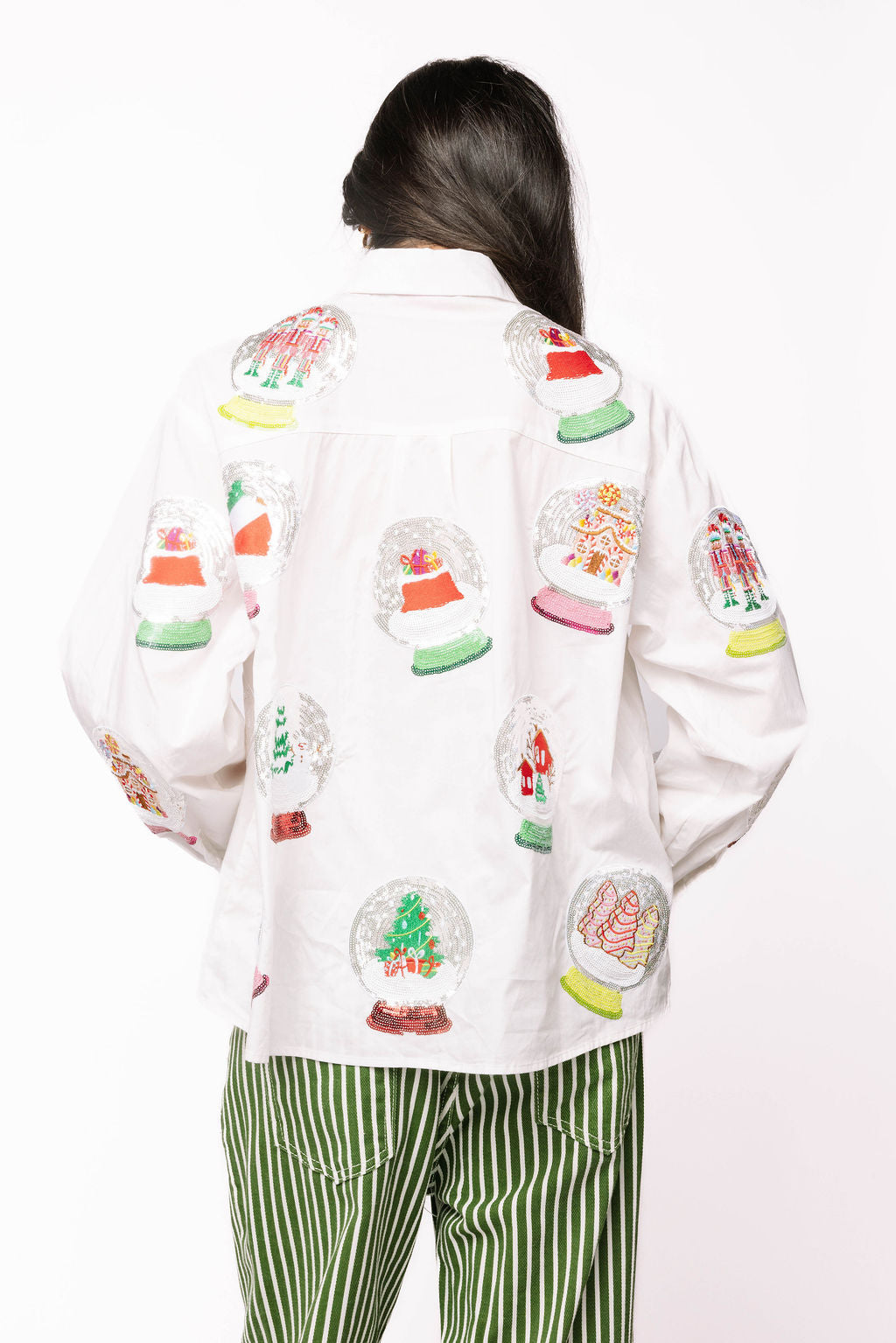 White Cotton Snow Globe Button Up Long Sleeve Top