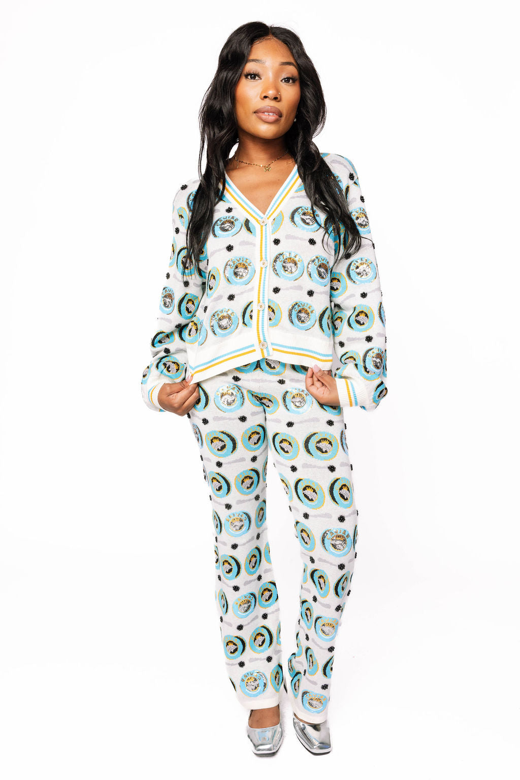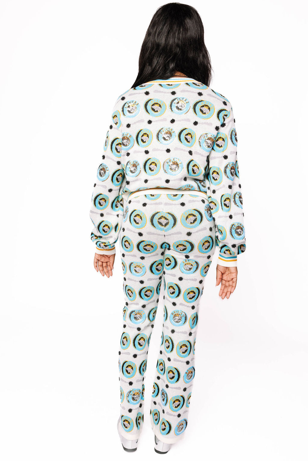 Strut around in these luxe knit pants featuring a cheeky caviar can and spoon pattern that celebrates the finer things in life. Soft, stretchy, and undeniably fun, they're perfect for anyone who refuses to take themselves too seriously. Mix and match with your favorite tops for an outfit that's equal parts comfort and glamorous humor. Indulgence never felt so cozy.