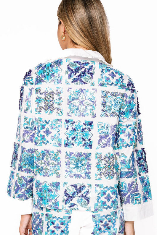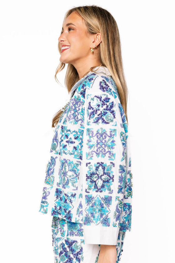 Elevate your everyday style with this charming white cotton blouse that brings the perfect blend of sophistication and whimsy. The playful tie-front neckline adds a flirty touch, while the standout fun collar frames your face beautifully. Adorned with a stunning sequin blue and white Italian tiles design, this long-sleeve top transforms a classic silhouette into a conversation starter. Perfect for brunch dates, creative workdays, or whenever you want to sparkle a little brighter. A versatile piece that proves timeless elegance and playful personality can absolutely coexist.