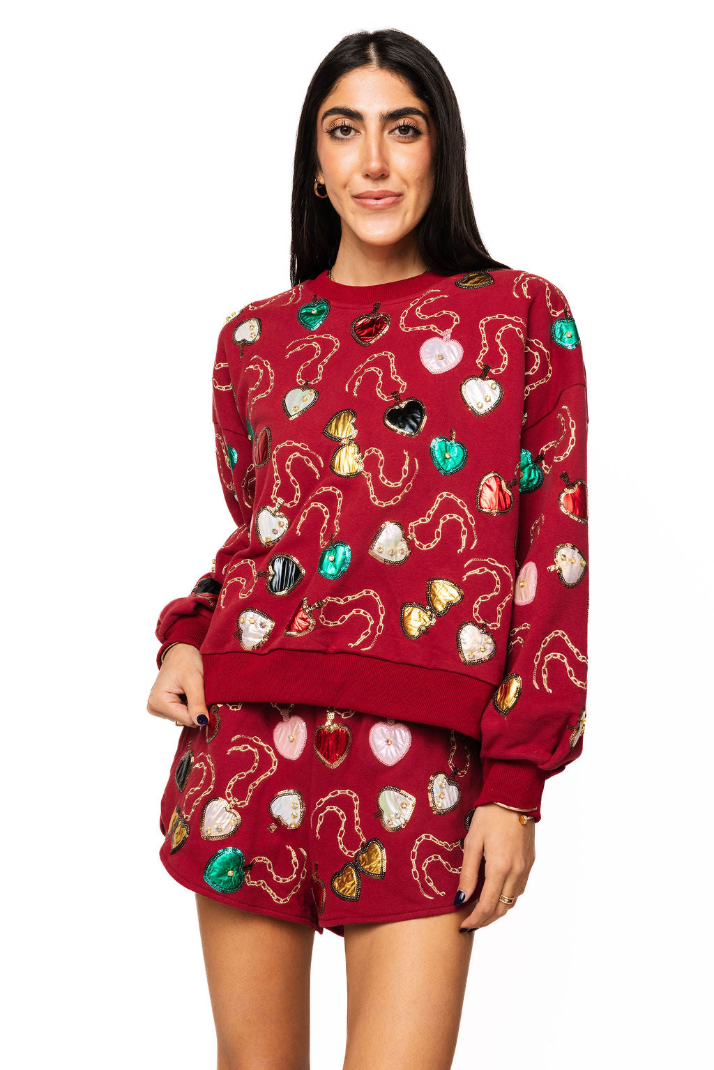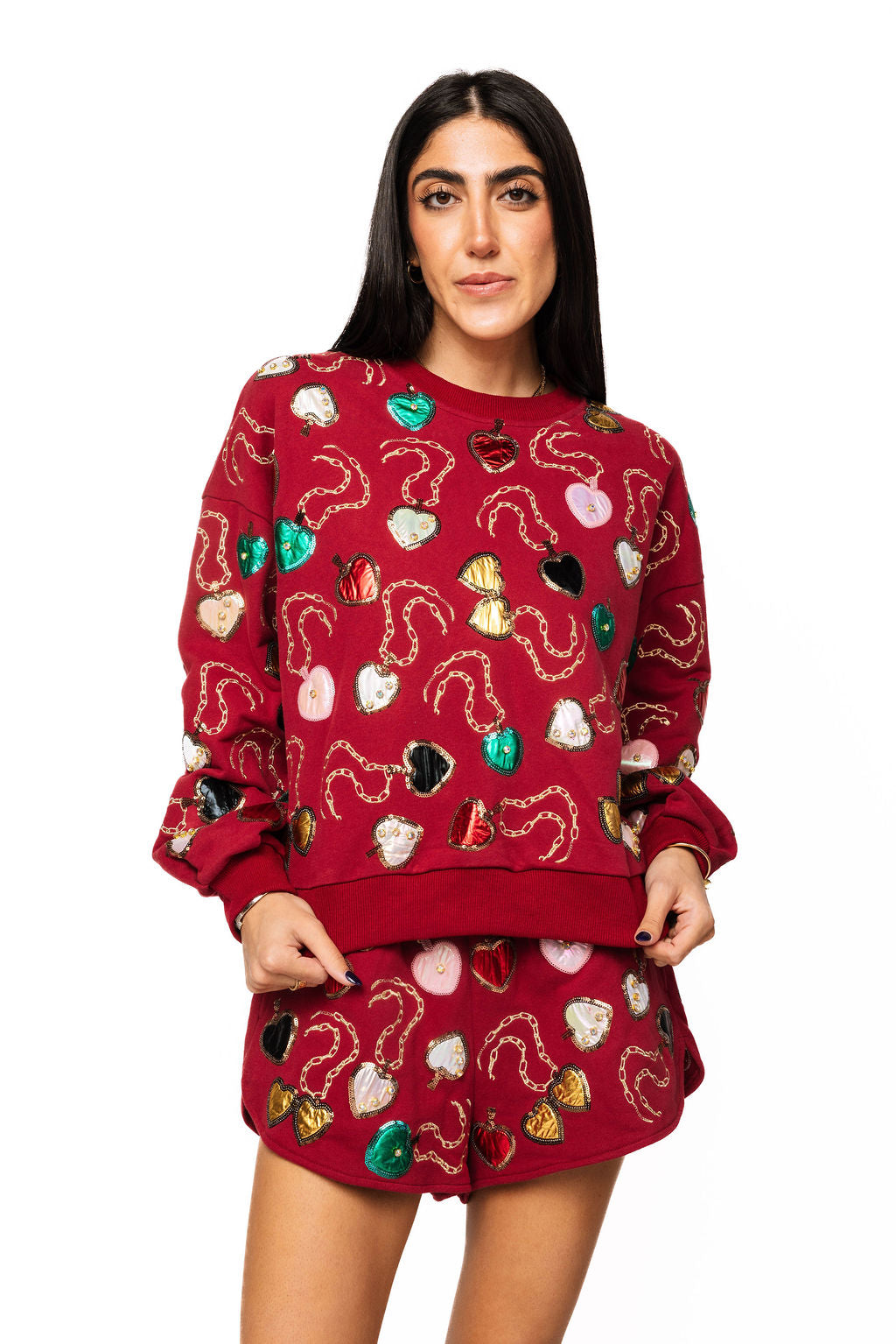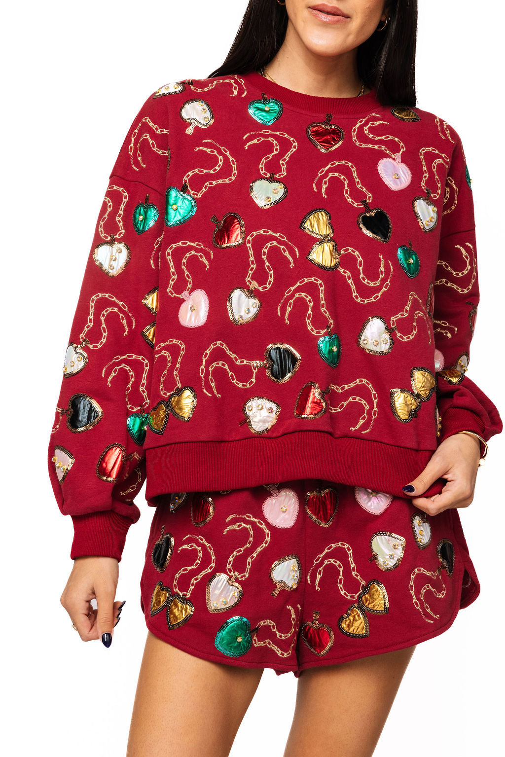 Steal hearts in this enchanting Maroon Multi Heart Lockets Sweatshirt and Short Set! Featuring delicate heart locket designs in vibrant multi-colors against a rich maroon backdrop, this cozy matching set brings romance and whimsy to your wardrobe. The soft sweatshirt pairs beautifully with comfortable shorts for a look that's equal parts sweet and sassy. Whether you're channeling your inner romantic or just love adorable details, this set is your ticket to looking absolutely charming!