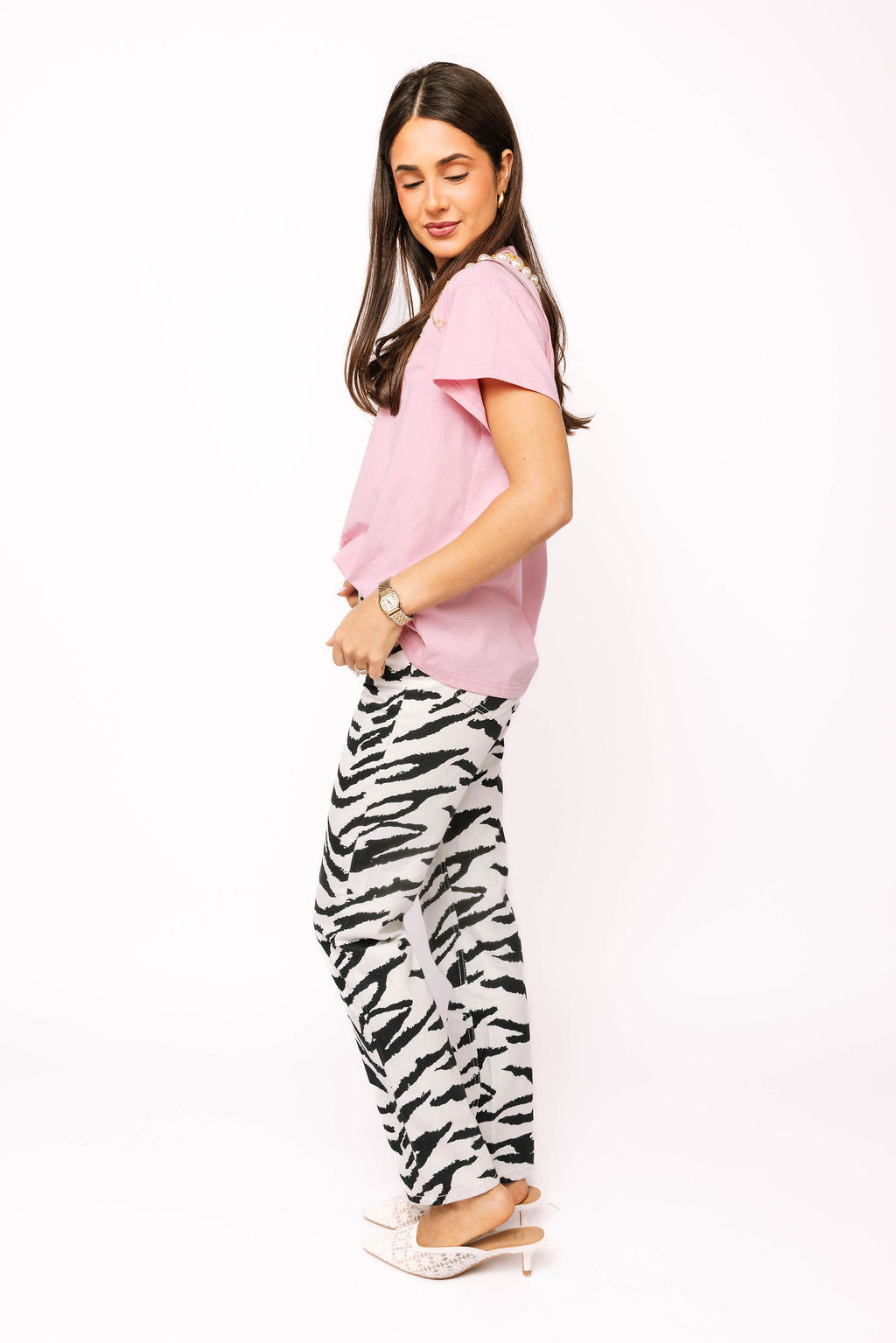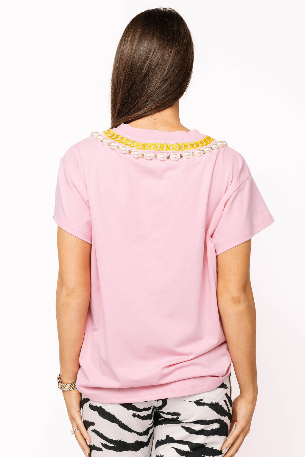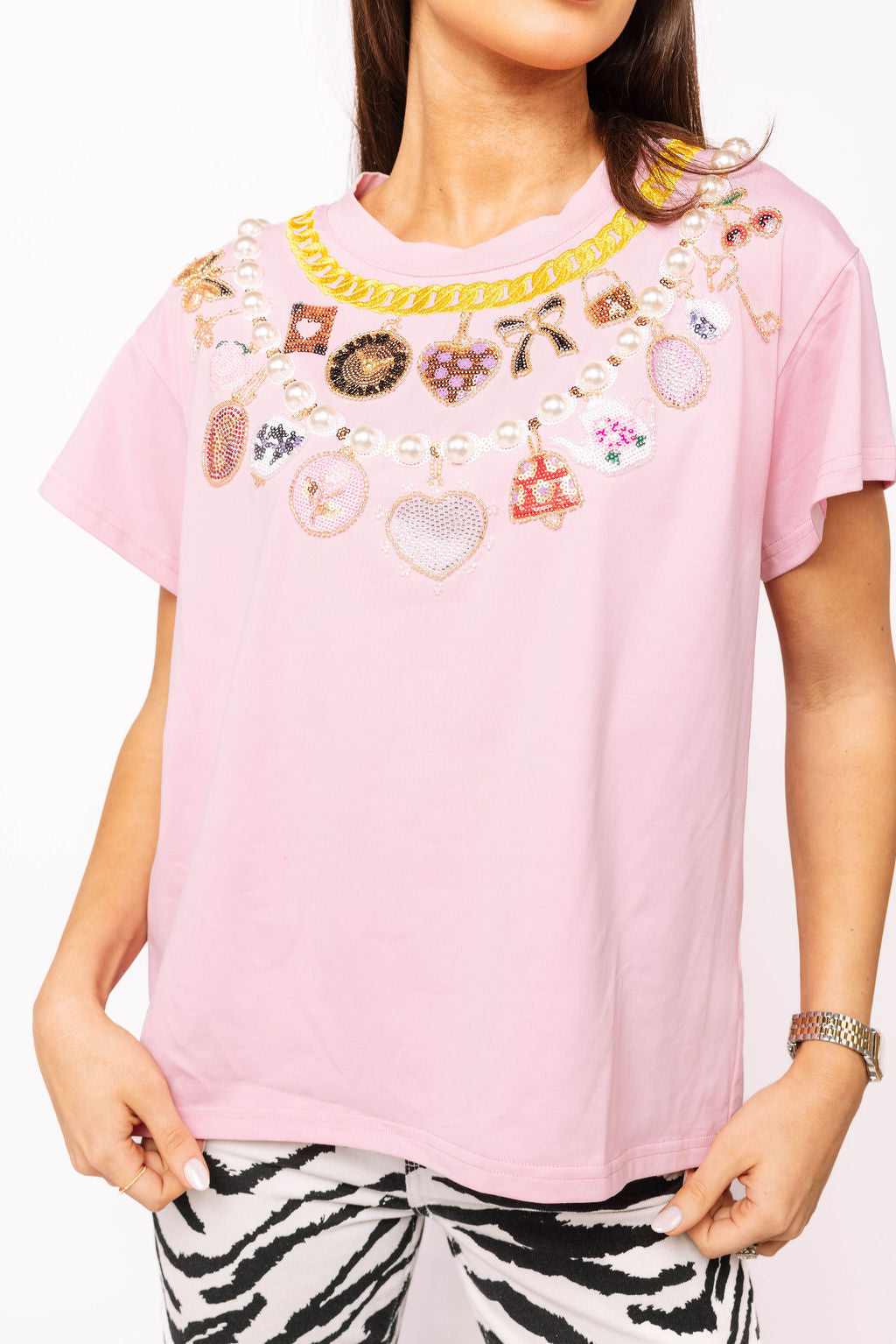 Hot Pink Pearl & Chain V Day Charm Necklace Tee