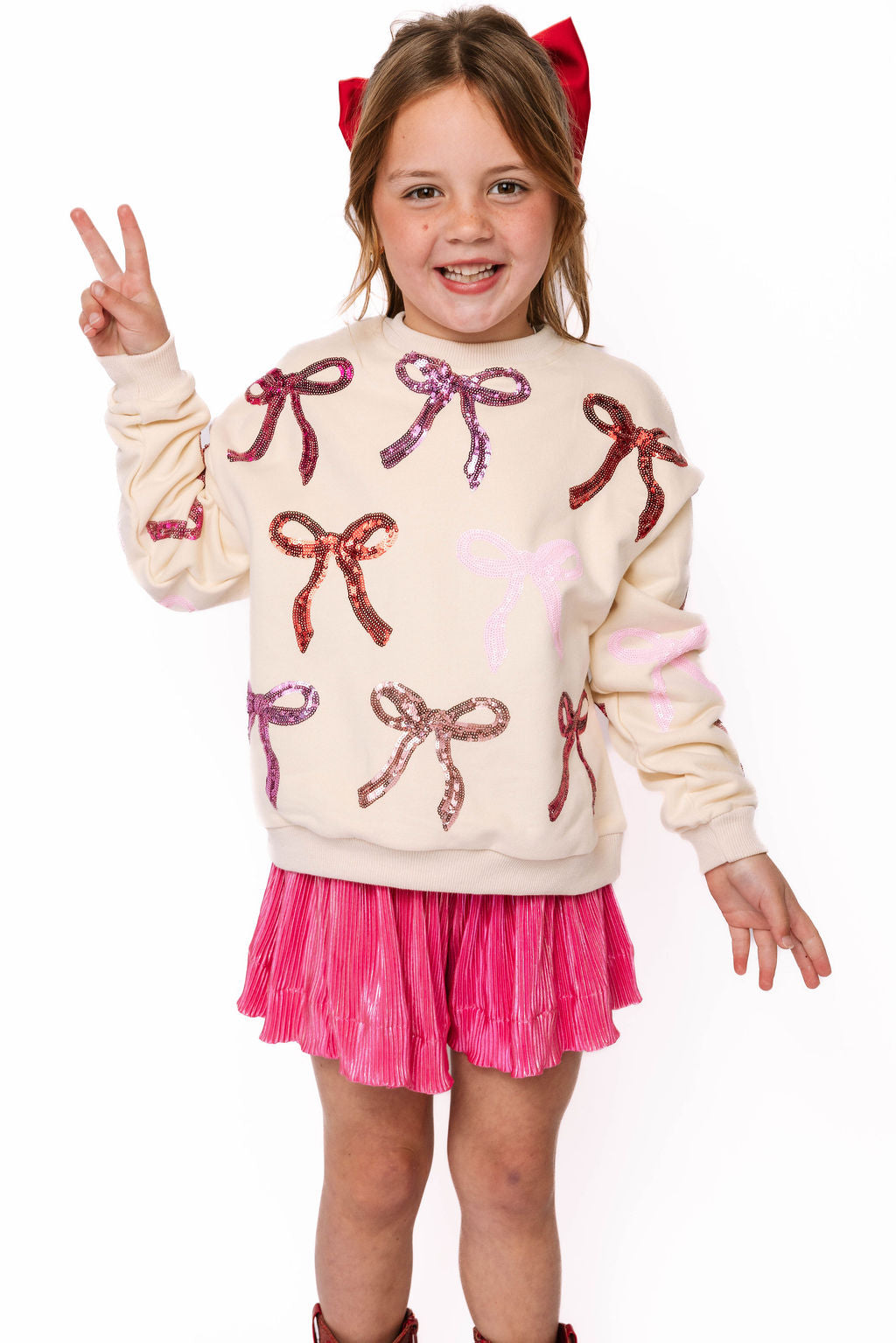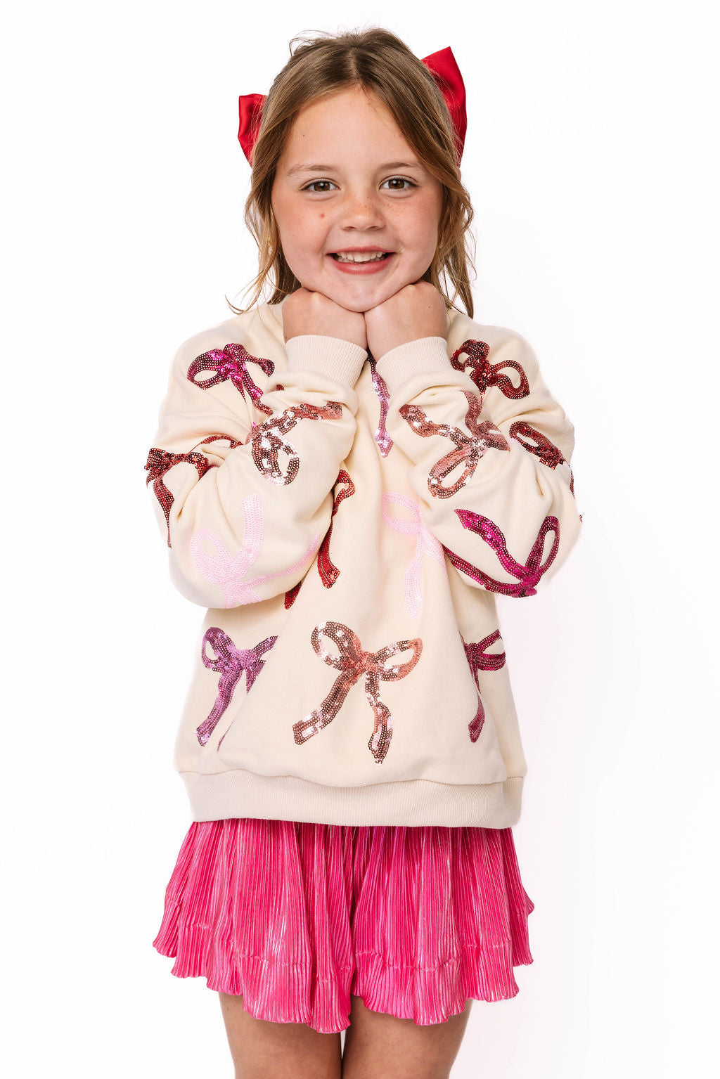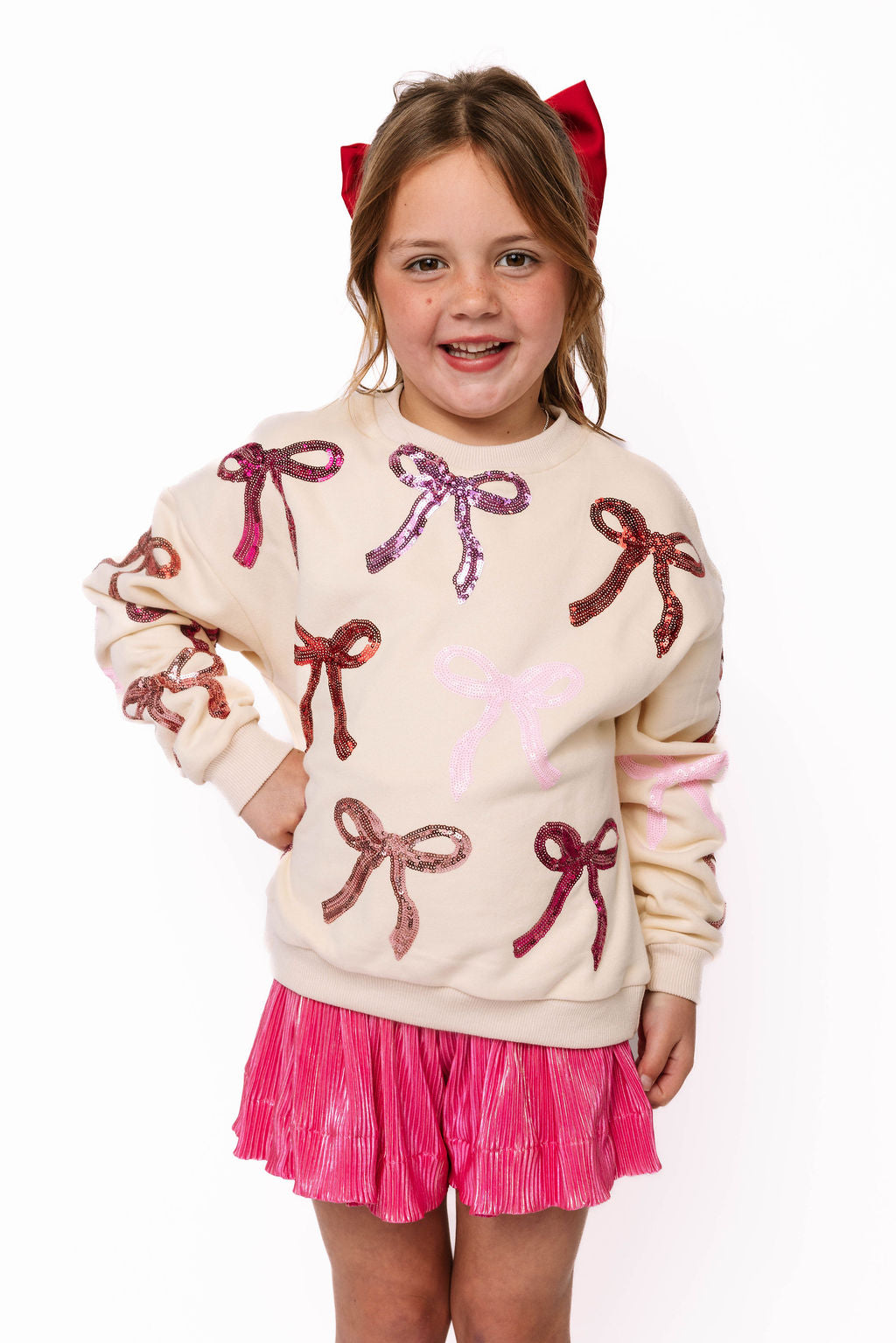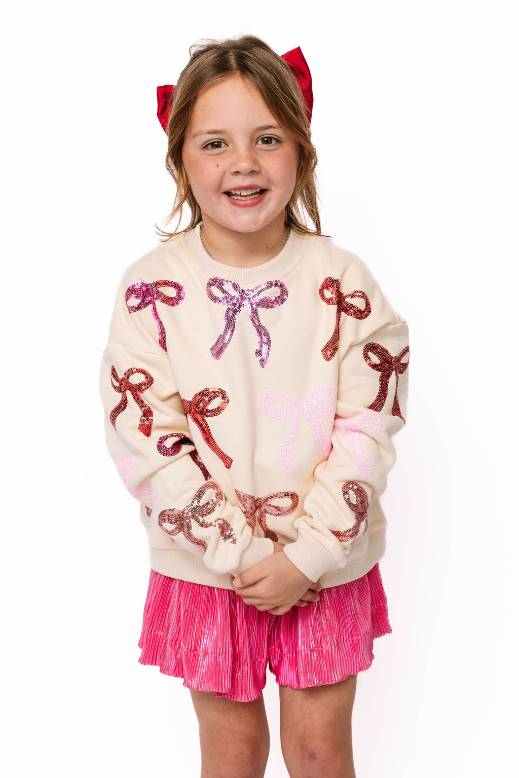 Adorable beige sweatshirt featuring eye-catching pink and red sequin bows on both the front and back. Perfect for creating a coordinated mom-and-me moment with our matching adult version. Your little one will love the sparkly details that catch the light with every twirl and play session. Soft, comfortable, and absolutely Instagram-worthy!