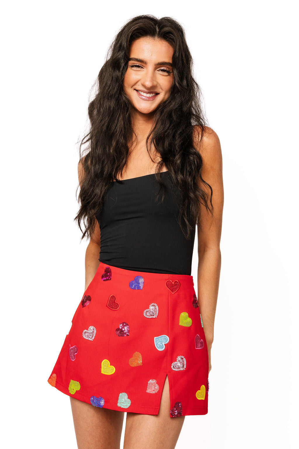 Strut your stuff in this show-stopping red mini skirt that's basically a love letter to sparkle! Adorned with vibrant multi-color rhinestone hearts scattered across the fabric, this piece brings the glam and the fun in equal measure. Perfect for anyone who believes more sparkle is always the answer, this skirt pairs effortlessly with your favorite crop top or bodysuit for a look that screams confidence and charm. Whether you're hitting the dance floor or turning heads at a night out, this rhinestone-studded beauty ensures you'll be the most dazzling person in the room.