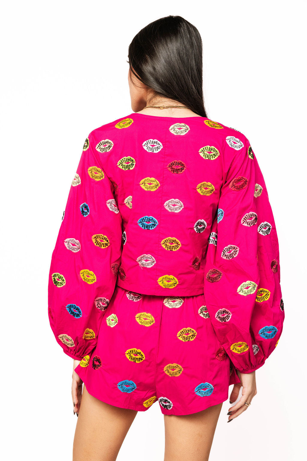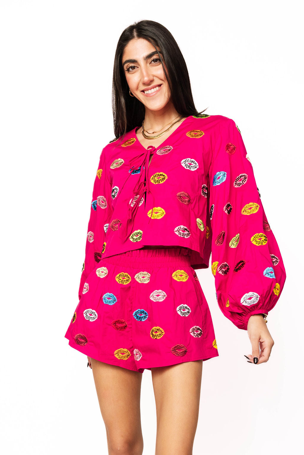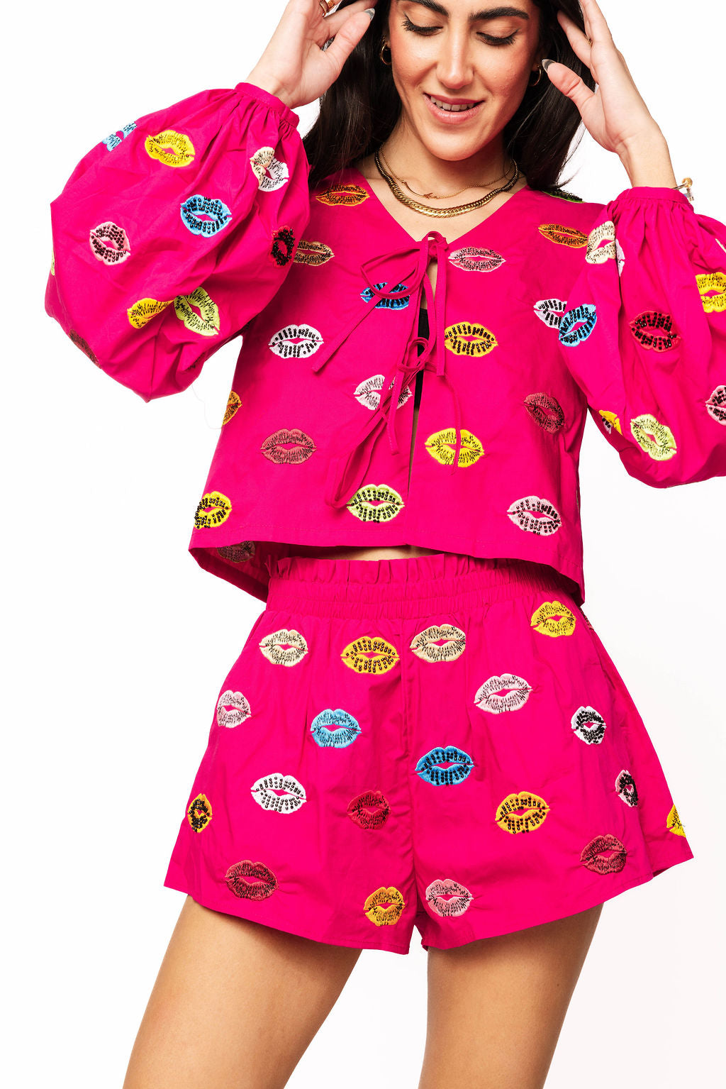 Sample Hot Pink Multi Lip Kiss Cotton Tie Up Long Sleeve Top and Short Set