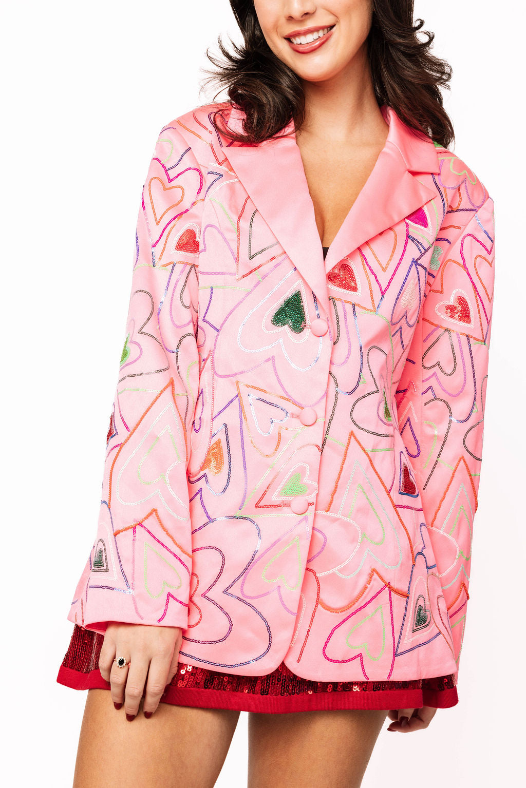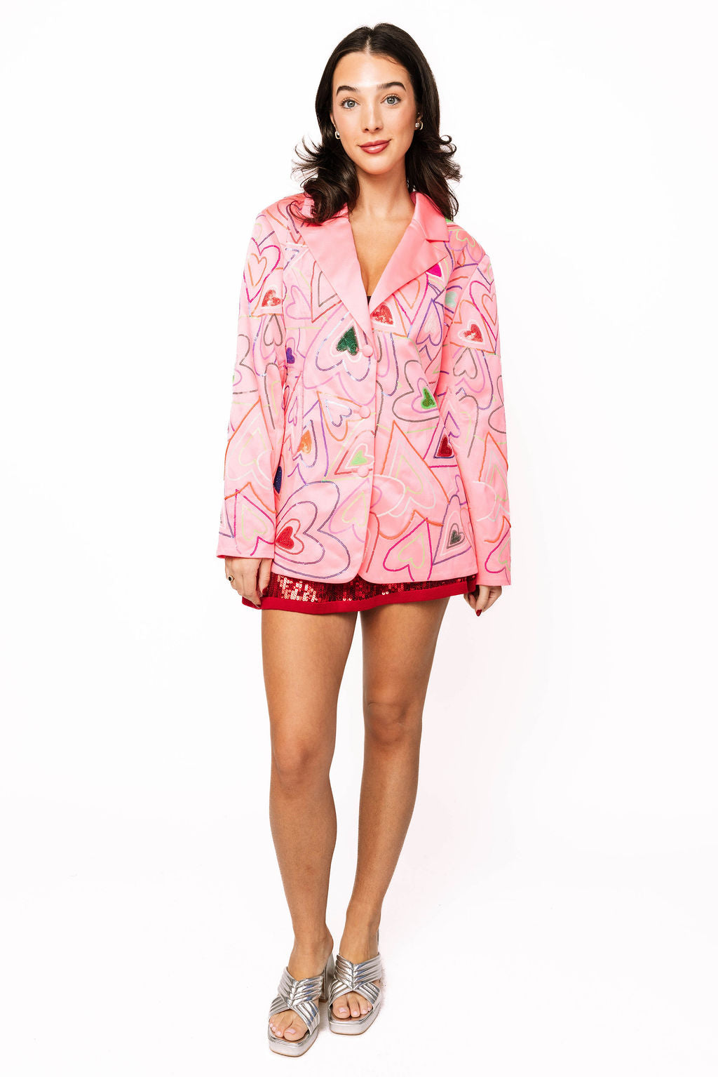 Get groovy in this Neon Pink Multi Groovy Heart Blazer—a vibrant statement piece that radiates retro-cool energy. Covered in whimsical groovy hearts, this blazer brings nostalgic flair with a modern edge. The electric neon pink demands attention and pairs beautifully with neutral basics or bold complementary colors. Throw it on to elevate your everyday look or make it the centerpiece of your outfit. Perfect for anyone ready to embrace their fun, fearless side and spread good vibes wherever they go.