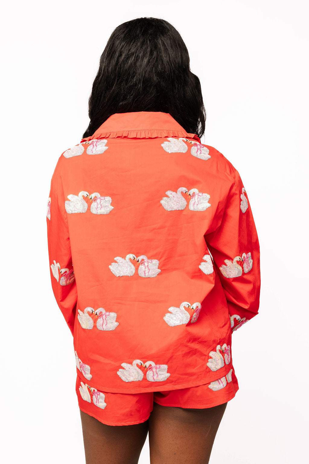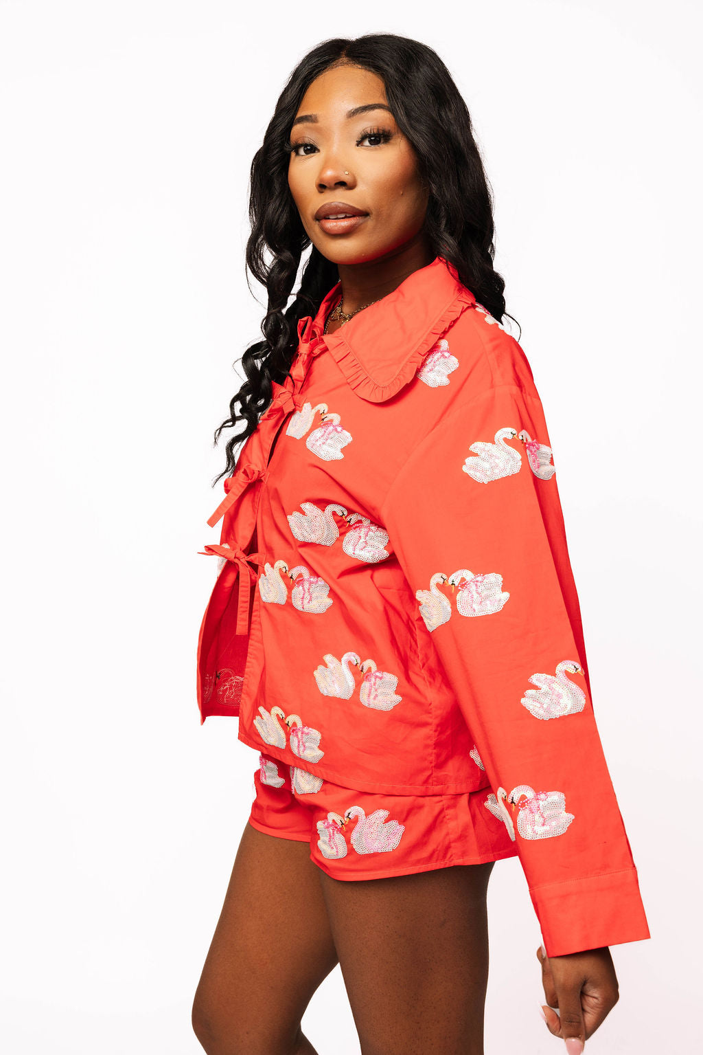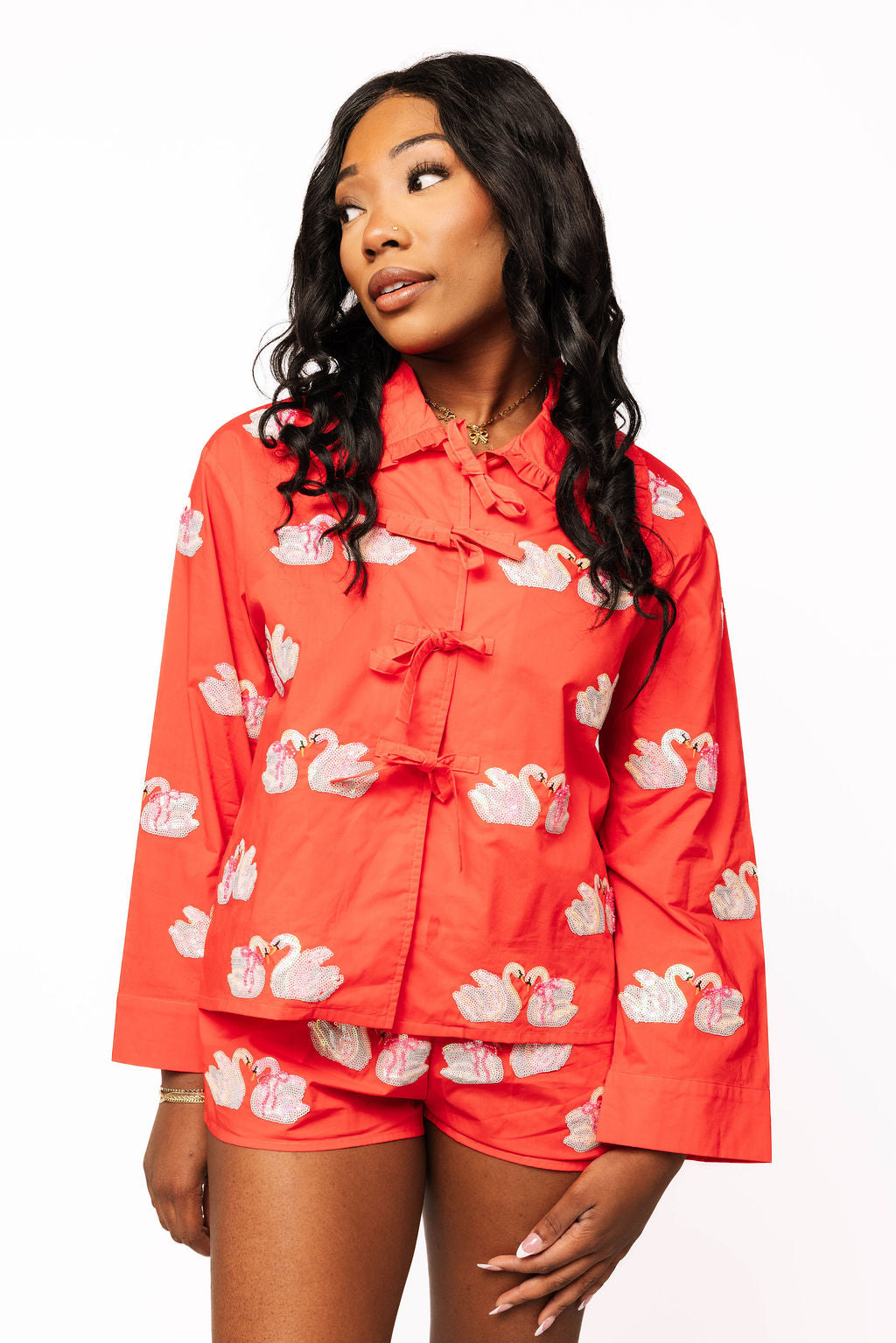 Dive into whimsy with this charming red cotton set featuring an adorable swan design. The tie-up collar adds a flirty touch to the long-sleeve top, while the coordinating shorts keep things breezy and fun. Crafted from soft, breathable cotton, this playful two-piece is perfect for making a splash at casual outings or cozy days at home. Sweet, spirited, and totally Instagram-worthy.