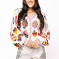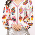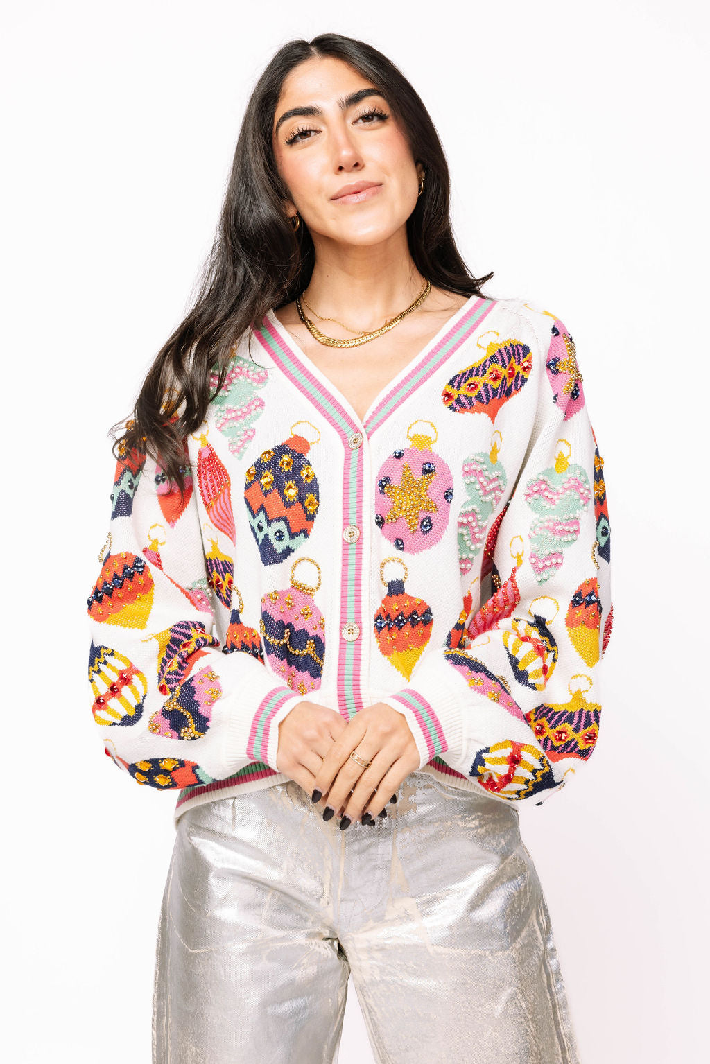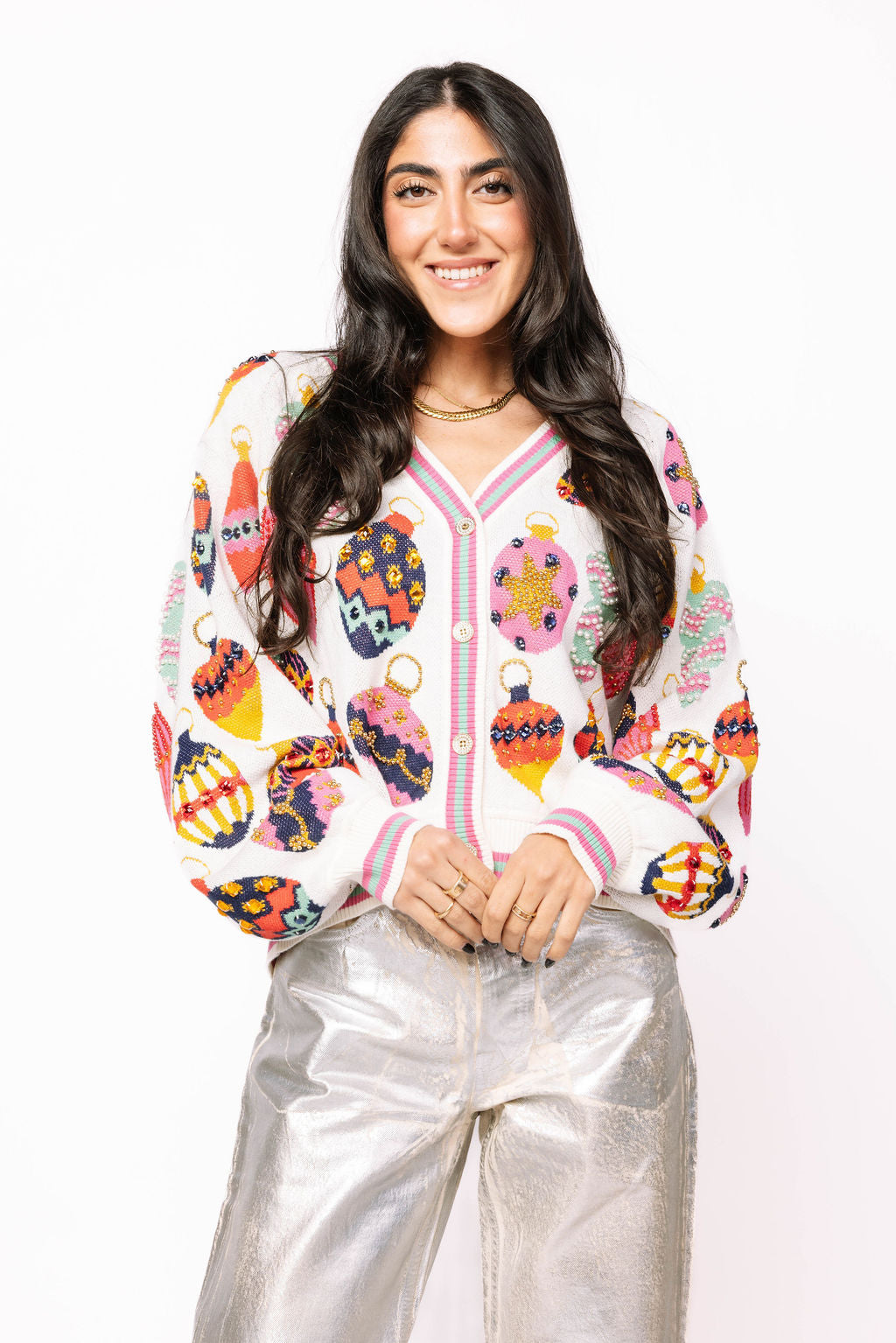 Add a splash of fun to your holiday wardrobe with this playful beige cardigan, adorned with vibrant, colorful ornaments on both front and back. Cozy and stylish, it’s perfect for brightening up any outfit while keeping you comfortably warm.