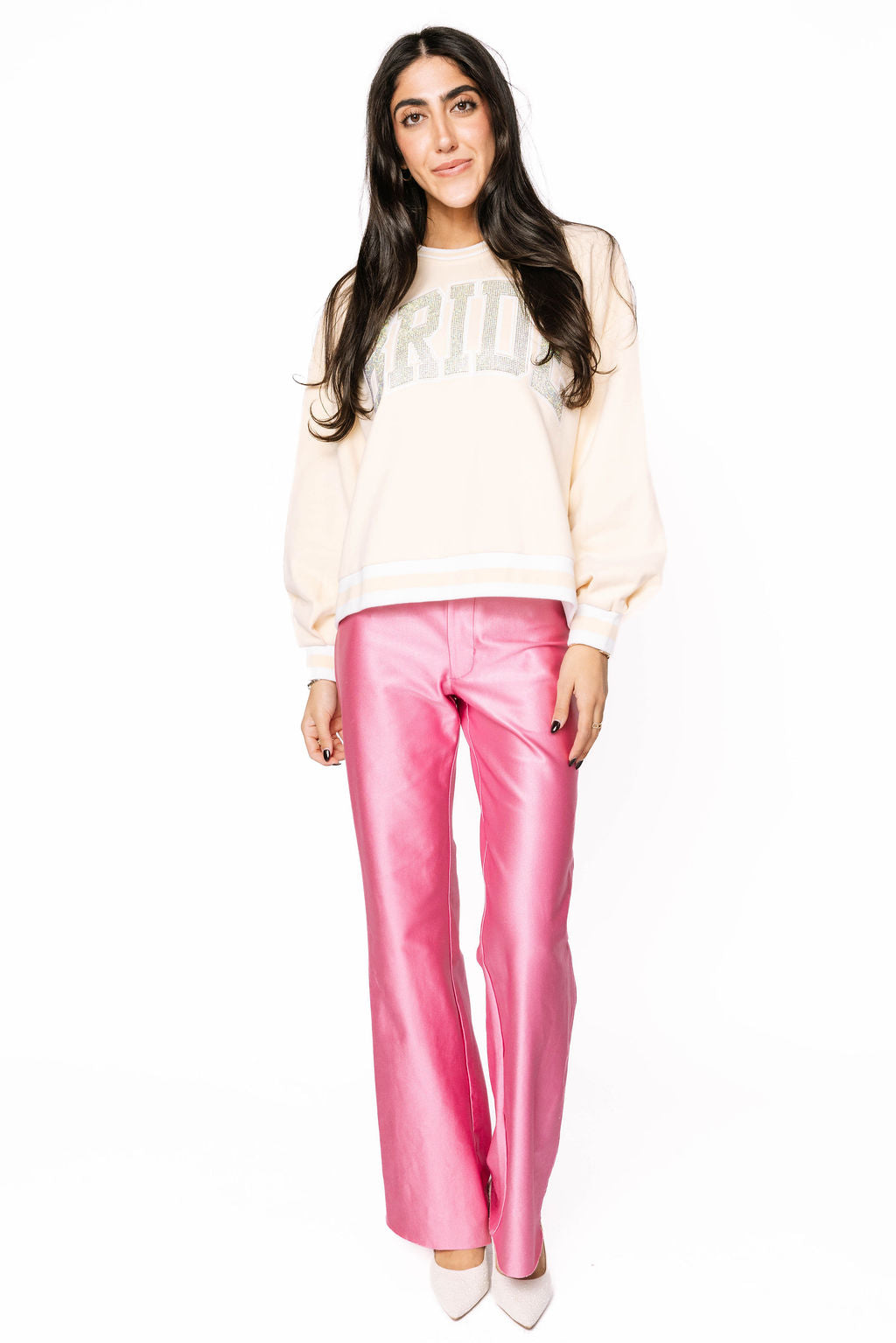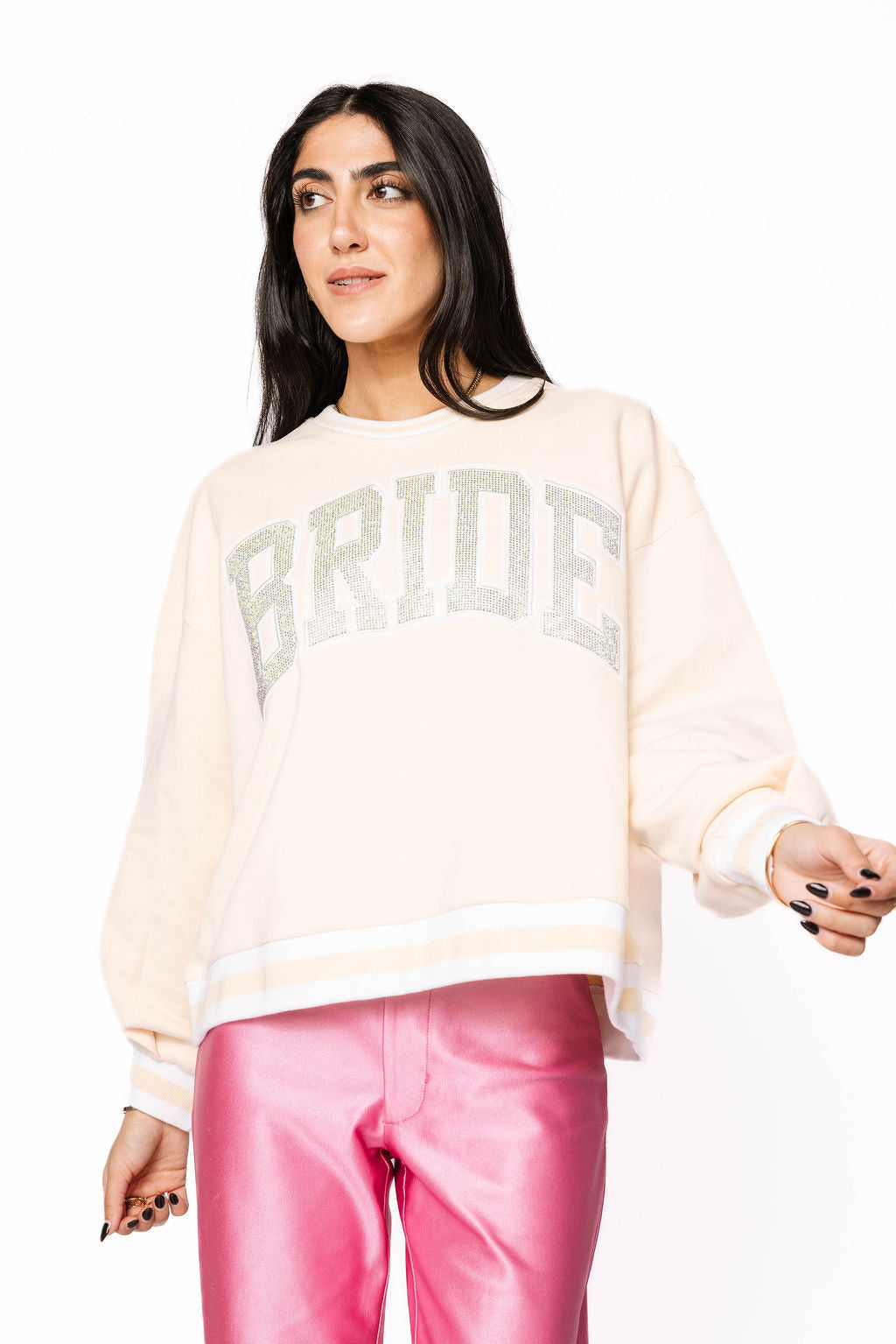 Sparkle into your big day with this cozy beige sweatshirt featuring crisp white trim and a dazzling rhinestone "bride" statement across the chest. Perfect for bachelorette parties, engagement celebrations, or just feeling like royalty before the walk down the aisle. Comfortable enough for all-day wear, glamorous enough to steal the spotlight. Get ready to shine!